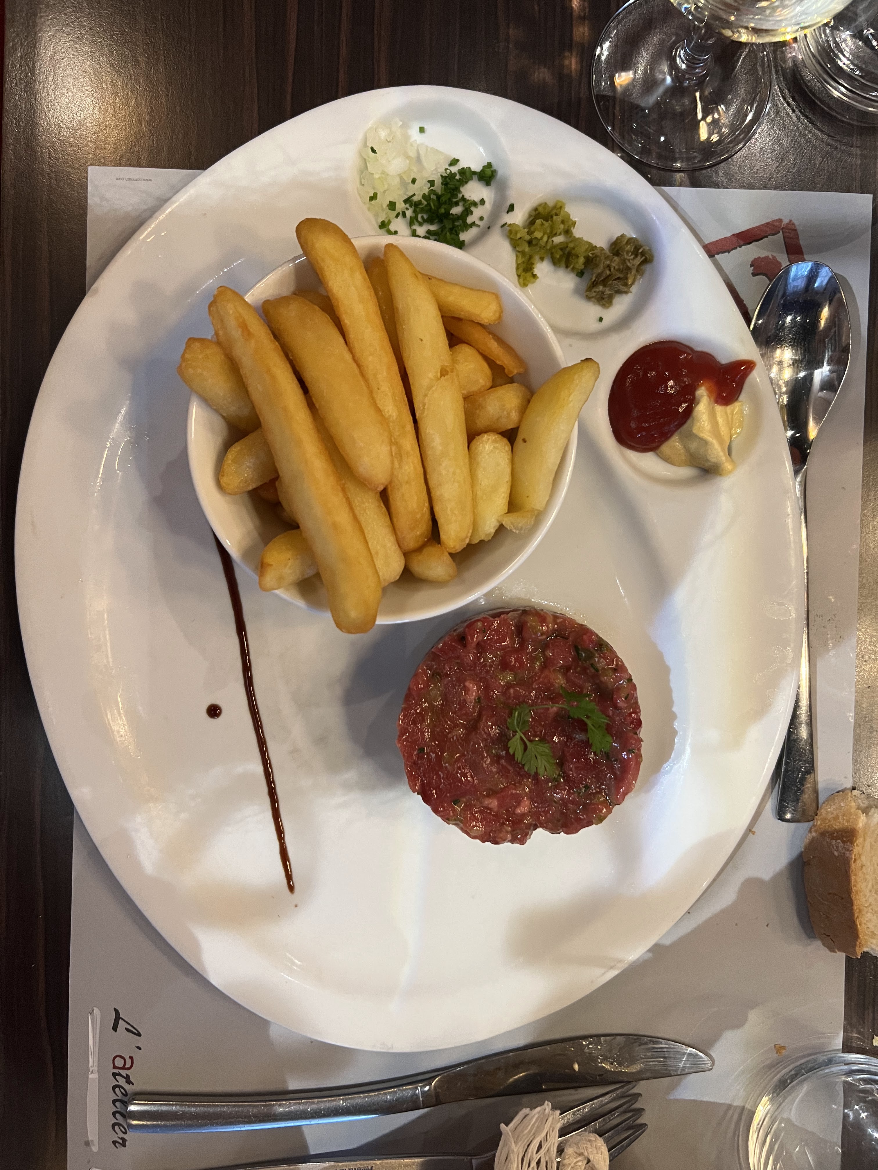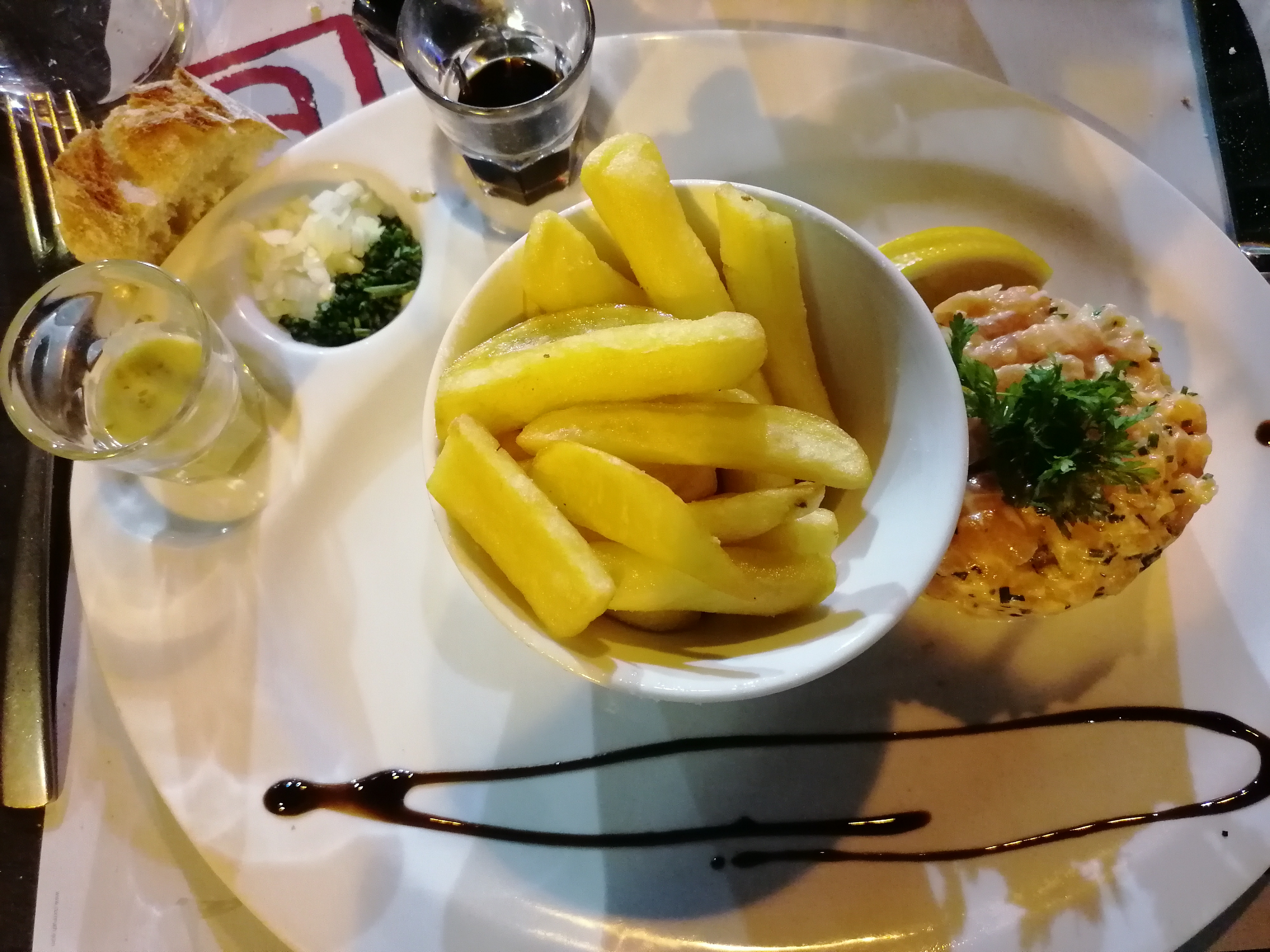 Le choix des plats est satisfaisant, le patron agréable et le service rapide. C'est bon (mention spéciale pour les condiments au choix avec le tartare de saumon et les desserts) et la présentation des plats est sympa. Néanmoins, le prix nous a semblé un peu trop élevé, notamment au vu des quantités. Nous aurions également apprécié des frites maison pour un menu à 35 ou 40 euros avec les supplements.