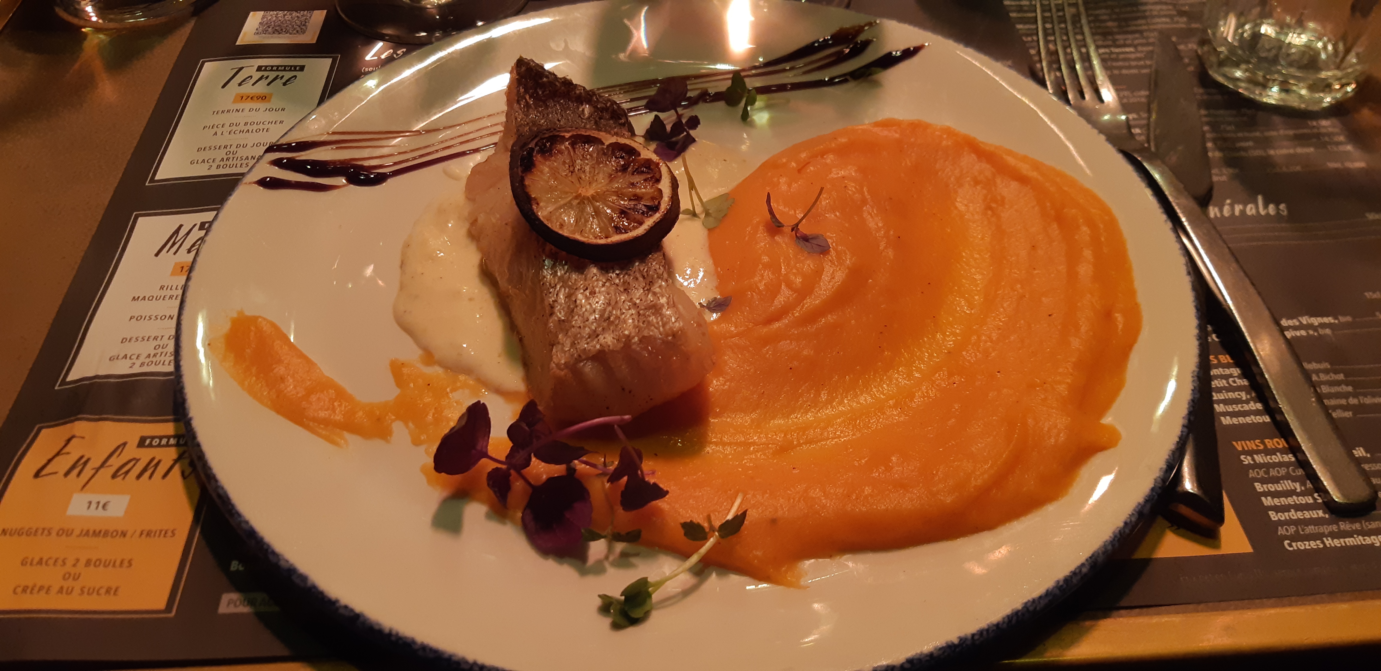 On a passé un excellent moment, très bon produits, très bon plats, très bon desserts ! Menu (entrée plat désert) : 21€ -> On recommande !! Un service impeccable et personnel agréable 🙏 et avec le sourire (je pense qu’ils s’y sentent bien) Beau cadre 👌