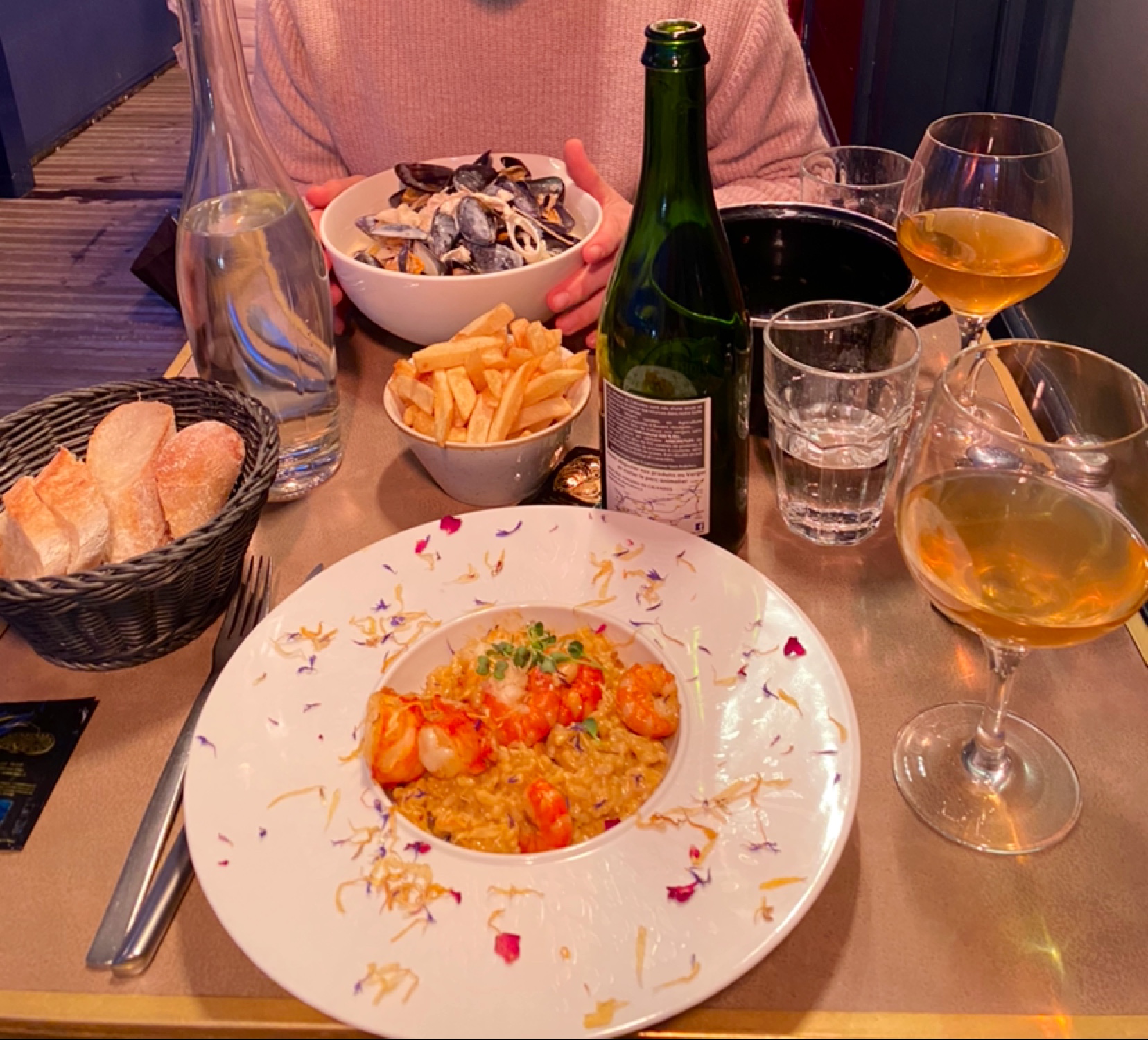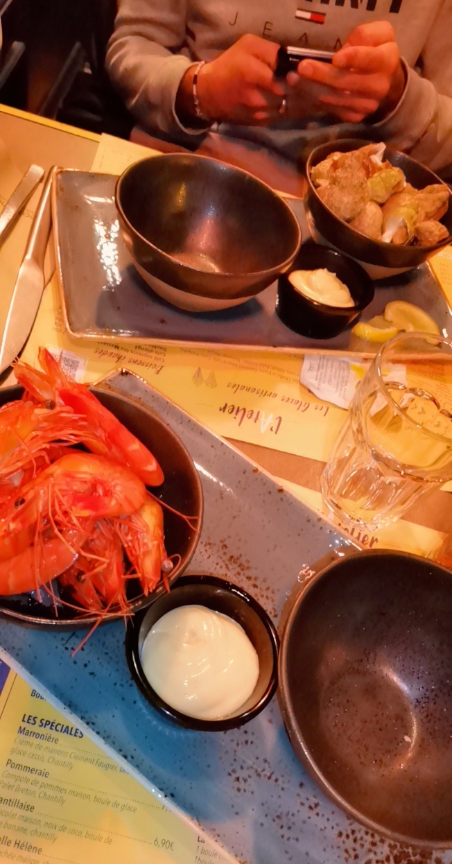 Le service était rapide et expéditif, et nous avons l'impression d'être pressés de quitter les lieux. Les plats n'ont fait qu'aggraver notre impression négative. Les moules étaient petites, sans saveur et mal accompagnées. Le plat de crevettes, quant à lui, était extrêmement peu garni, avec à peine quelques crevettes pour un prix exorbitant. Pour ne rien arranger, les prix étaient globalement élevés, surtout pour la qualité médiocre des plats. La carafe de vin blanc, piquette à 18€. Crêpes desserts correctes. En résumé, nous avons été très déçus par ce restaurant et nous n'y retournerons certainement pas. Je le déconseille vivement à tous ceux qui recherchent une expérience culinaire de qualité et veulent prendre le temps de vivre.