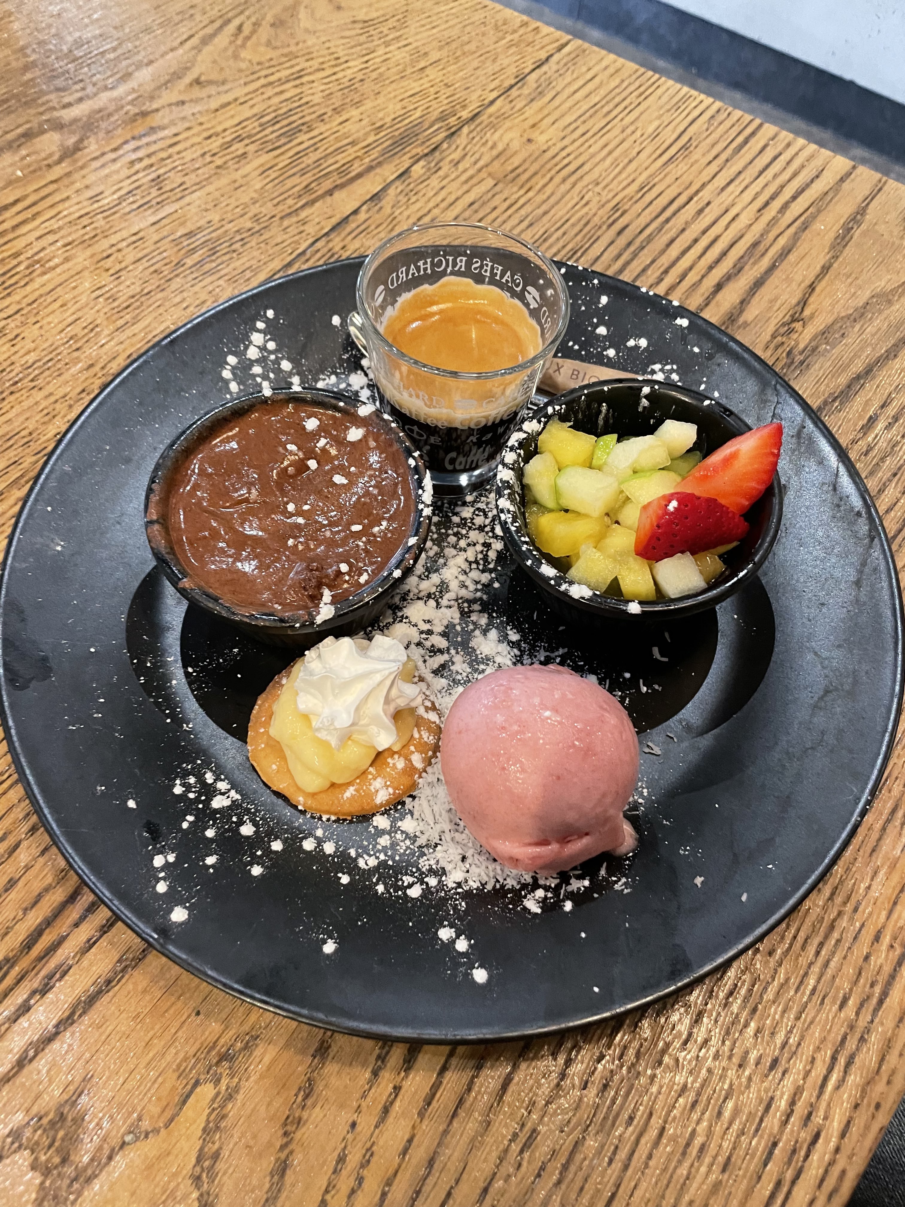 Nous avons pris 2 planches à partager accompagnée de sa petite salade le verre de vin blanc avec tous etais très bon je recommande et le dessert le bol poire ,coulis ,chantilly allez y et goûter sa vos le coup merci