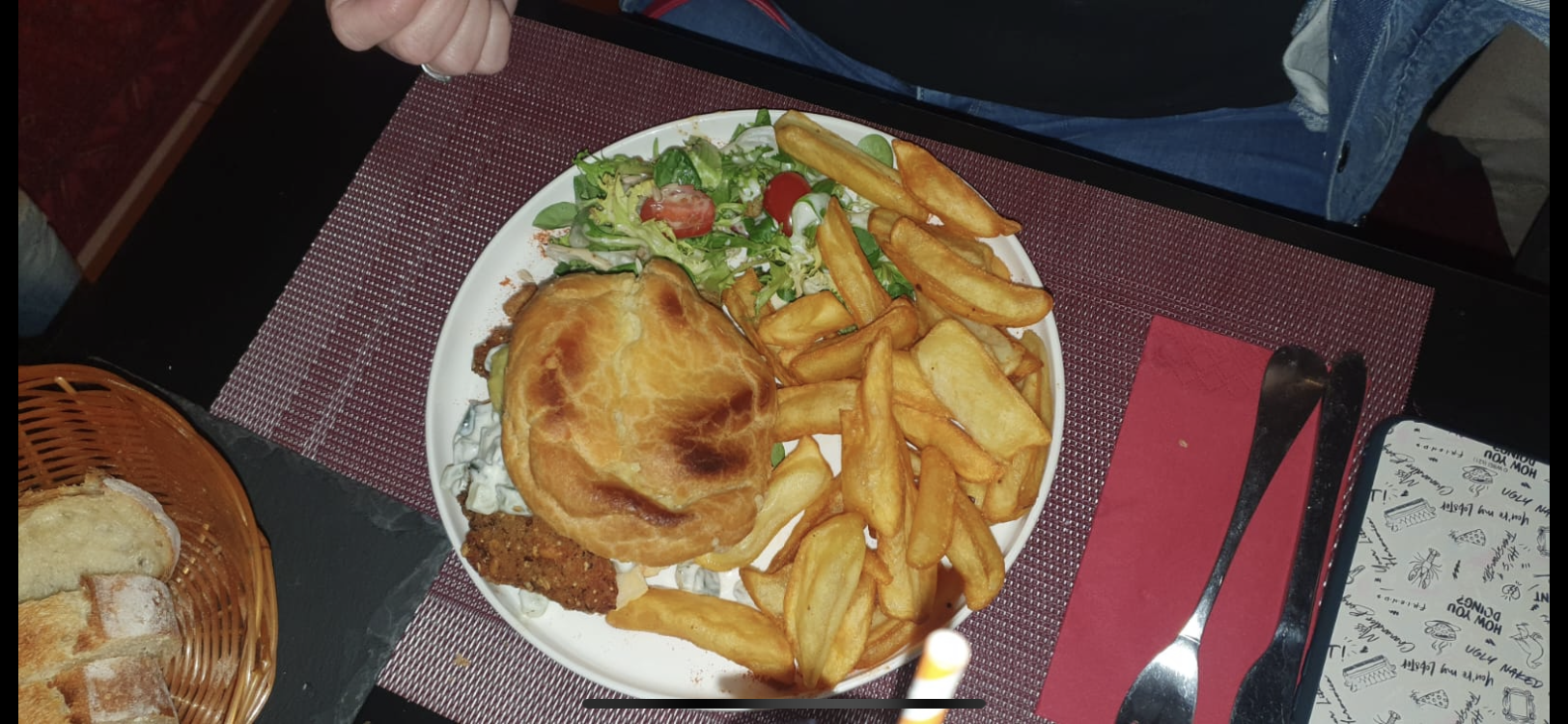 Restaurant recommandé par les propriétaires du gîte que nous louons, un grand choix de menus, pain du Burger fait maison, repas copieux, excellente viande, émincé de poulet sauce aux champignons un vrai délice...le mi cuit au caramel qui a fait briller les yeux de ma belle fille, super équipe, petit mot sympa du cuisinier, bonne continuation à vous et merci pour le toutou.