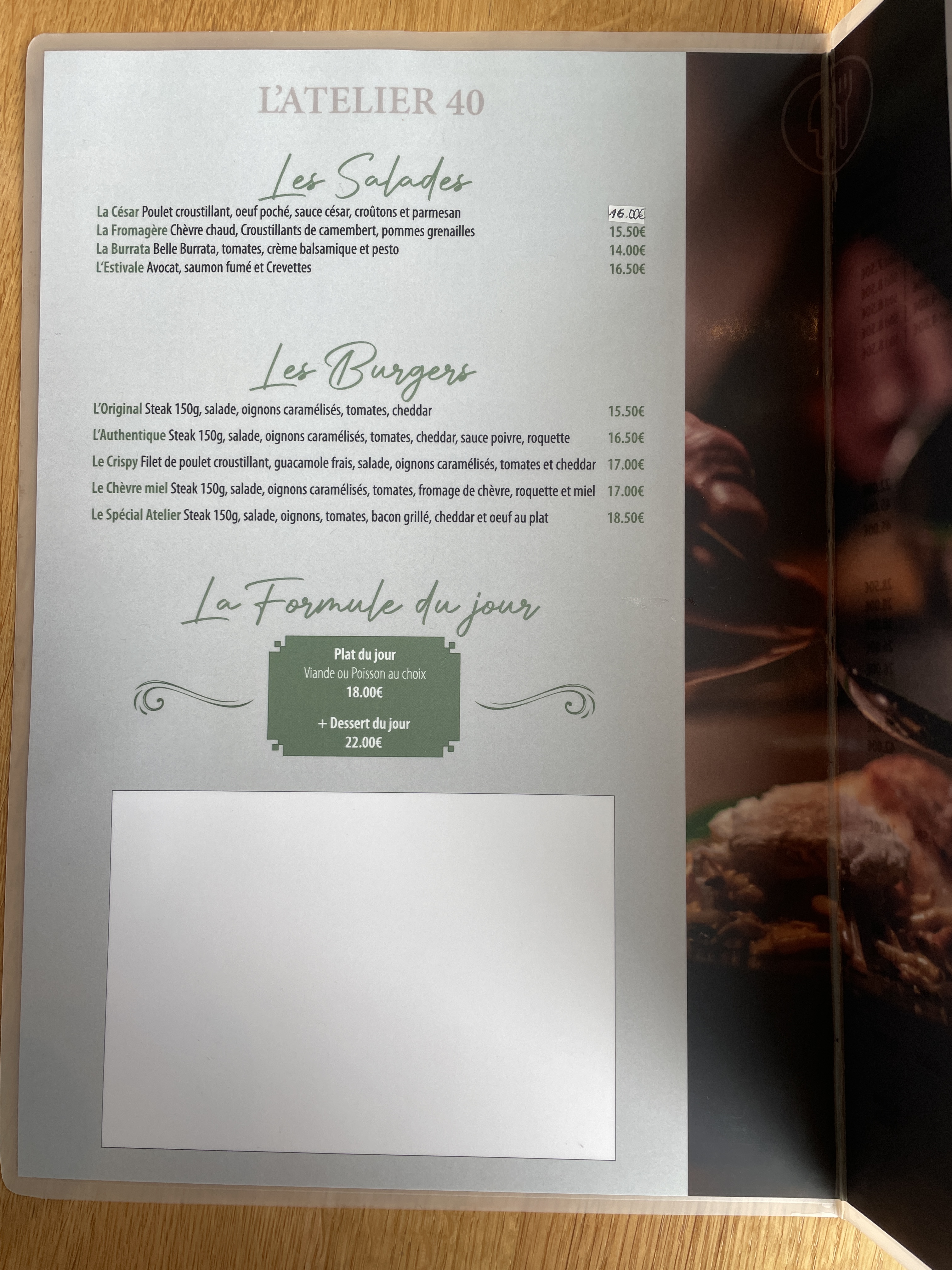 Restaurant convivial et décoration de bon goût. Pour ce qui est de la carte, elle est assez variée, de quoi faire le bonheur de tout le monde, et pour ma part j'ai été agréablement surprise par la qualité du repas et du service de l'Atelier 40. Très bonne adresse pour ceux qui travaillent dans les environs.