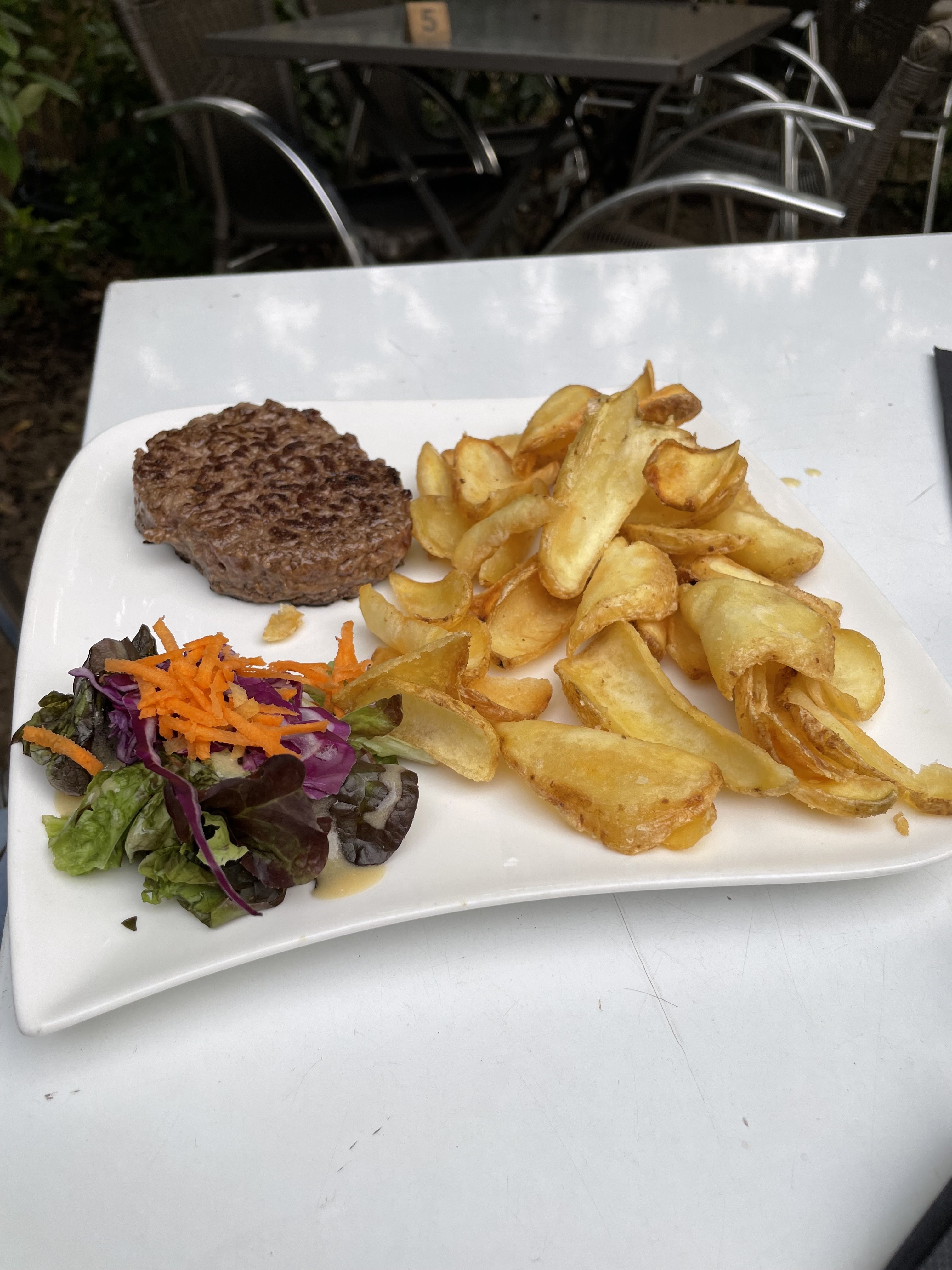 Déçu par le service en terrasse : nous n'avons eu ni eau, ni pain avec la salade, ni demande de boisson pendant le repas. Pour les semblants de frites, aucune sauce : un petit trait d'une sauce inconnue sur l'assiette. Sans burger, pas de sauce pour les frites. Les rares fois où le serveur passait sur la terrasse, il nous ignorait totalement (alors qu'il pleuvait et aucune solution a été proposée/trouvée). Les portions ne sont pas proportionnelles au prix : un petit burger pour un prix de 15€-17€.