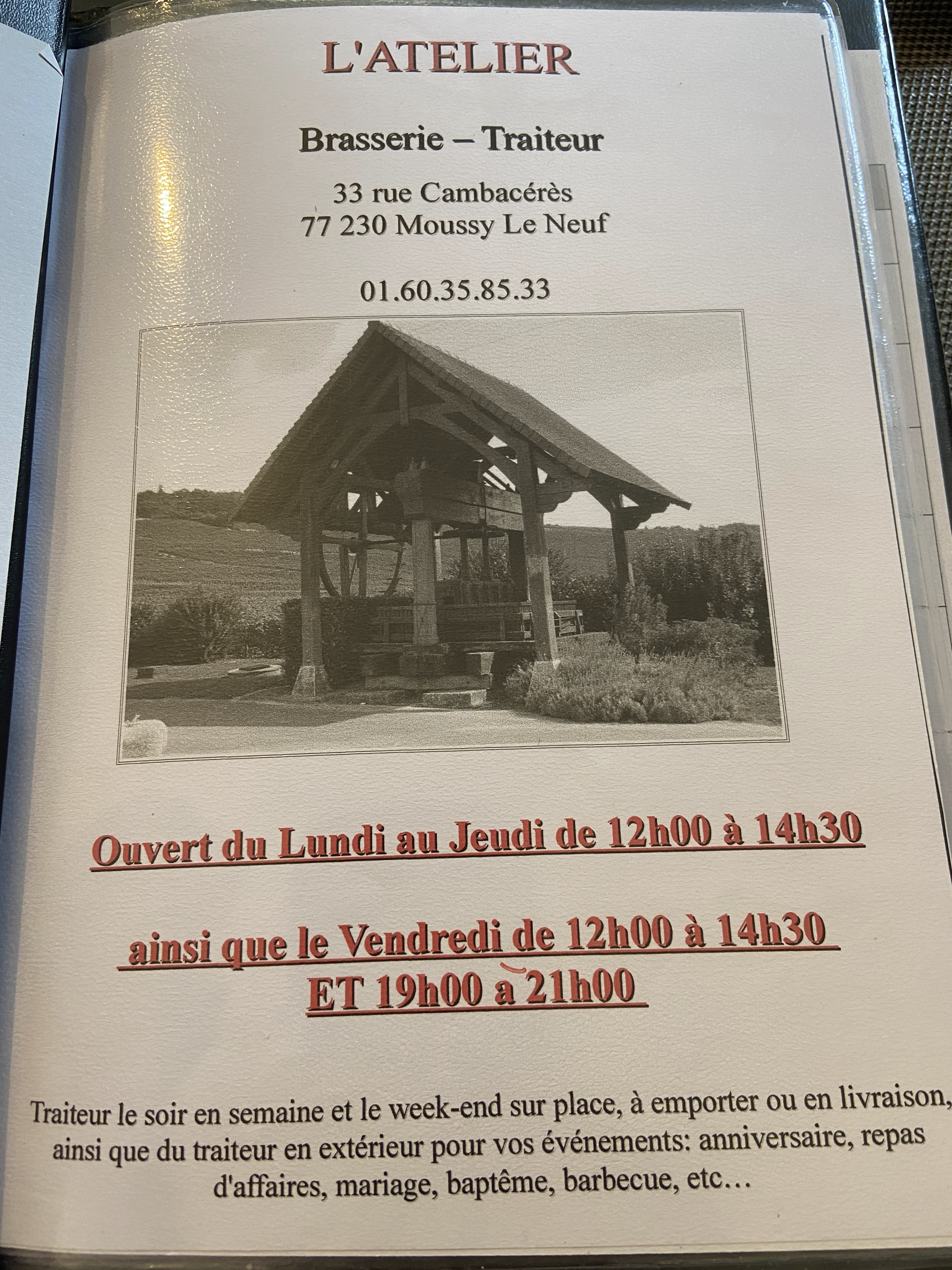 Voici toutes les informations sur le Restaurant L'Atelier Brasserie Traiteur qui ce trouve au 33 Rue Cambacérès, 77230 Moussy-le-Neuf (77). Sur cette fiche vous trouverez les photos, l'adresse, les horaires d'ouverture, le numero de téléphone et les avis clients.Vous pouvez églement rédiger un avis si vous le souhaitez en bas de page.
