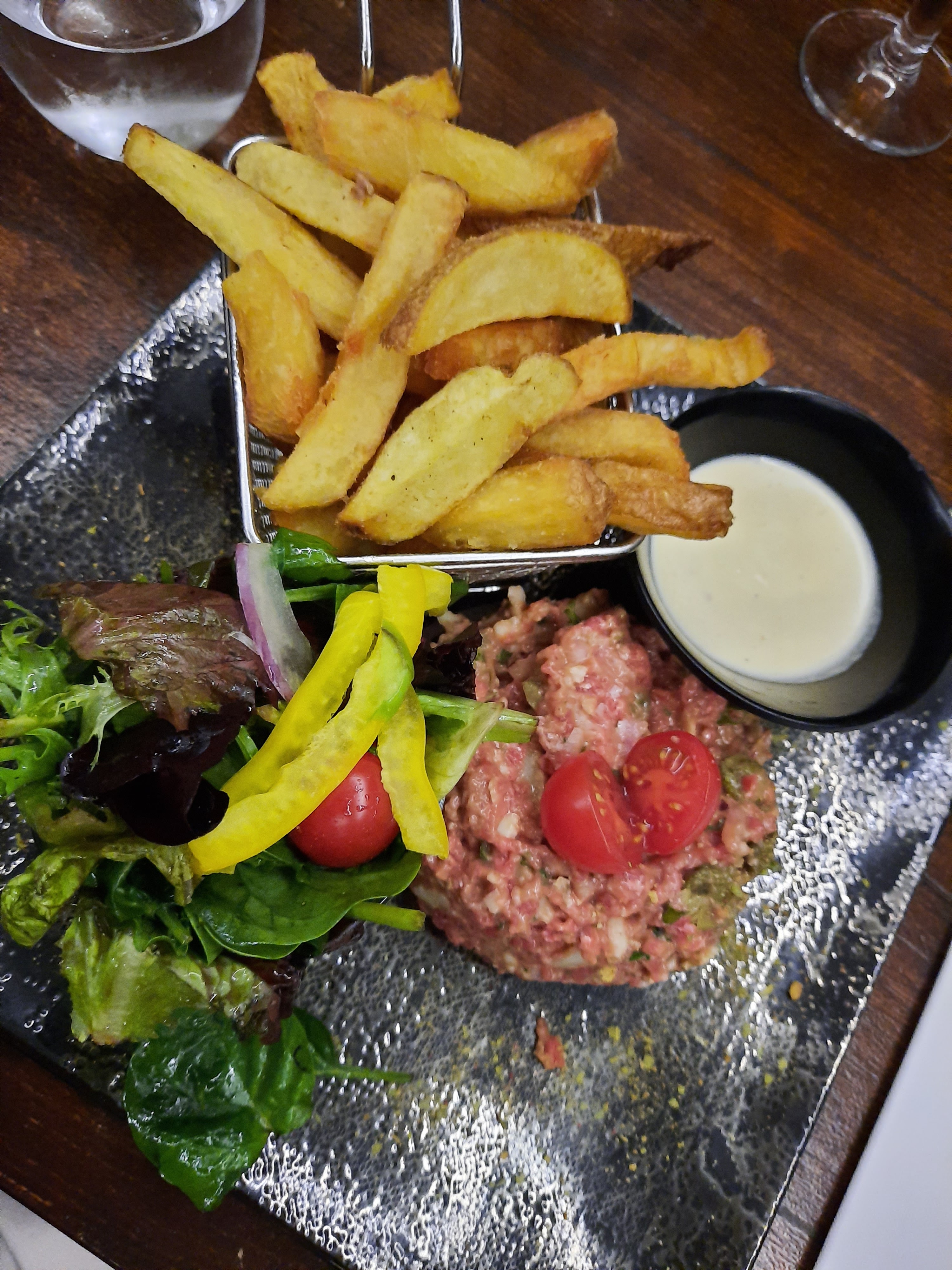 Ma compagne m'a invité dans ce restaurant. C'était la 4ième fois pour elle , 1ère pour moi. L'accueil fut sympathique, le service efficace (malgré la demande de la sauce à part qui fut servie finalement dans l'assiette) , et la cuisine plutôt bonne. Quelques points à améliorer : dommage et bien embêtant de ne pas trouver de savon dans les toilettes ( H comme F ) en tout début de service, et surtout pour ce type d'établissement. Nous faisons encore partie de ces gens qui se lavent les mains avant de manger. Un peu surprenant que le dessert de glaces à 10€ (tout de même) soit servi dans un verre Coca Cola. Quand aux vitres du restaurant, un petit coup de lavage serait le bienvenue je pense :-).