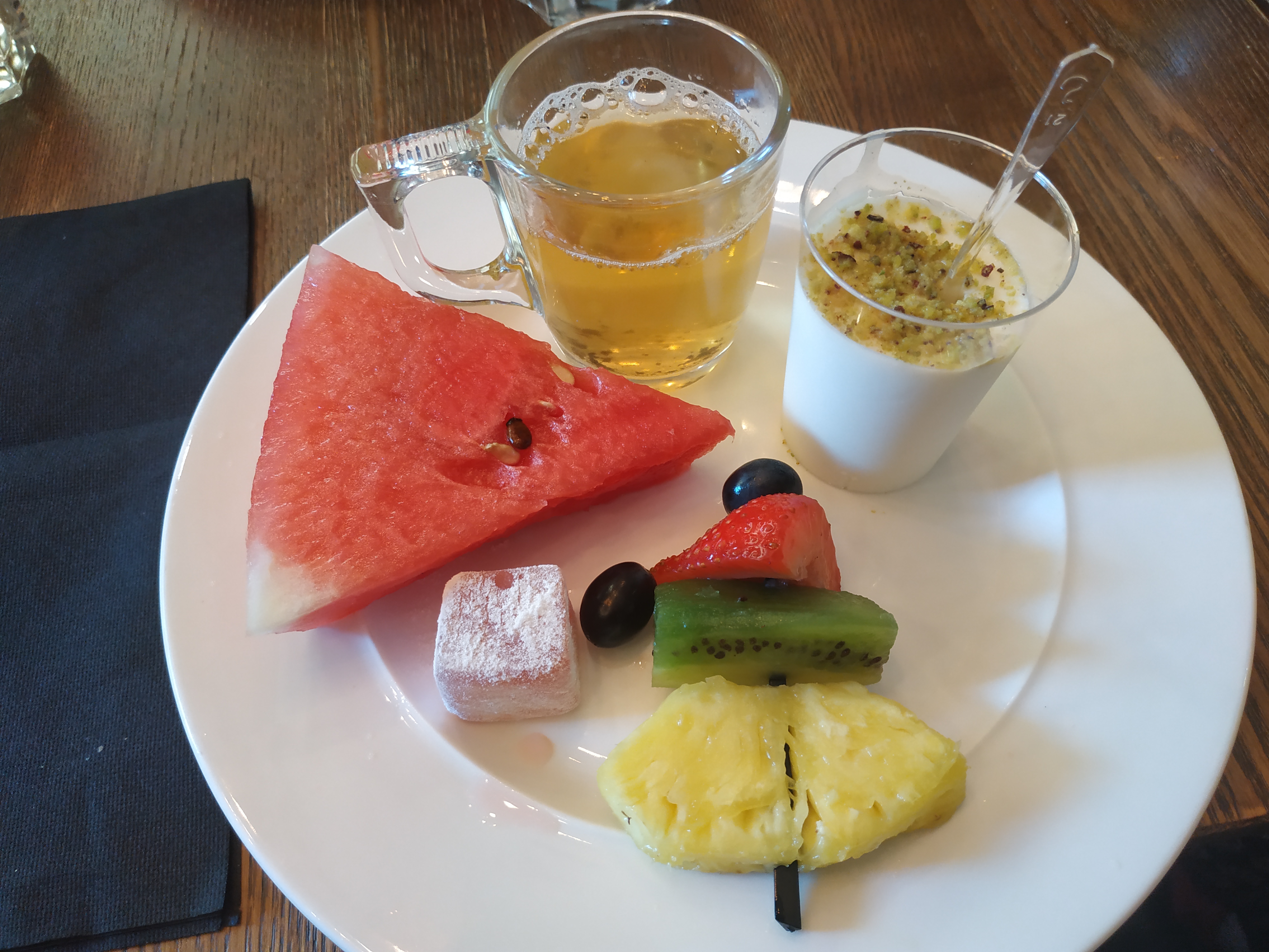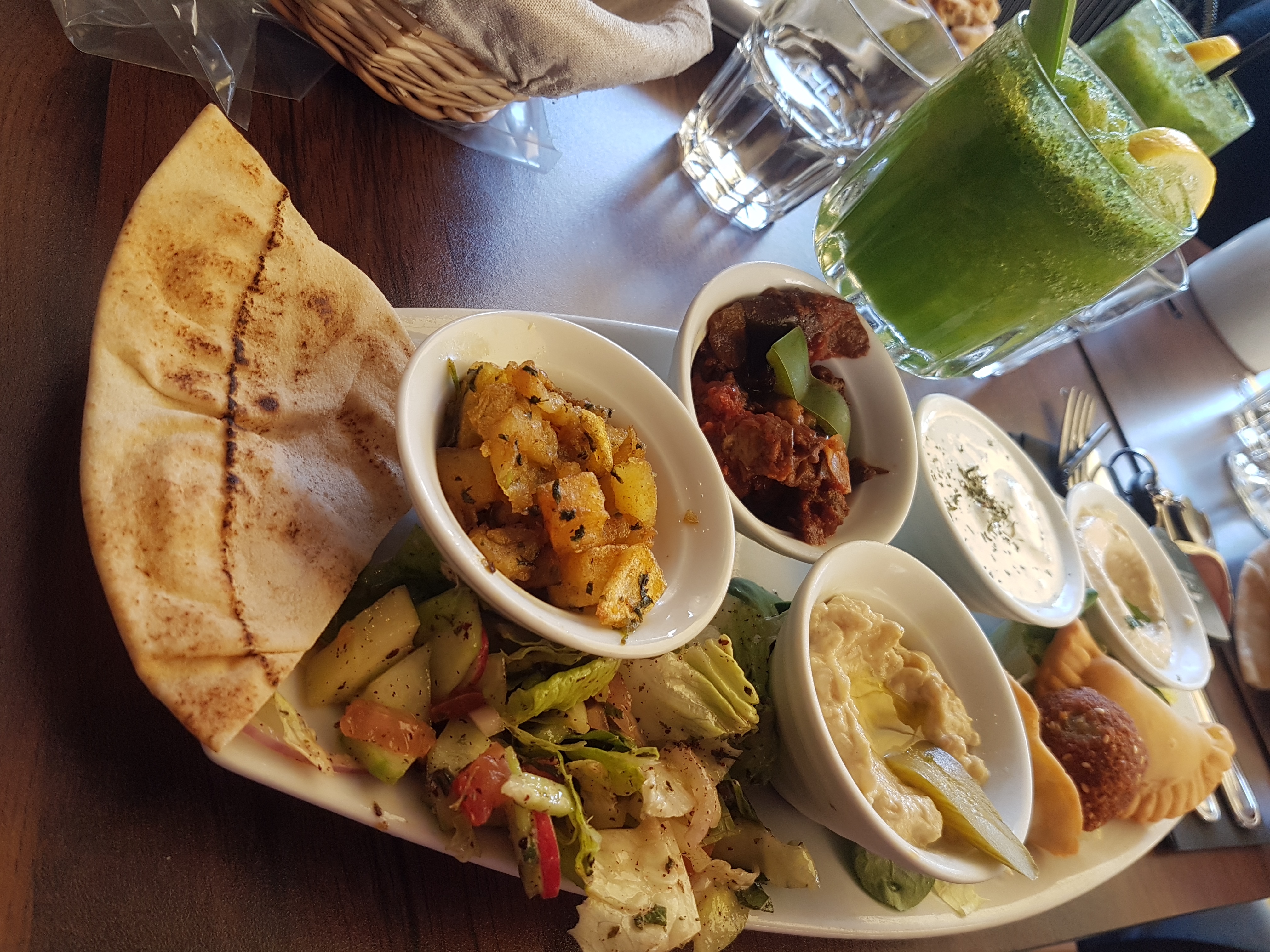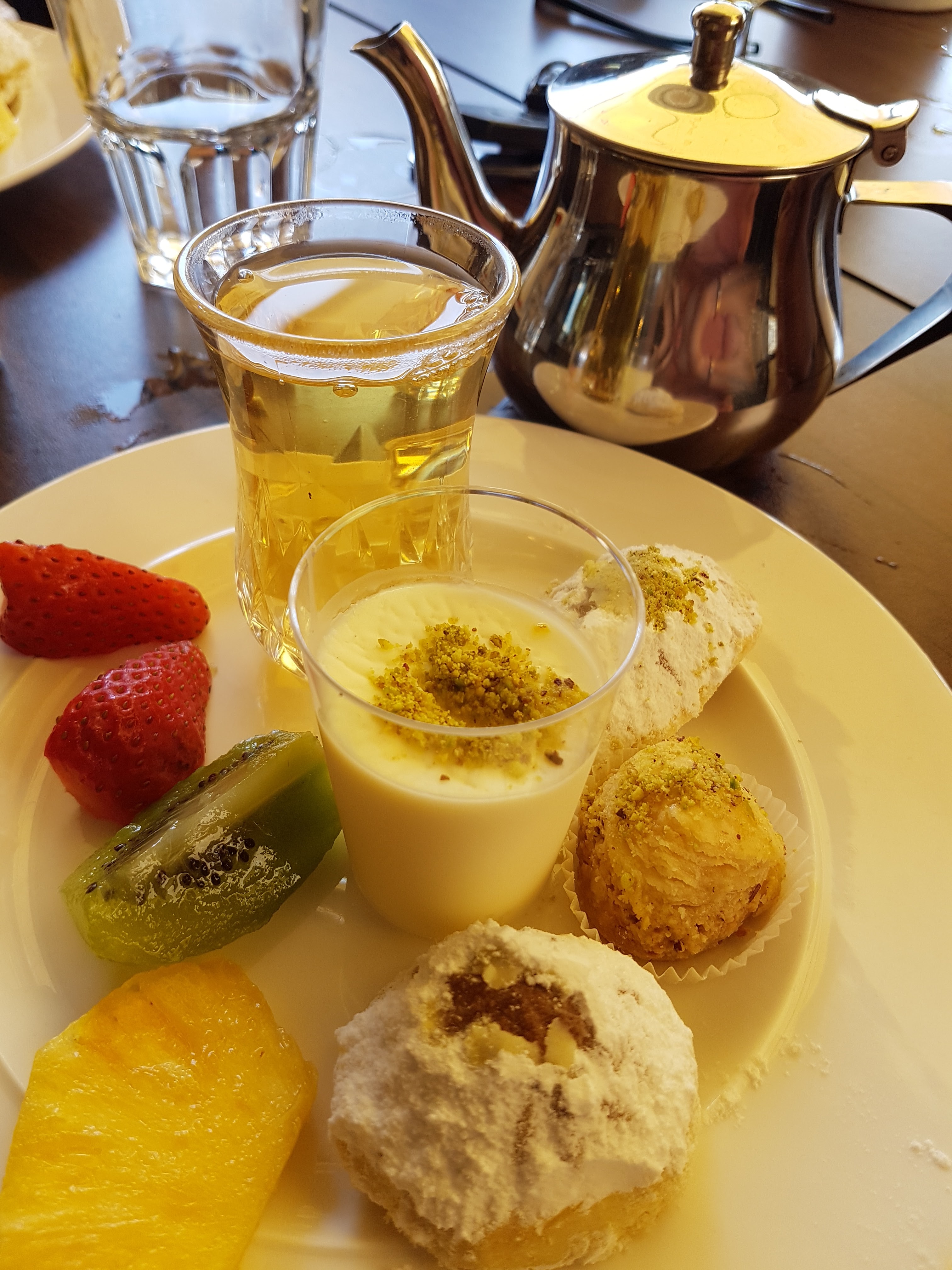 C’était super. Premièrement je vous conseille la fameuse « limonade libanaise » ou « mojito libanais » si on veut ajouter du rhum; il s’agit d’un mélange de limonade jus de citron et menthe fraîche ciselée, c’était tres rafraîchissant. On avons choisi un méli melo de différents plats : pain à l’halloumi grillé tomate et basilic, pain à la viande, petit beignets de fêta ou viande, taboulé libanais, houmous… et en dessert nous avons pris un thé à la menthe traditionnel (beaucoup de menthe et bien sucré) avec les petites crêpes à la crème de lait qui ressemble en goût un peu à de la ricotta; trempées dans des éclats de pistache et arrosées de fleur d’oranger et rose c’était très bon et très peu sucré (mais attention très copieux !). Le service était aussi très sympathique !