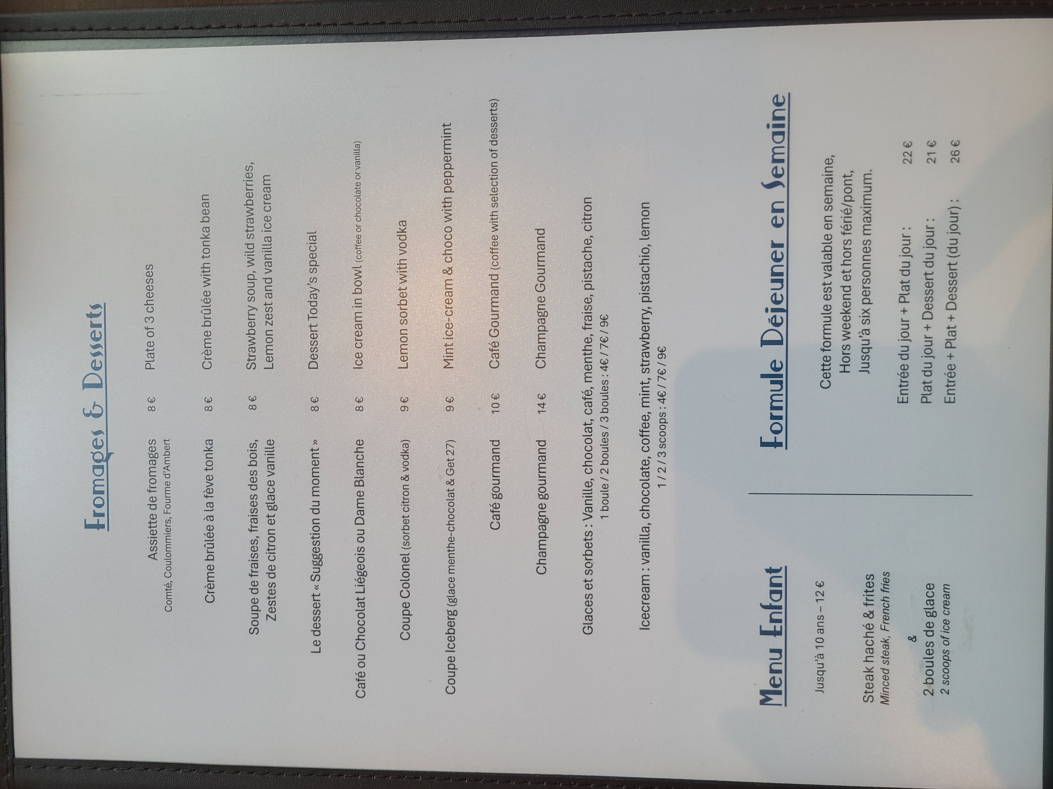 Bon rapport qualité prix. Nous avons payé 161 €. Nous étions 4, chacun avait le menu du jour, 1 bouteille de 🍾 et 2 bouteilles d'eau. 🍾👍