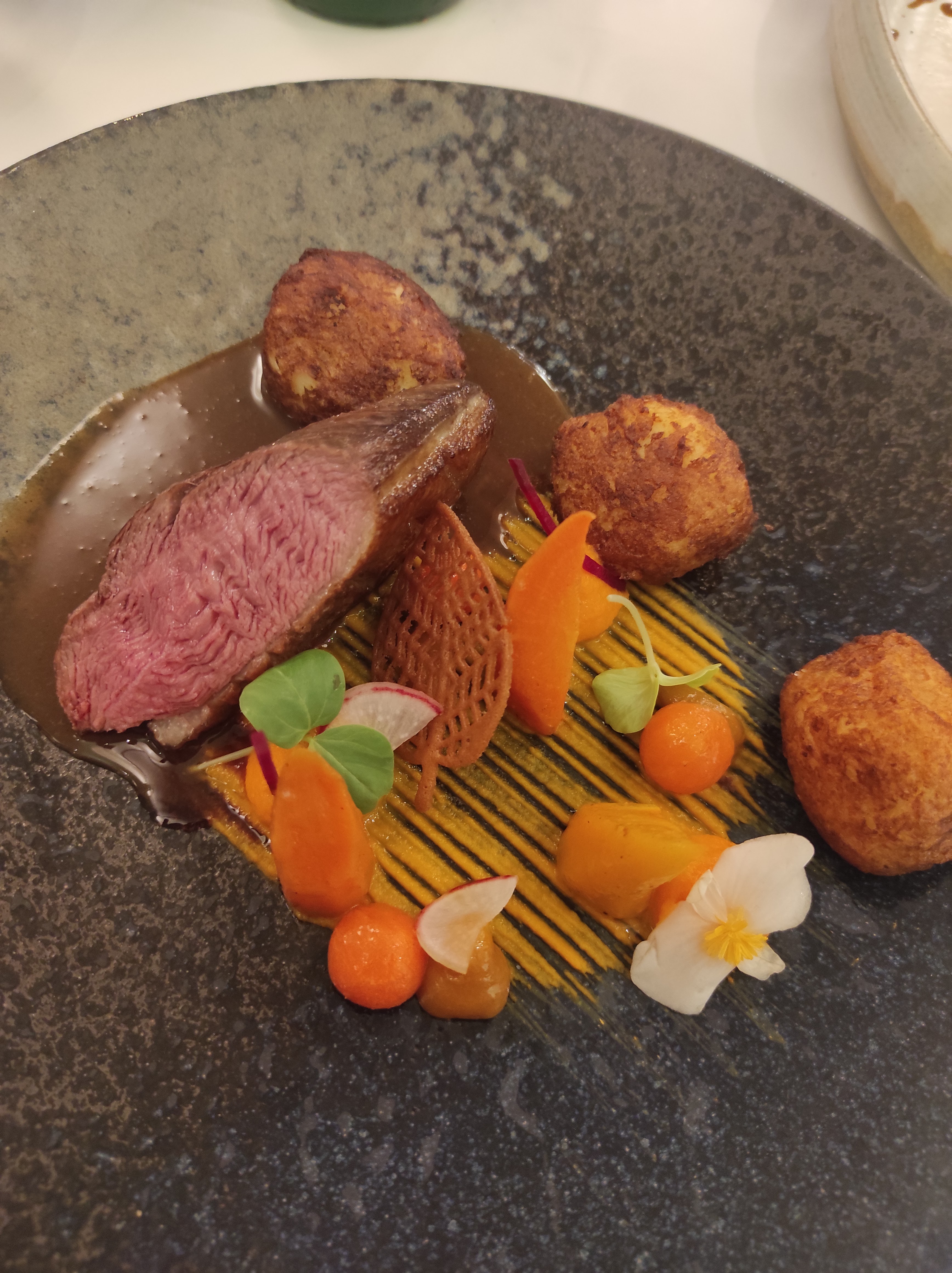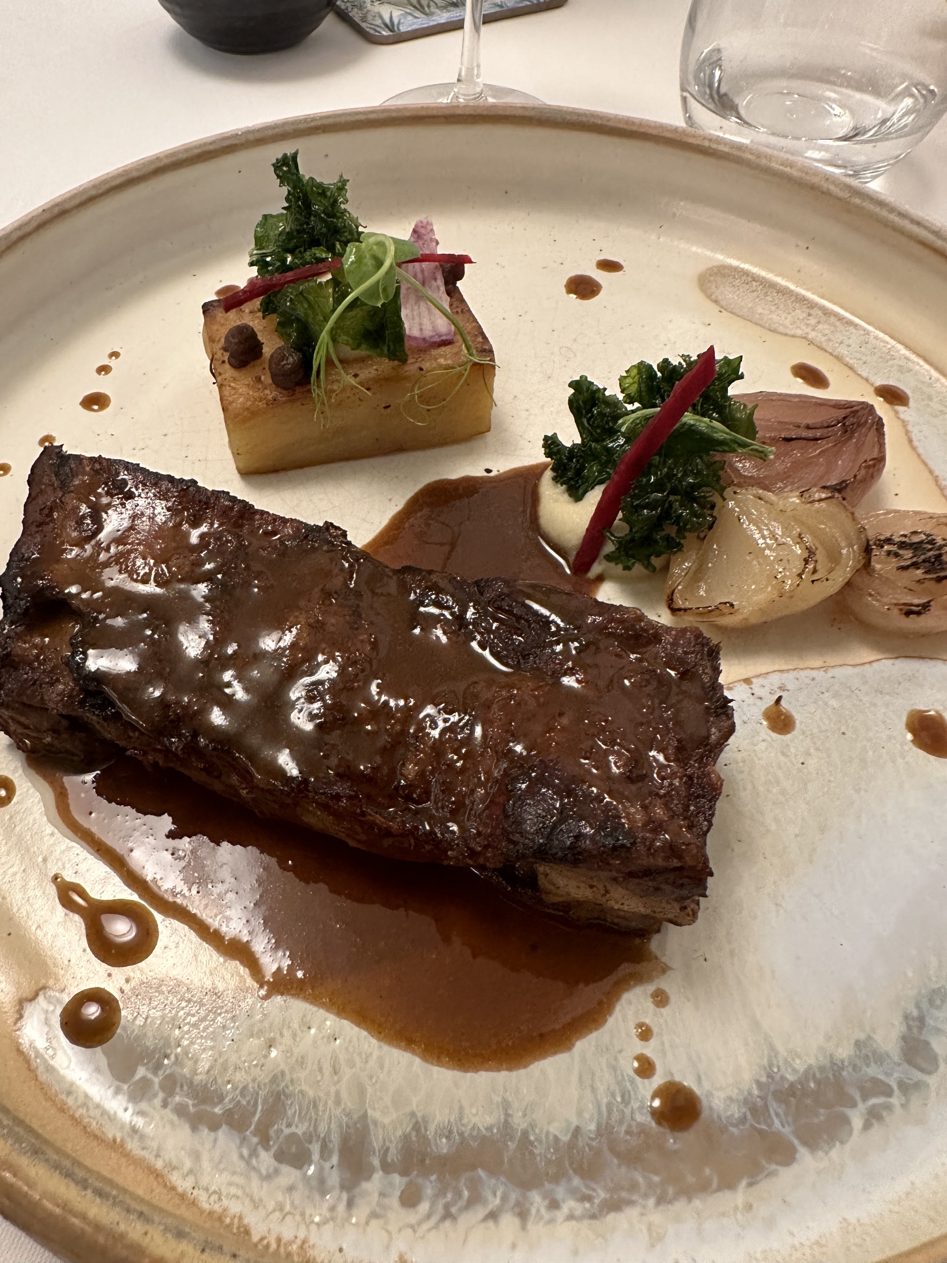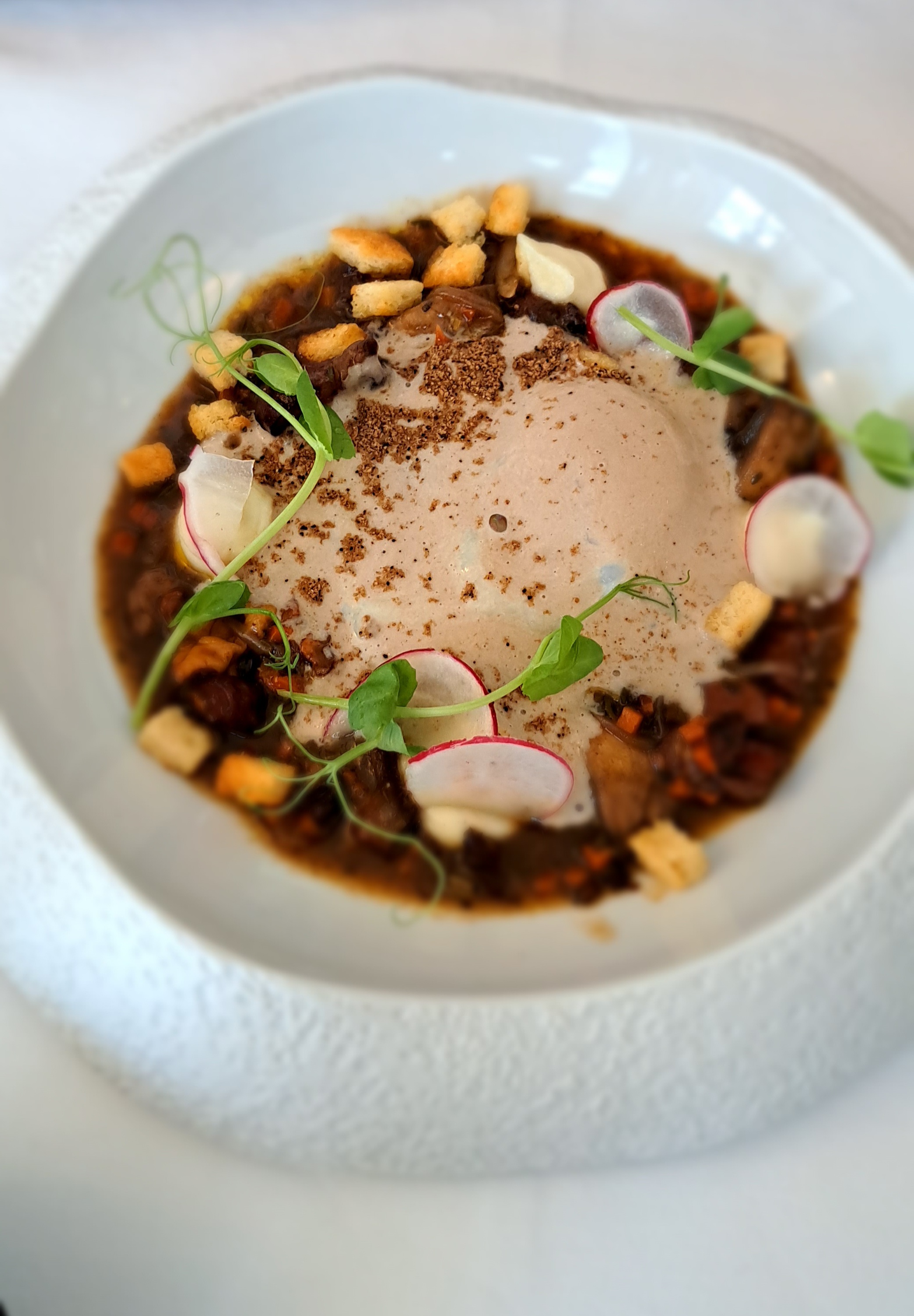 Une entrée simple frais celui des ravioles au radis même si les saveurs ne sont pas Nouvelles la première bouchée fait son effet une viande de boeuf un peux dure qui n'est pas la faute du chef car la cuisson été totalement maîtrisé le petit jardin feuilleté qui se marie bien avec la viande un bon moment avec un service qu'on ne demande ni plus ni moin.