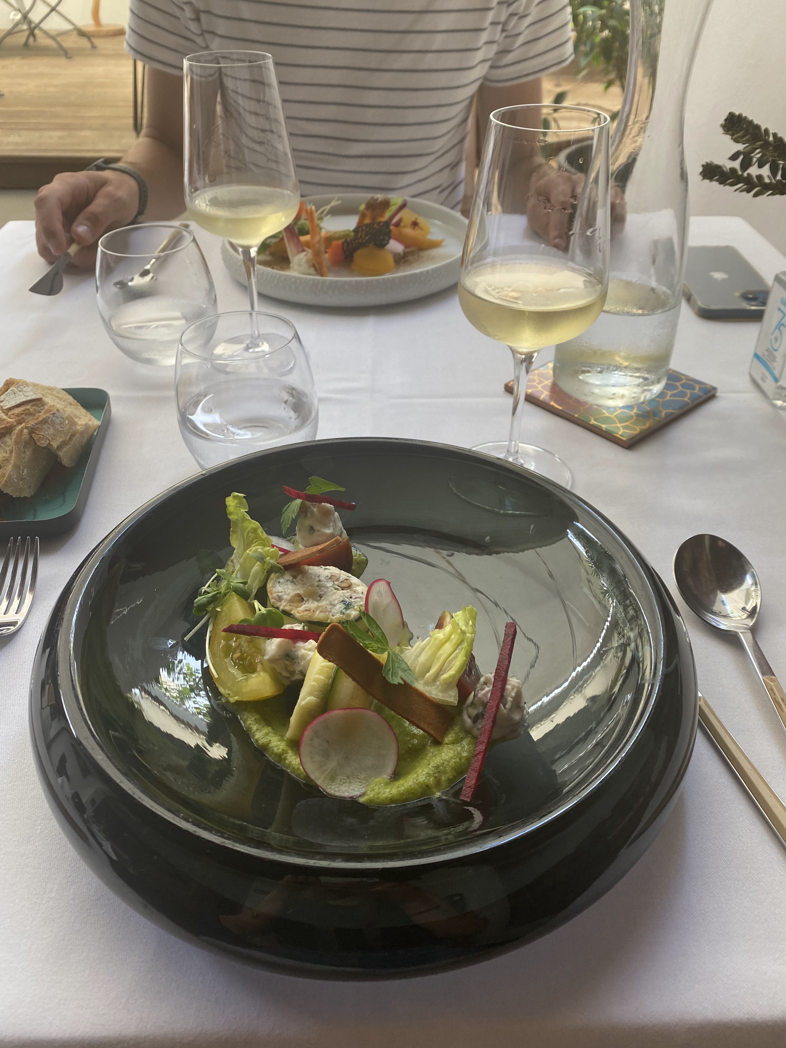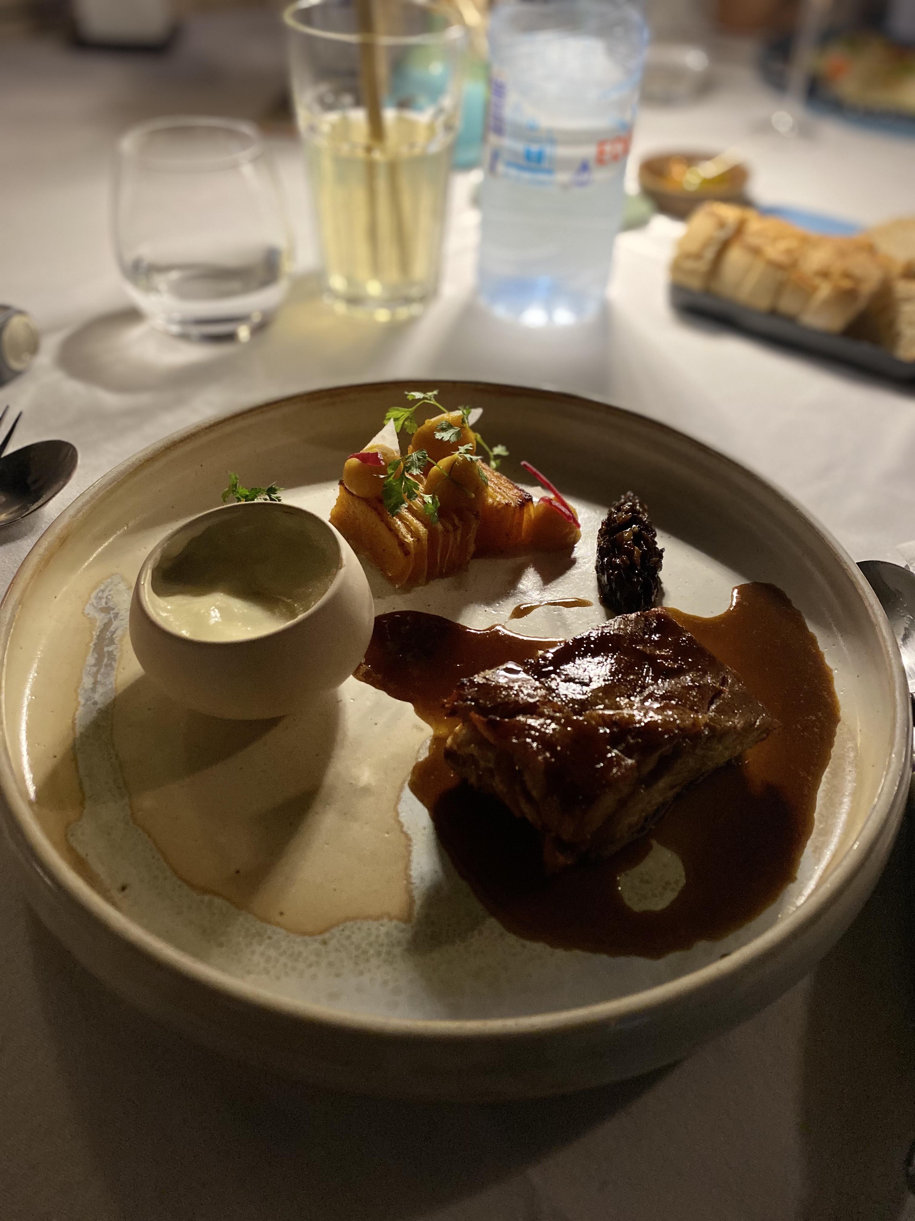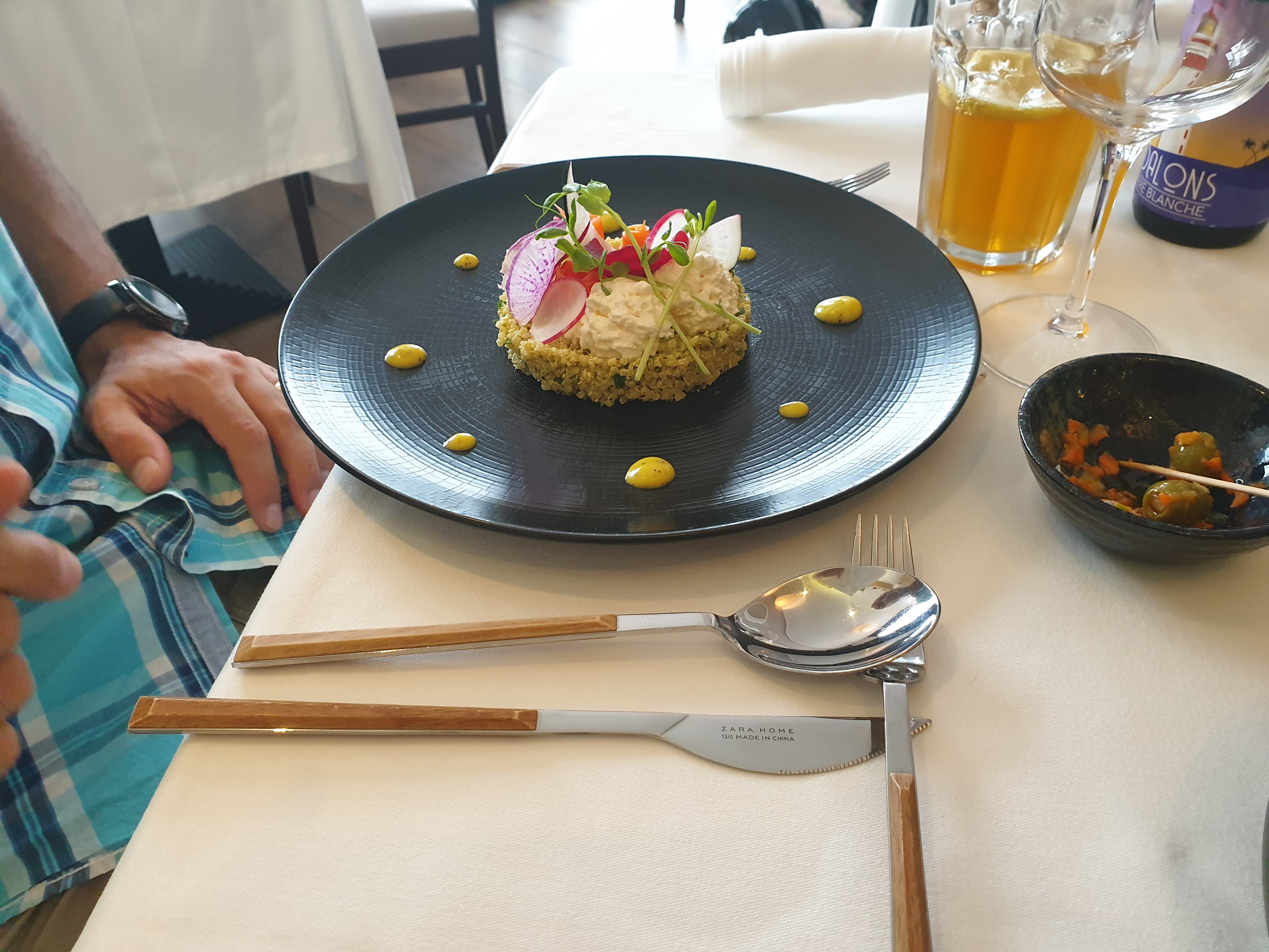 Une entrée simple frais celui des ravioles au radis même si les saveurs ne sont pas Nouvelles la première bouchée fait son effet une viande de boeuf un peux dure qui n'est pas la faute du chef car la cuisson été totalement maîtrisé le petit jardin feuilleté qui se marie bien avec la viande un bon moment avec un service qu'on ne demande ni plus ni moin.