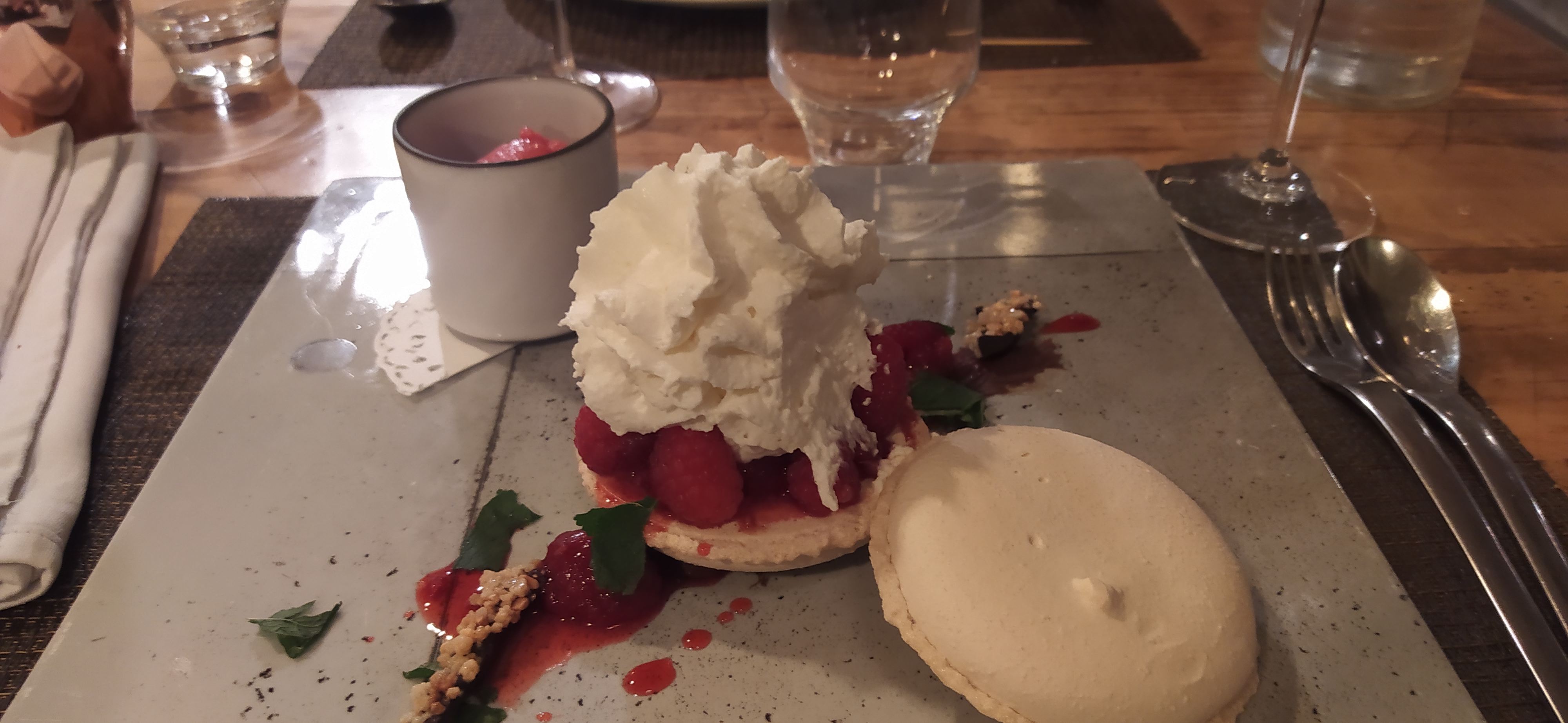 Fabuleux! Légumes et fruits utilisés du propre jardin. Le tiramisu de framboises est spectaculaire avec ses notes de basilic, vanille et menthe