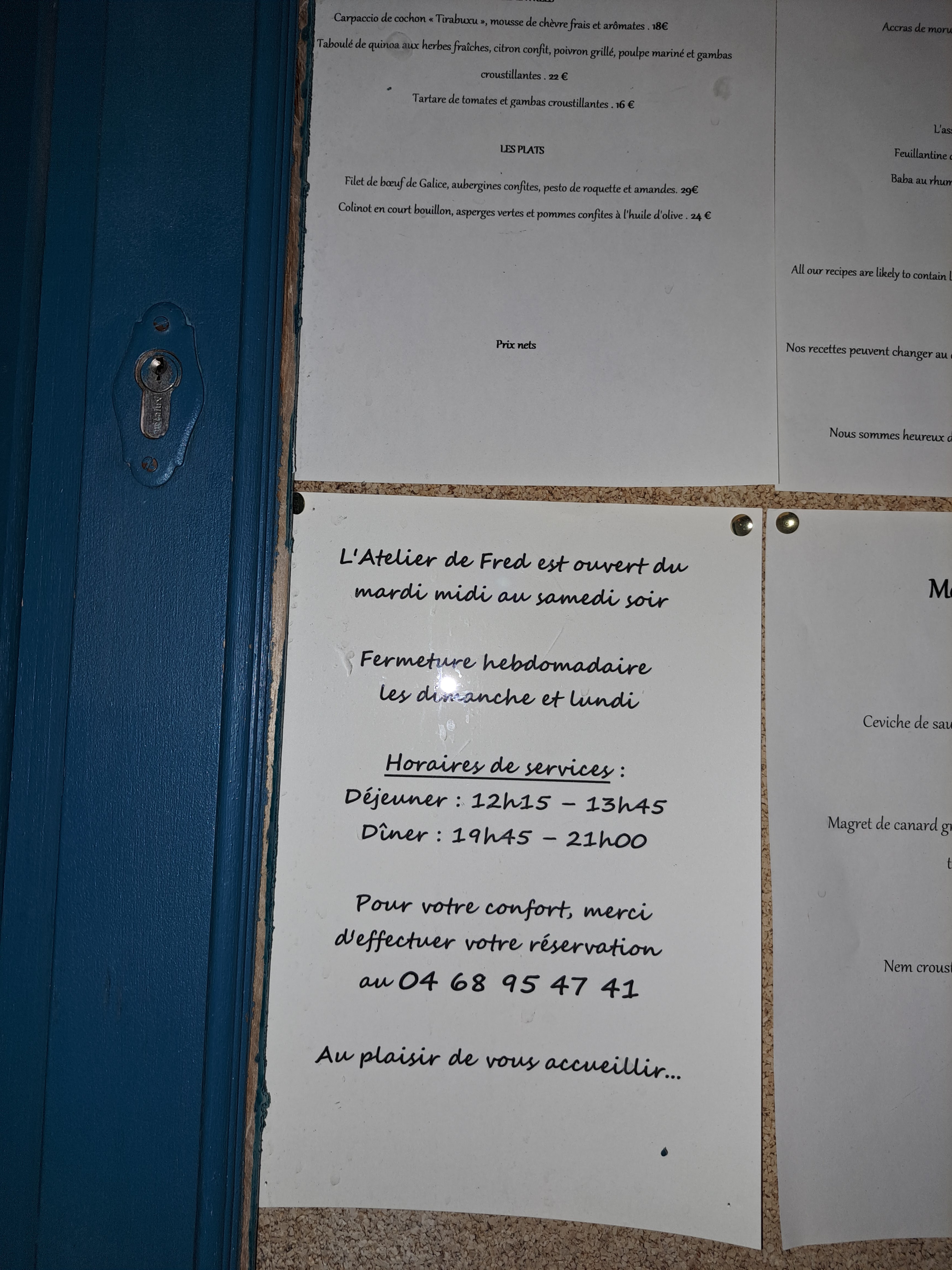 Un bel endroit , un accueil chaleureux et une cuisine délicieuse de l' entrée au dessert . L' atelier de Fred : une adresse incontournable à Ceret