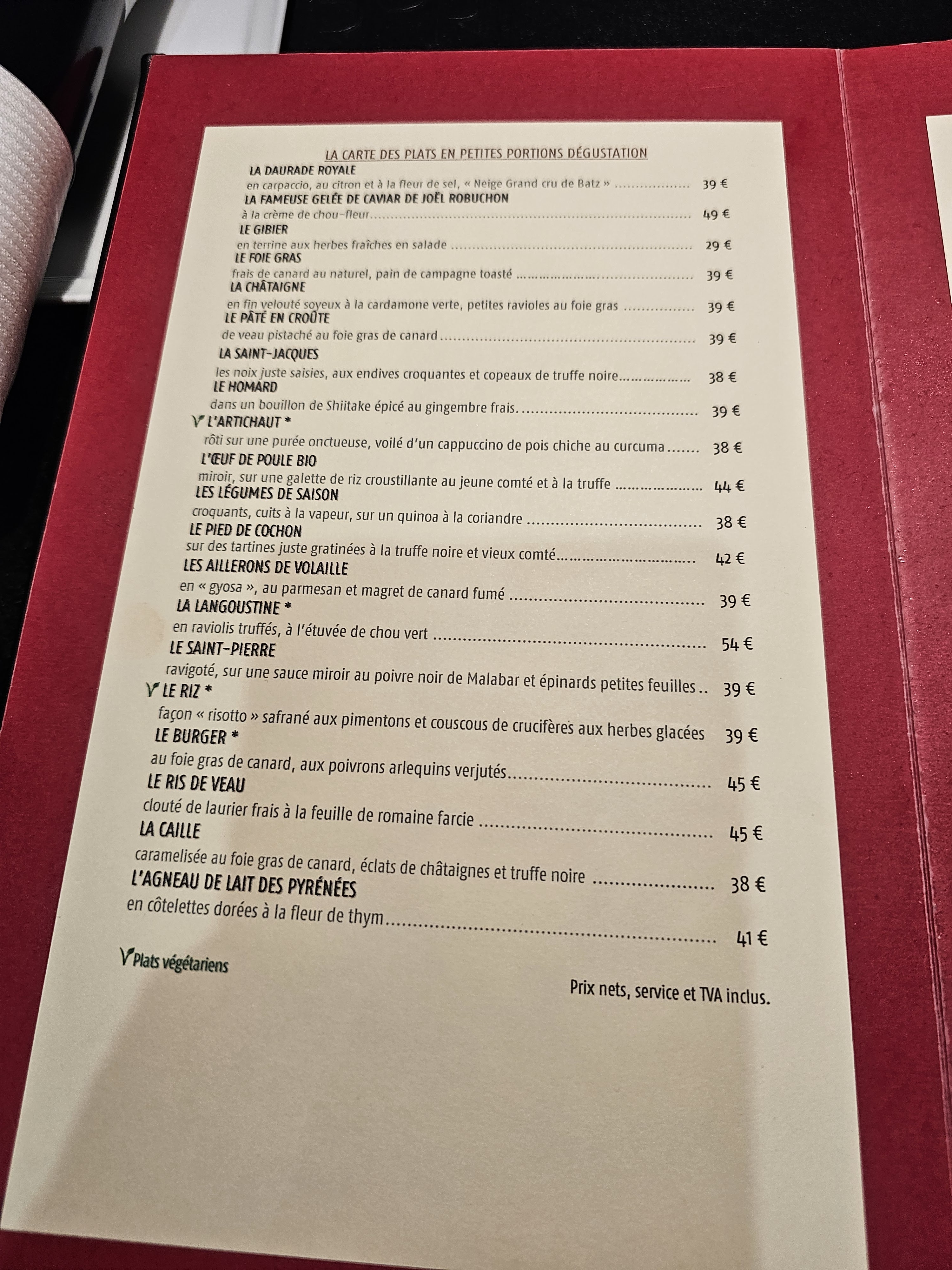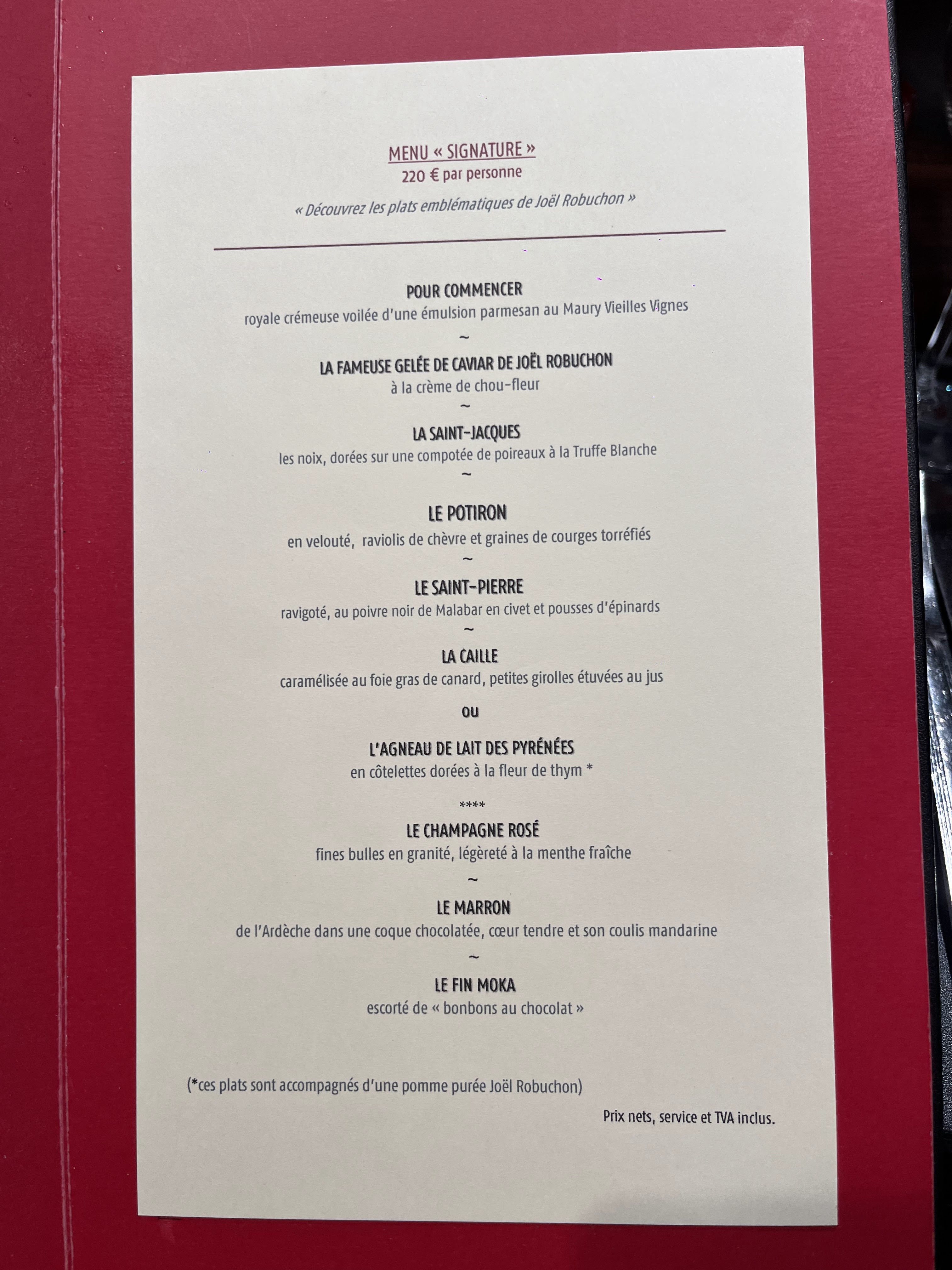 A truly wonderful experience. I highly recommend and I would go again! And yes, they have the best mashed potatoes in the world!!! Food was perfect, and service was excellent. Amuse bouche de fois gras. La darude royale carpaccio - sea bream. La fameuse gelee de caviar, these were all decent but not my favorites. I would recommned saint jacques de normandie - scallop. L’agneau - lamb - de lait des pyrenees en côtelettes à la fleur de thyme. La Caille - quail - caramélisée au foie gras de canard avec une pomme purée. La fameuse Creme Caramel de JOËL. La Coco - glacée, dans une coque de chocolat, cœur exotique - ice cream, chocolate coconut, exotic heart. These were all amazing. Looking forward to seeing you again.