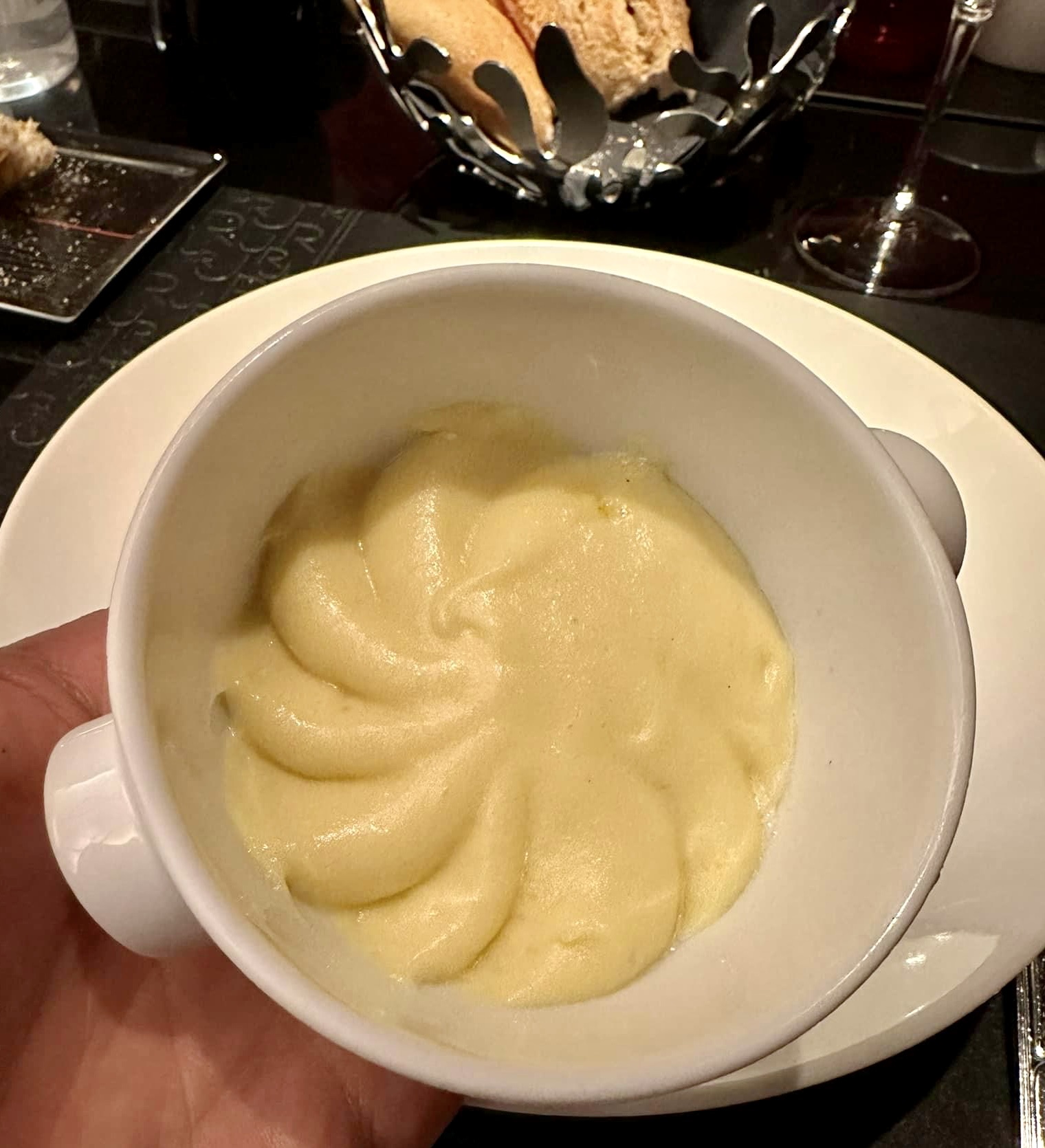 La purée ainsi que l'amuse bouche foie gras et émulsion de parmesan, sont excellent !! On apprend au moment de payer l'addition que pour un verre d'eau, on paye la bouteille d'eau...c'est un peu déplacé... Par ailleurs très agréable moment !