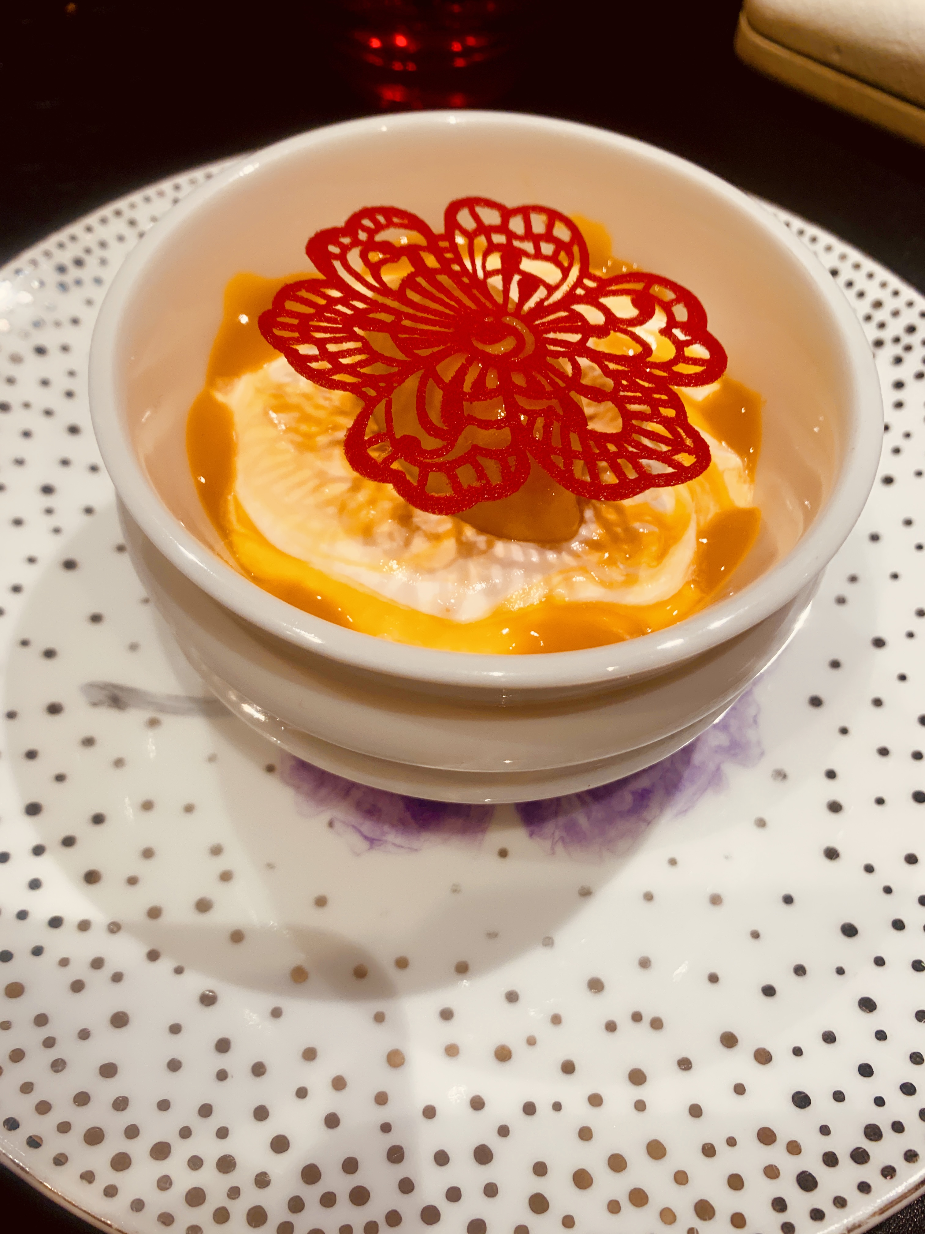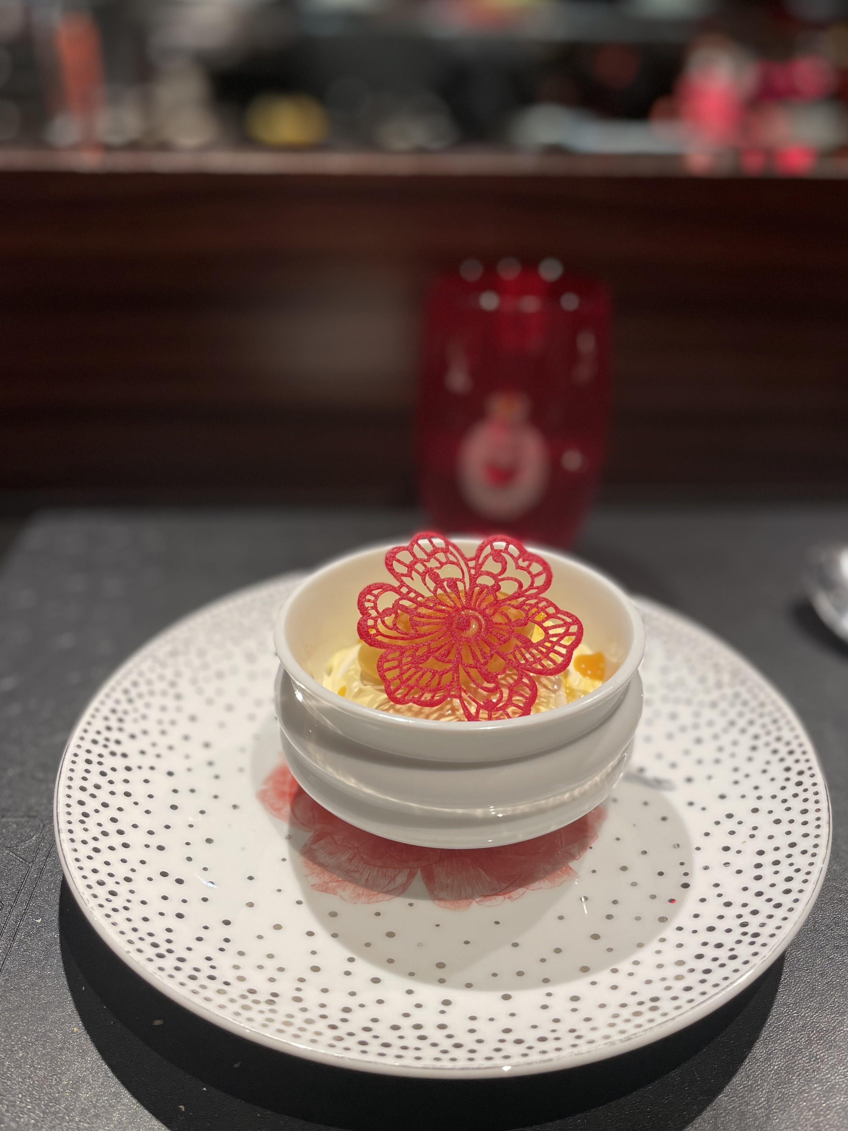 Une expérience mitigée : - Points positifs : Restaurant caché qui donne un côté intimiste et mystérieux ; Décoration japonisante travaillée qui mêle velours, laque et miroir en noir et rouge ; Vue sur les cuisines ; Chef qui passe voir ses hôtes ; Cuisine généreuse au niveau des portions ; Sommelier intéressant et excellent choix de vins ; Produits de qualité (y compris la viande) ; Présentation très soignée (mention spéciale pour le champignon en dessert) ; Petit cadeau offert à notre départ comme nous fêtions un anniversaire. - Points négatifs : Malgré les prix élevés (+ de 40€ mon entrée, + de 50€ mon plat, + de 20€ mon dessert), ce n'est pas l'explosion de saveurs en bouche, la truffe de l’œuf bio est pauvre en goût, sa galette de riz un peu pâteuse, œuf un peu gras, pas de goût de foie gras avec la caille, crème un peu lourde dans le dessert champignon. Je salue néanmoins la purée, la crème de parmesan pour la mise en bouche et les mignardises de fin de repas avec la madeleine chaude et le chocolat. Notre serveur bien que gentil n'était pas à la hauteur (présentation de la carte alors que les convives ne sont pas tous encore à table, pas de ramassage des miettes sur la table entre les plats, miettes des autres tables à côté de nous jetées à même le sol au moment du nettoyage, présentation trop rapide des plats, bruits de vaisselle rangées dans un sorte de placard de fond de salle durant le repas, on doit demander le sel-le poivre-et le pain, verres de vin qui tardent à venir).