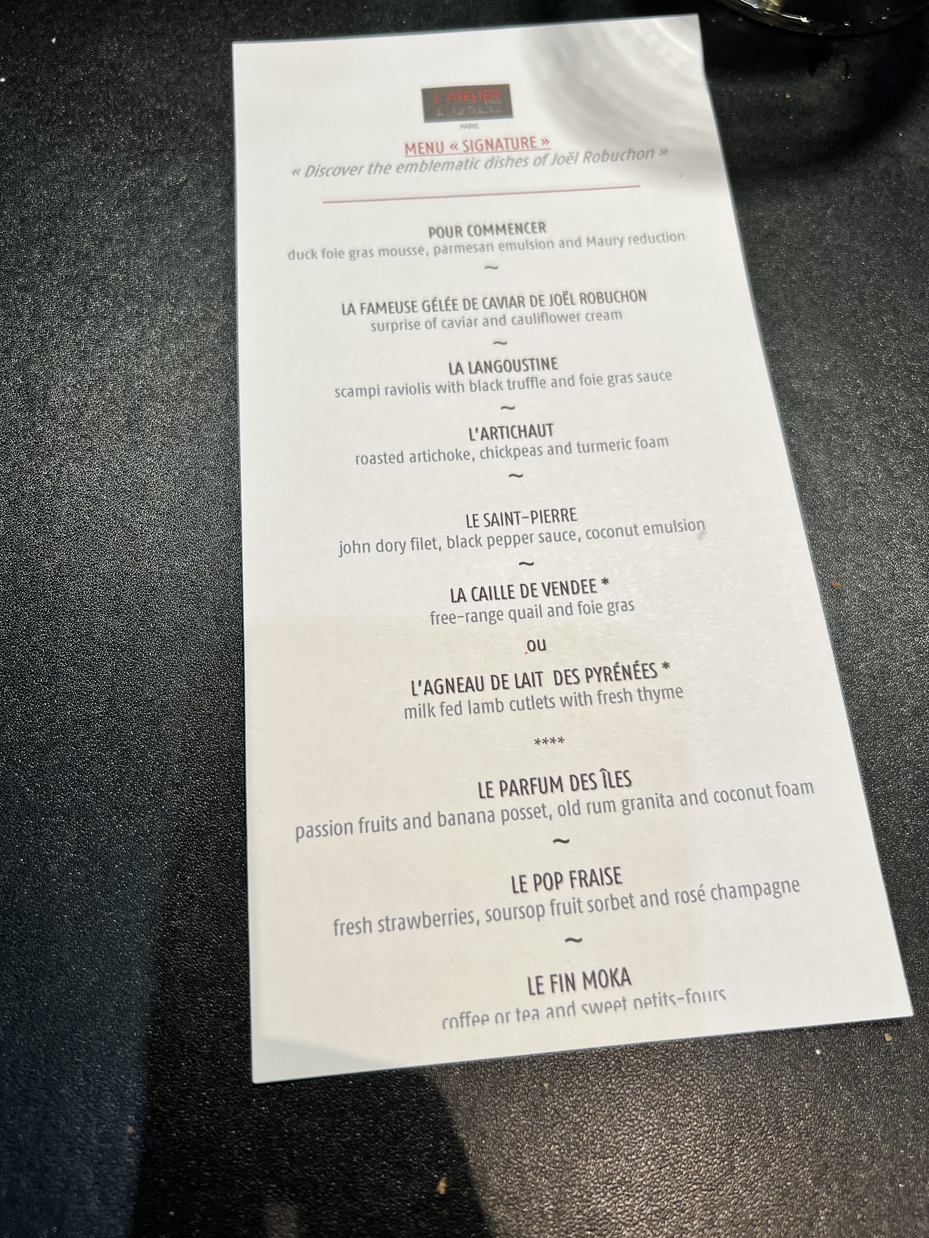 C'était sans conteste l'une des meilleures expériences culinaires que j'ai eues ! J'ai fait le menu dégustation et c'était au-delà de mes attentes. Le service client des serveurs était exceptionnel et j'avais l'impression d'être un roi tout le temps ! Tout le monde était très attentif et j’ai personnellement adoré le niveau d’attention et de gentillesse que j’ai reçu d’Ahja (j’espère avoir bien orthographié cela) ! Elle était si gentille et a donné d'excellentes recommandations ! Ce niveau de service client était important pour moi car je n’ai pas eu l’expérience la plus agréable à Paris depuis d’autres endroits. Cependant, tout le personnel de cet atelier était au top ! Je n'ai même pas abordé la nourriture ! Et tout était si bon et si délicatement et délibérément préparé ! Personnellement, j'ai le plus aimé l'agneau à la purée de pommes de terre du menu dégustation ! Merci Atelier de Joel Robuchon pour le meilleur temps et les meilleurs soins.