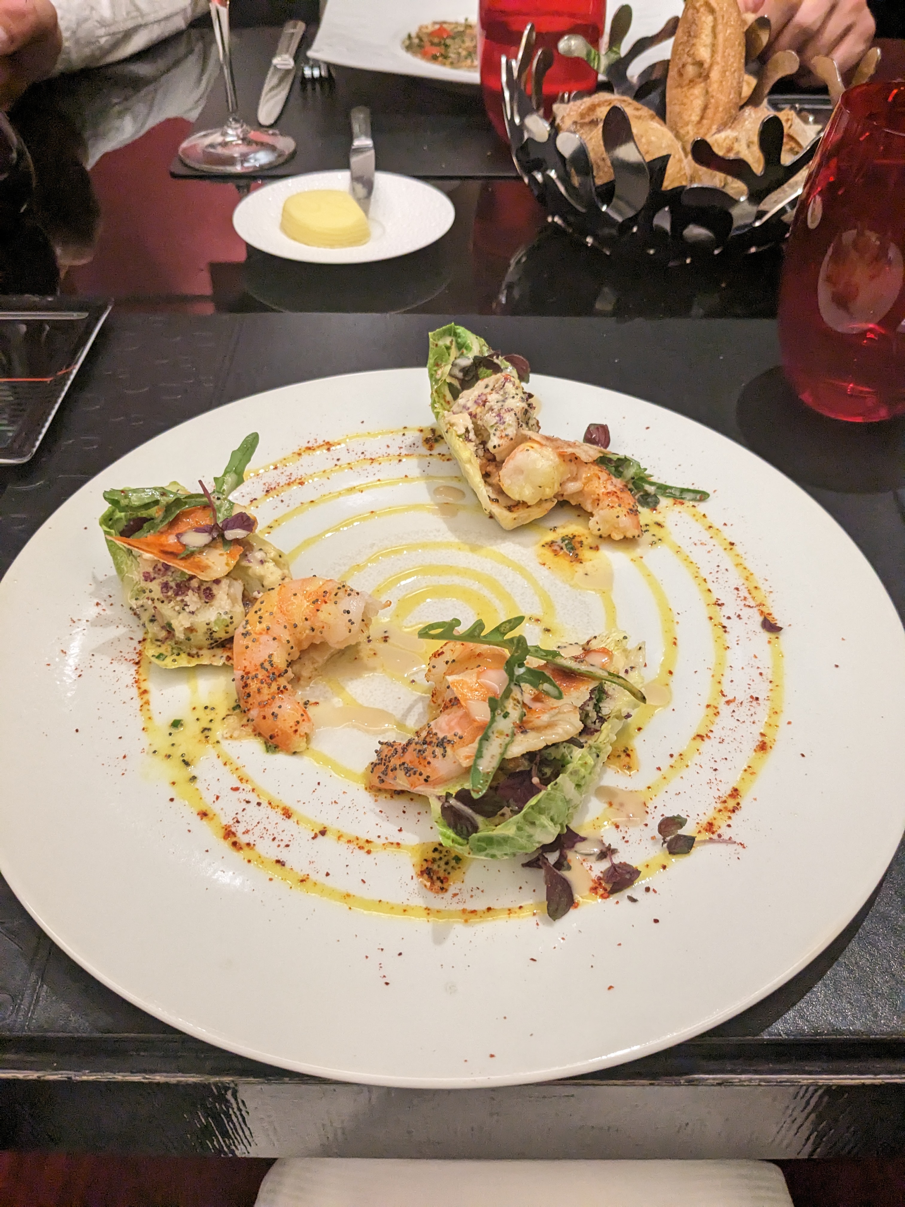 Les personnes du service etaient absolument adorables mais j’ai été déçue par la cuisine. L’entrée aux crevettes majorée 15 € (ça ne les valait clairement pas) sur le menu manquait d’originalité, de relief ou de profondeur. Le saint-Pierre était décevant aussi - et trop cuit. Je fréquente habituellement des adresses du fooding sans étoile, j’ai eu l’impression de m’être égarée dans un restaurant pour Américains au palais plat et me suis sentie un peu flouée. La purée était très bonne, le dessert était bon également.