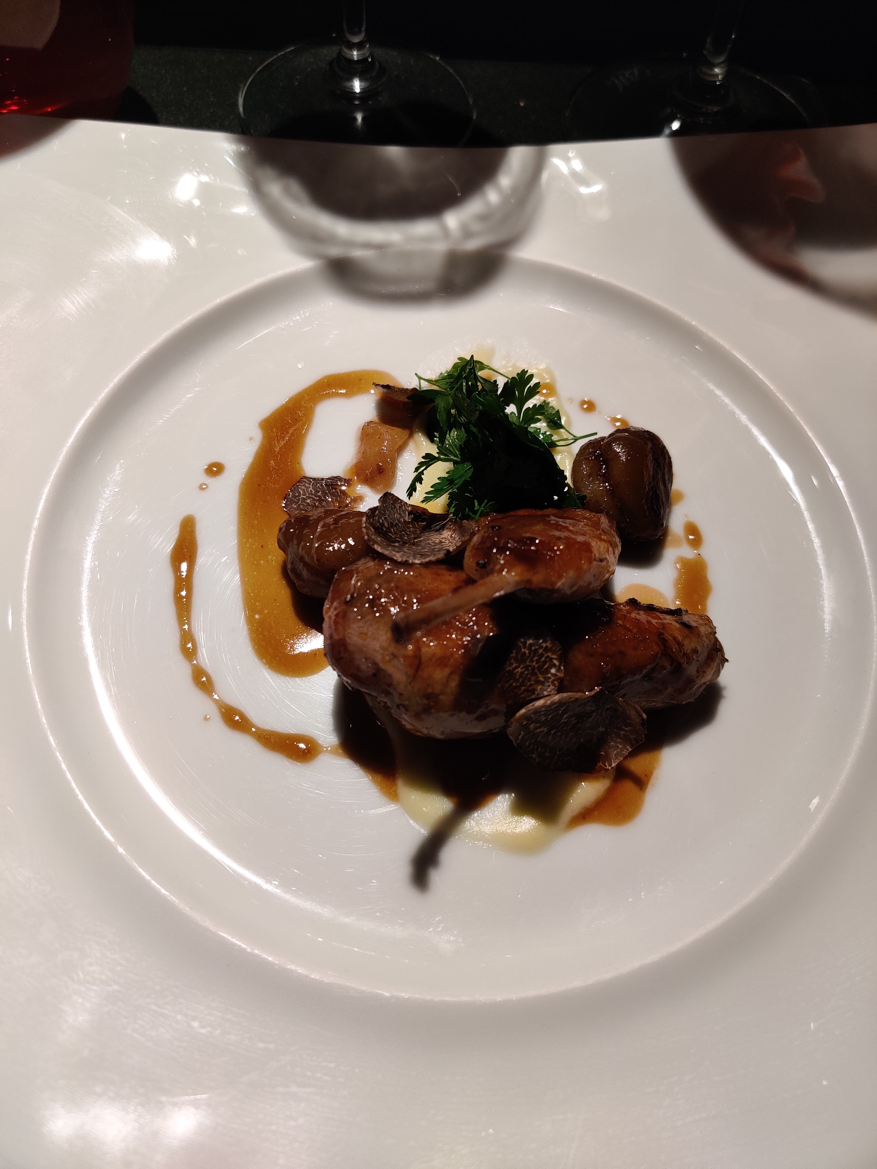 Vue sur la cuisine exceptionnelle et plats fabuleux (caille). Service de haute qualité, personnel très sympathique et disponible pour toutes demandes.