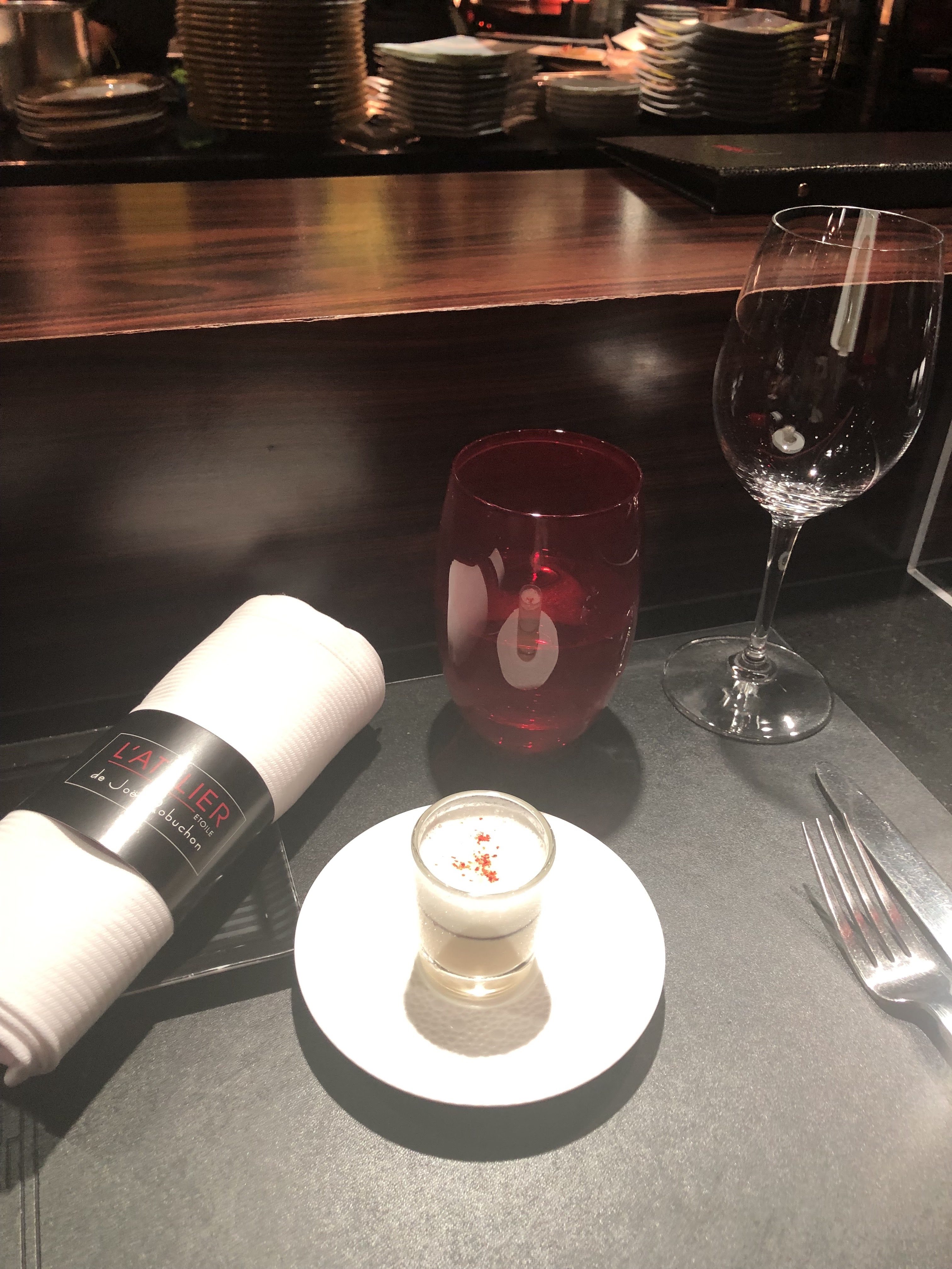 J'ai mangé à l'autre endroit de L'Atelier à Paris et j'ai eu une meilleure expérience à l'autre endroit. La nourriture y était délicieuse, mais le service laissait beaucoup à désirer. Pour une raison quelconque, l'hôte a pris les manteaux et les sacs de certains clients et les a vérifiés et pour d'autres, elle ne l'a pas fait. Elle m'a juste fait asseoir sans rien prendre, ce qui m'a obligé à mettre mon manteau et mes sacs à mes pieds. Ensuite, on ne savait pas qui était mon serveur. Moi-même et les clients à côté de moi avons eu du mal à attirer l'attention de qui que ce soit, et lorsque nous l'avons fait, nos demandes ont été oubliées - obtenir un verre de vin ou demander plus de beurre, etc. Nous avons plaisanté en disant qu'ils étaient en colère contre nous. Nous étions au bout du comptoir et étions sans surveillance ou surveillés pendant de longues périodes. J'ai reçu le menu dégustation et quelques plats ont été déposés devant moi sans explication. Je n'ai jamais vécu cela avec un menu dégustation. Le restaurant n'était pas occupé même si j'y suis allé le vendredi avant le réveillon du Nouvel An. Pour le prix, je m'attendais à un niveau de service supérieur.