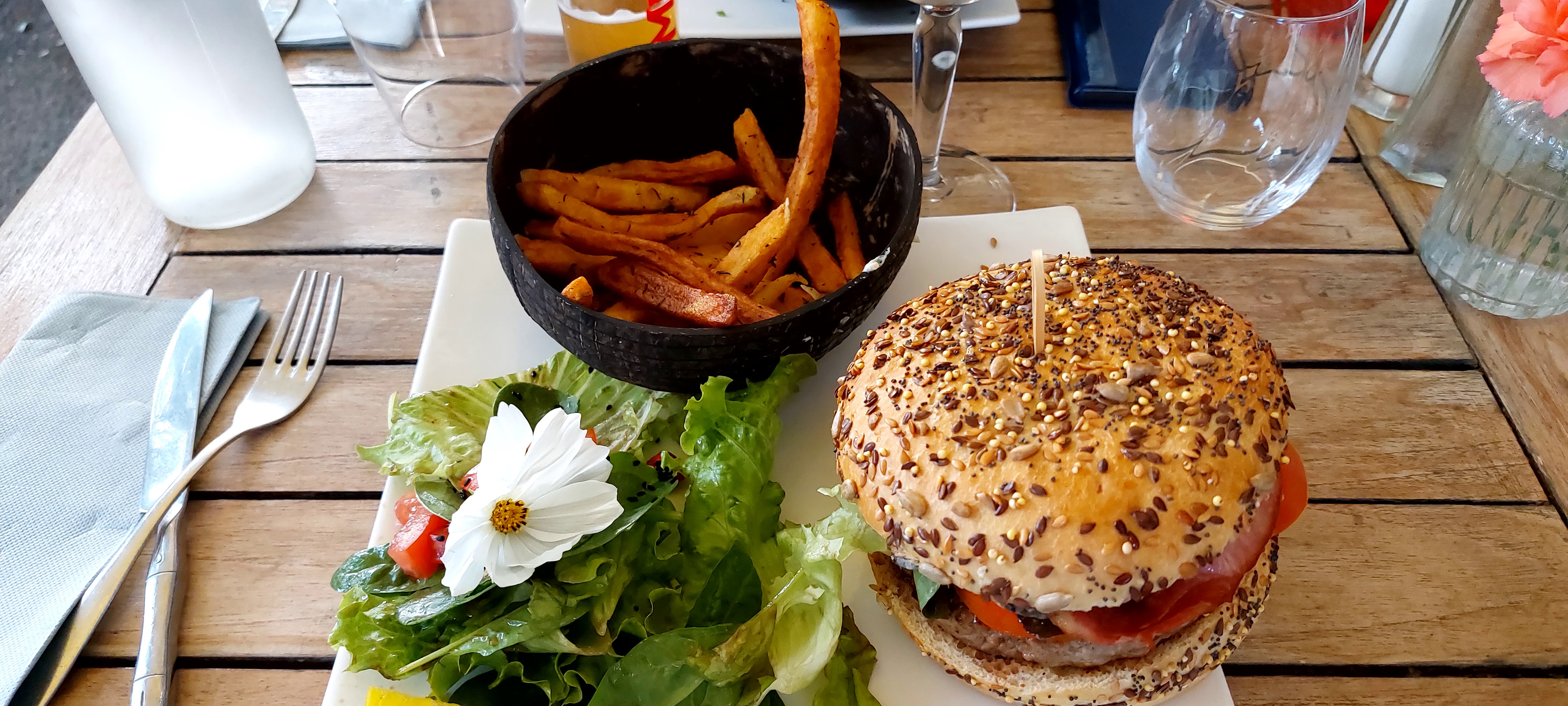 Une Adresse à découvrir. Bon accueil en plus d'une petite verrine originale et délicieuse offerte. Des plats très bien présentés avec des produits de saison. Un bémol en ce qui concerne le hamburger, superbement monté et qui est très complet accompagné d'une jolie salade fleurie, peut-être trop gros ce hamburger ?