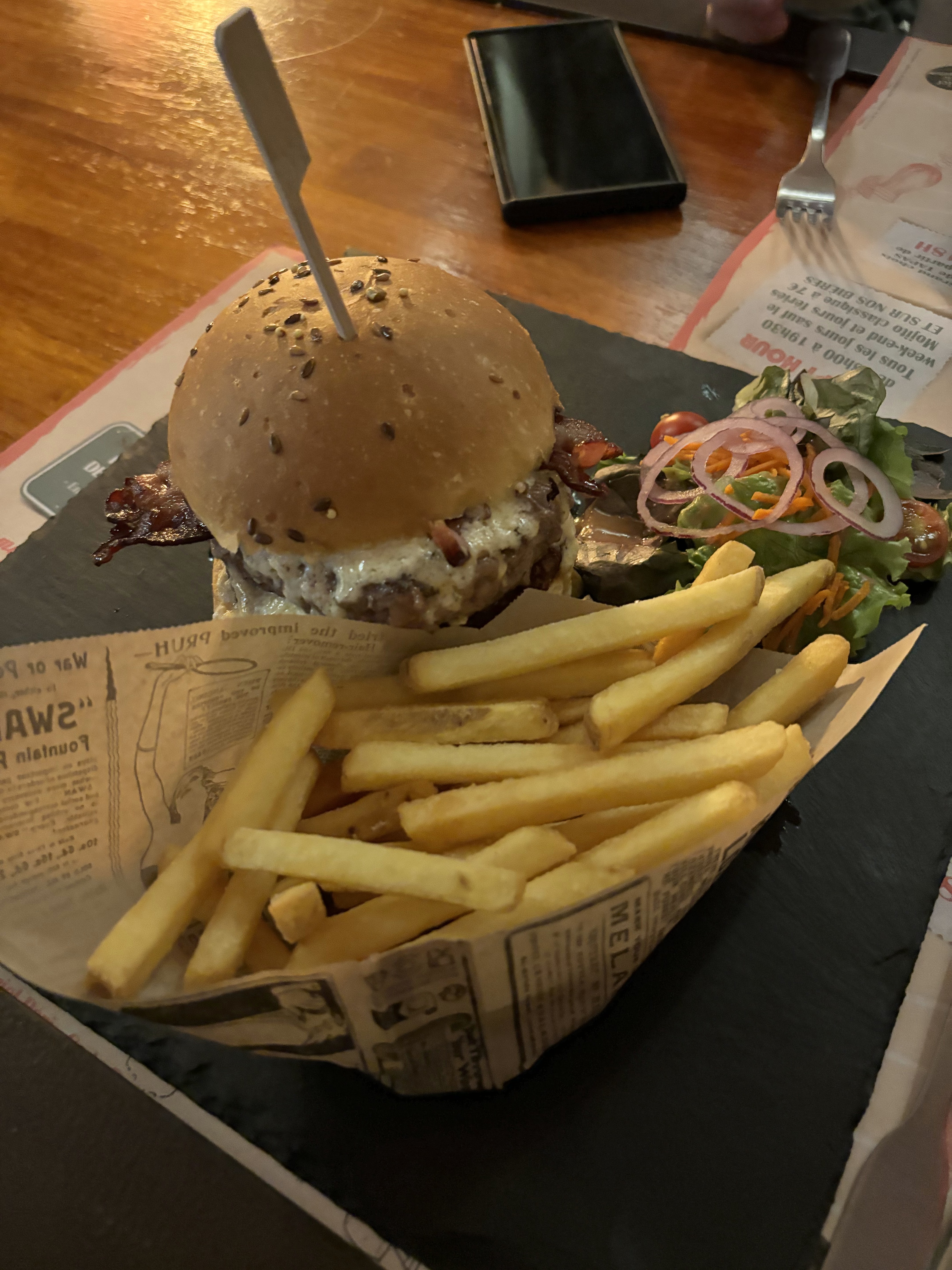 J'ai goûté un très bon tartare !!! Aussi un très bon burger pepper. Service efficace et agréable avec un très bon cadre et déco originale.