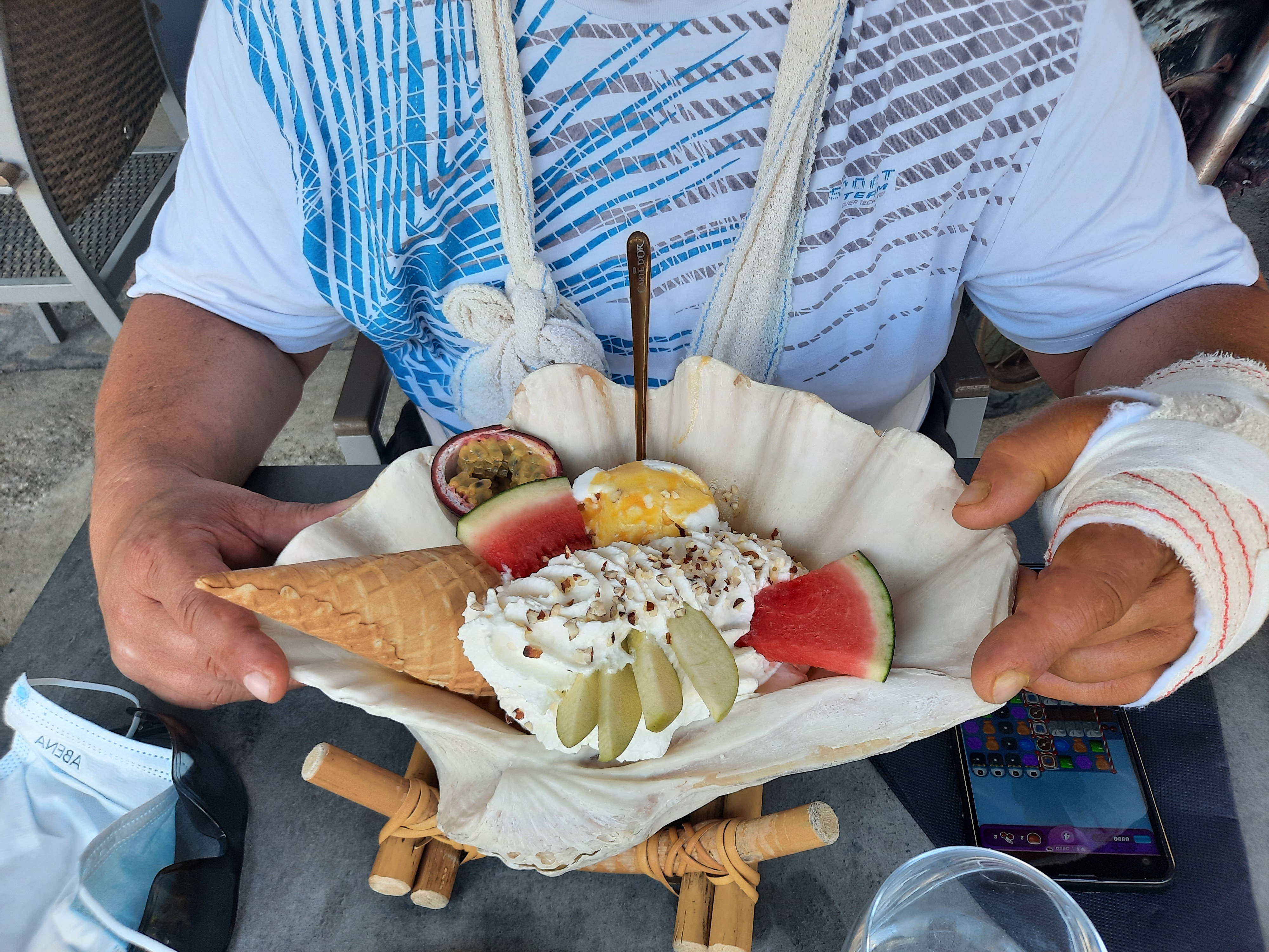 Dimanche 15 août 2022: nous avons déjeuné à l'intérieur pour plus de fraîcheur. A l'angle de la vitrine où se trouvait notre table, des toiles d'araignée tout le long et son araignée 🕸... Les palourdes de la salade Playa étaient mal rincées, du sable et des morceaux de coquillages à s'en casser les dents...la pastèque dans la salade avec l'écorce, les feuilles de salade vert-foncé et fanées, le café gourmand pauvre et médiocre (la boule de glace à la mangue était bonne) . Le serveur par contre, très sympa... Bref, pas génial, cette fois.