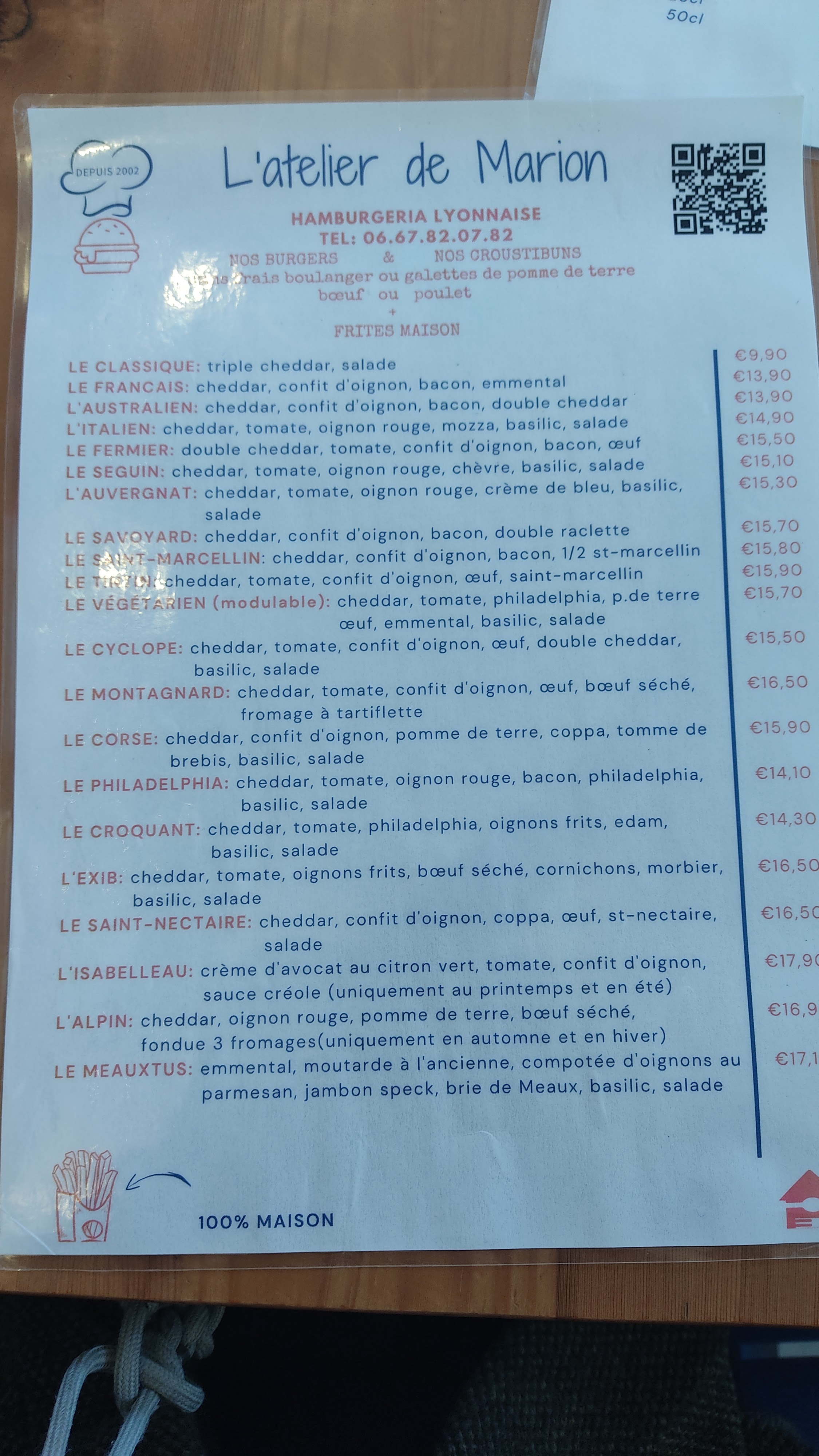 Super accueil pour un déjeuner à l'atelier de Marion ! Les burgers et les frites étaient excellents, le serveur agréable et attentif au déroulement de notre repas de A à Z, Toute l'équipe aux petits soins. En plus de ça, le repas est abordable, et rapide! Je recommande vivement !