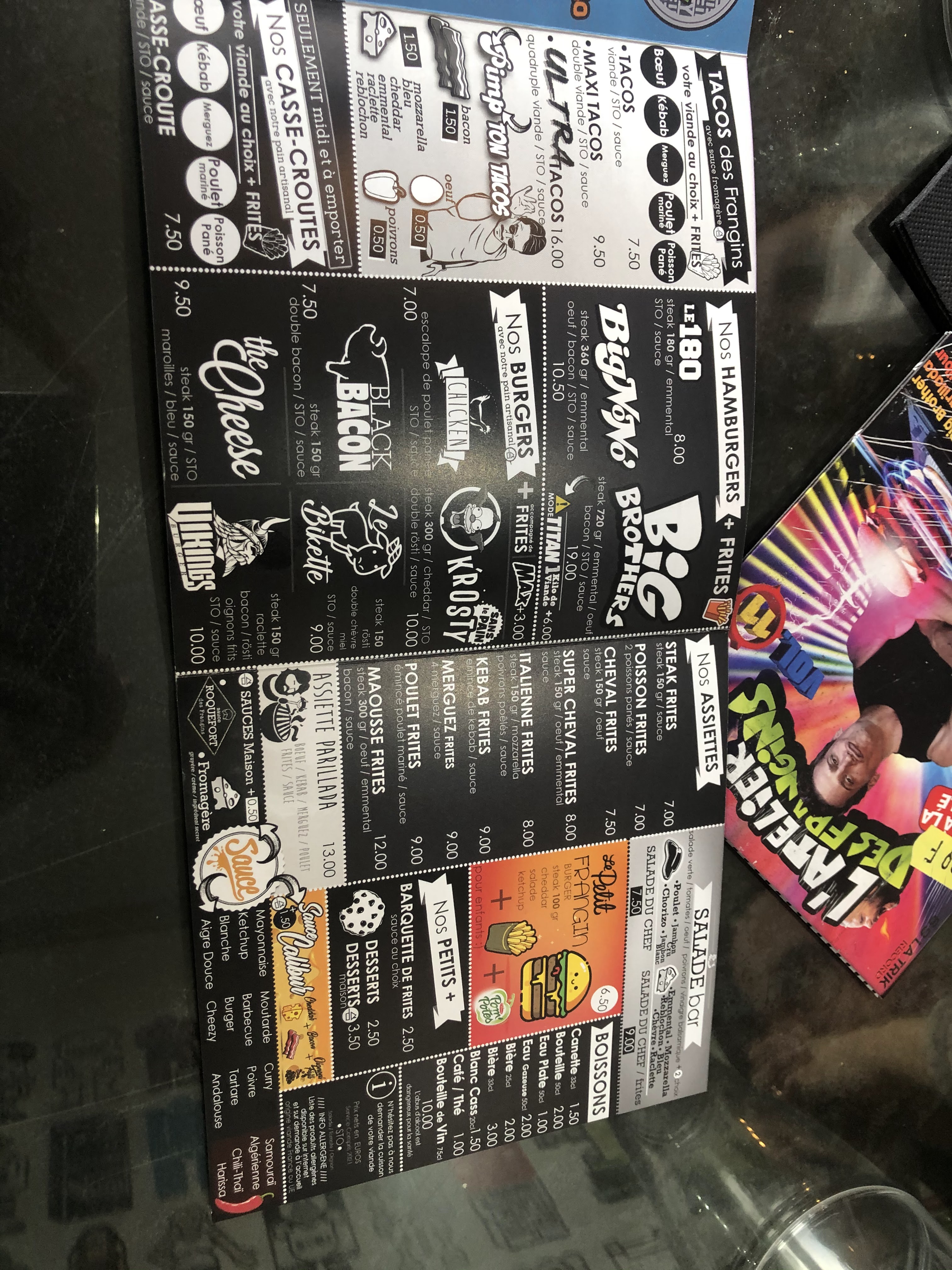 J'ai pas l'habitude de mettre si peu peut-être 4 la prochaine fois. Pour ma part après discussion avec la chef j'ai appris que le big brother ne pouvait être bleu. Or je n'aime quasiment que la viande bleu, donc le manger en entier saignant bof. Je finis avec mon point négatif sur le tiramisu caramel speculos, le caramel ne se sentait quasi pas et la seul goût en bouche était les boudoir donc déçu. Points positifs L'ambiance et l'accueil très bien, et la chef était très à l'écoute de ce pourquoi ça n'allait pas. Le cadre est bien on en oublié la position. Les odeurs dans l'air de clope sont masqué par celle de la cuisine ce qui est bien mieux. Même si la cuisine du 'brother' n'était pas bonne un bon rapport qualité prix, et surtout quantité (burger). À une prochaine pour des steak bleu dans un autre type de burger 😉