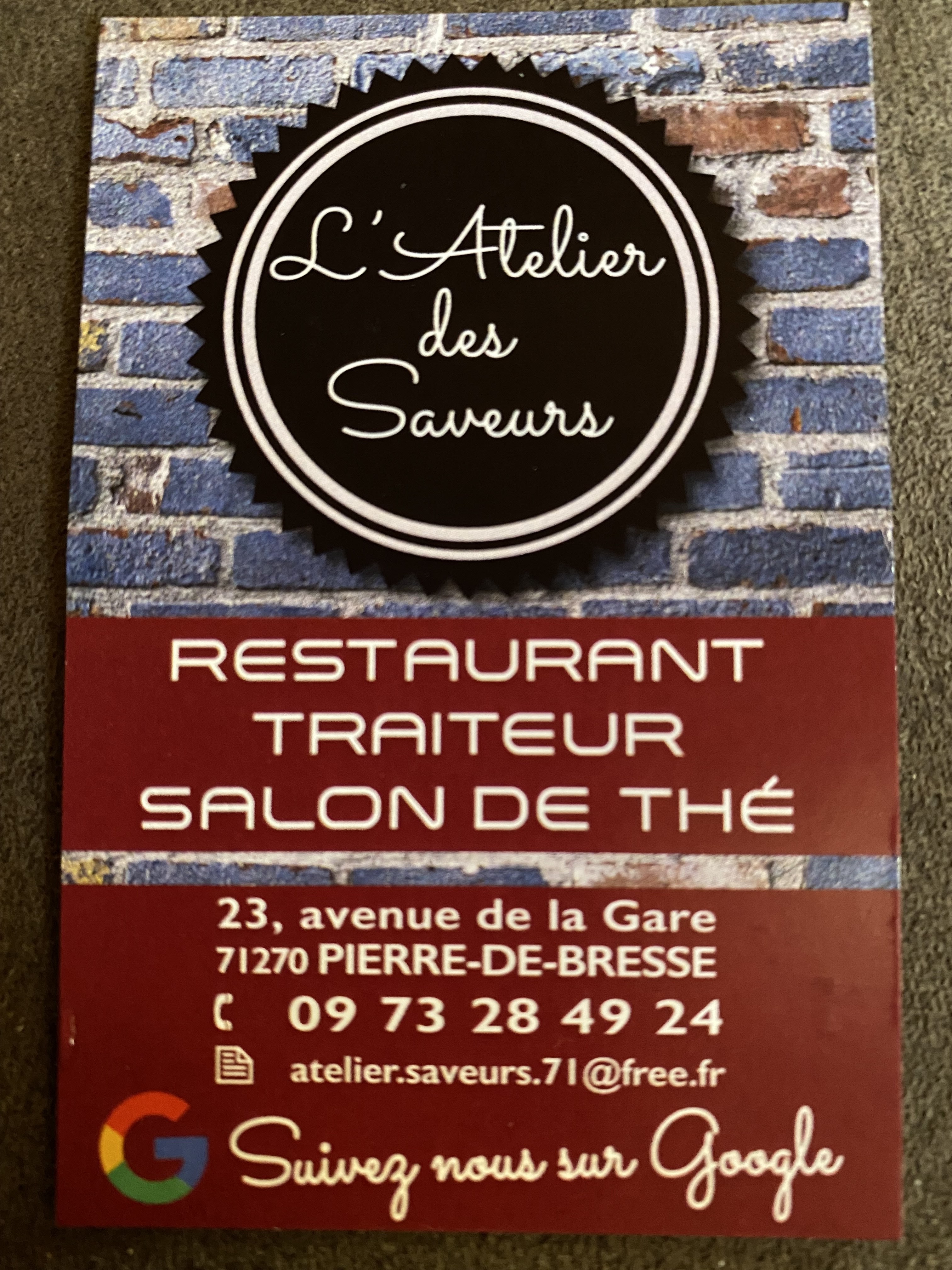 Voici toutes les informations sur le Restaurant L'Atelier des Saveurs qui ce trouve au 23 Av. de la Gare, 71270 Pierre-de-Bresse (71). Sur cette fiche vous trouverez les photos, l'adresse, les horaires d'ouverture, le numero de téléphone et les avis clients.Vous pouvez églement rédiger un avis si vous le souhaitez en bas de page.