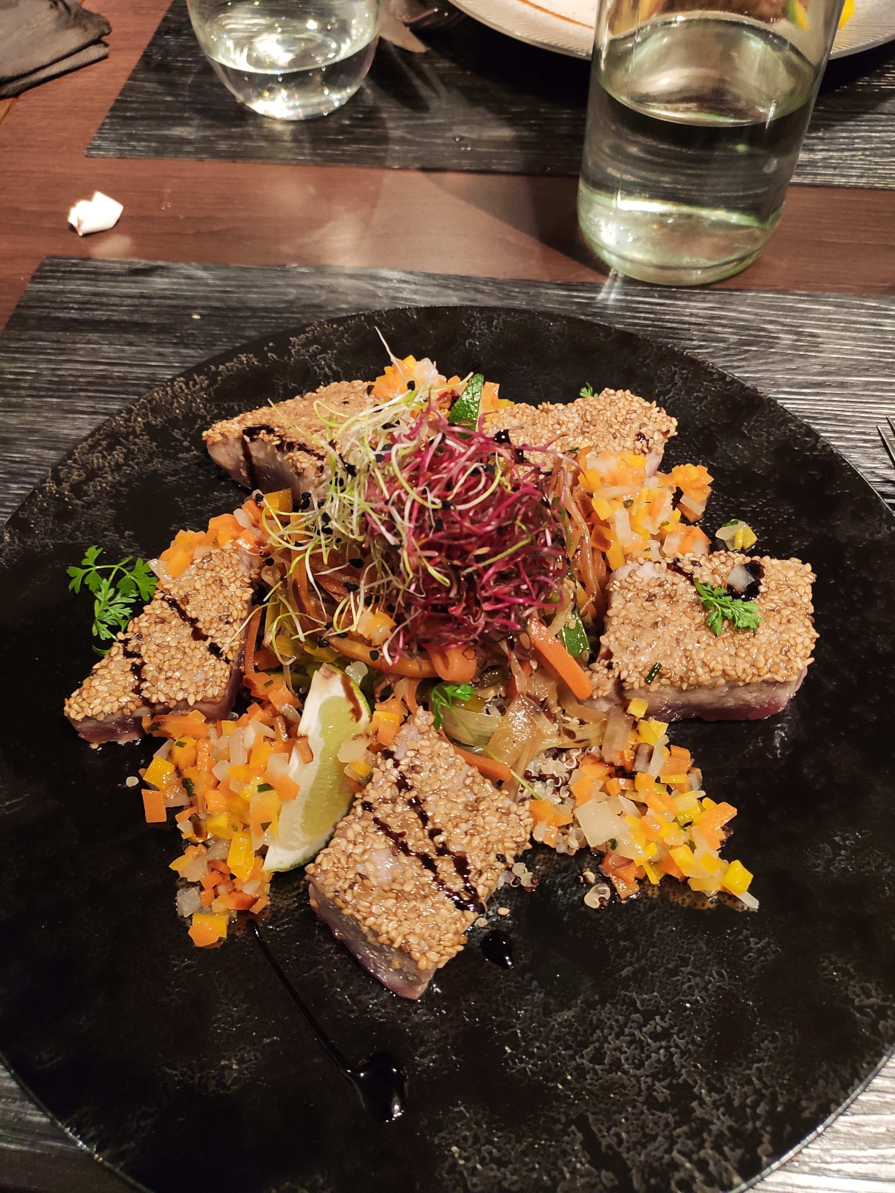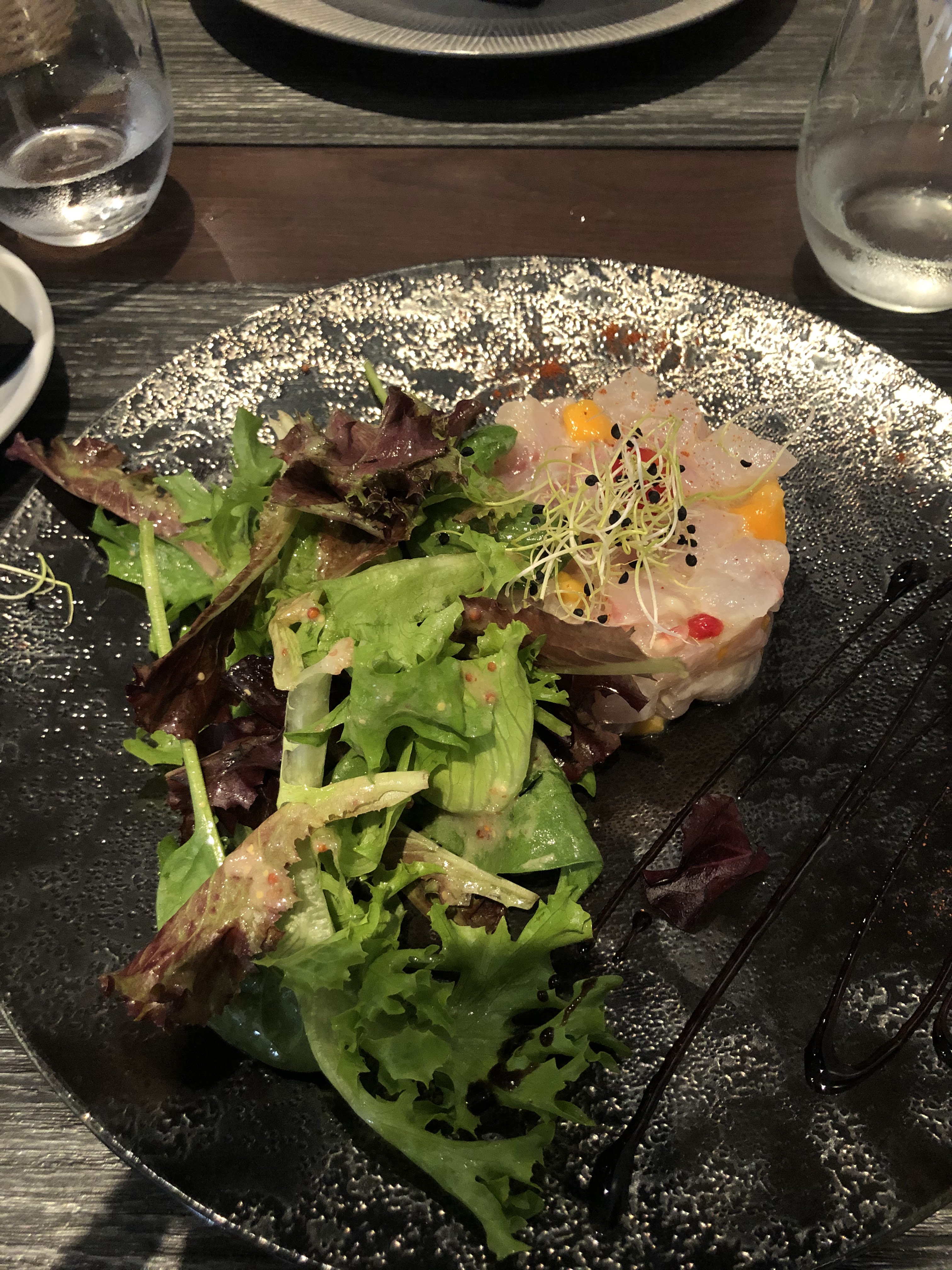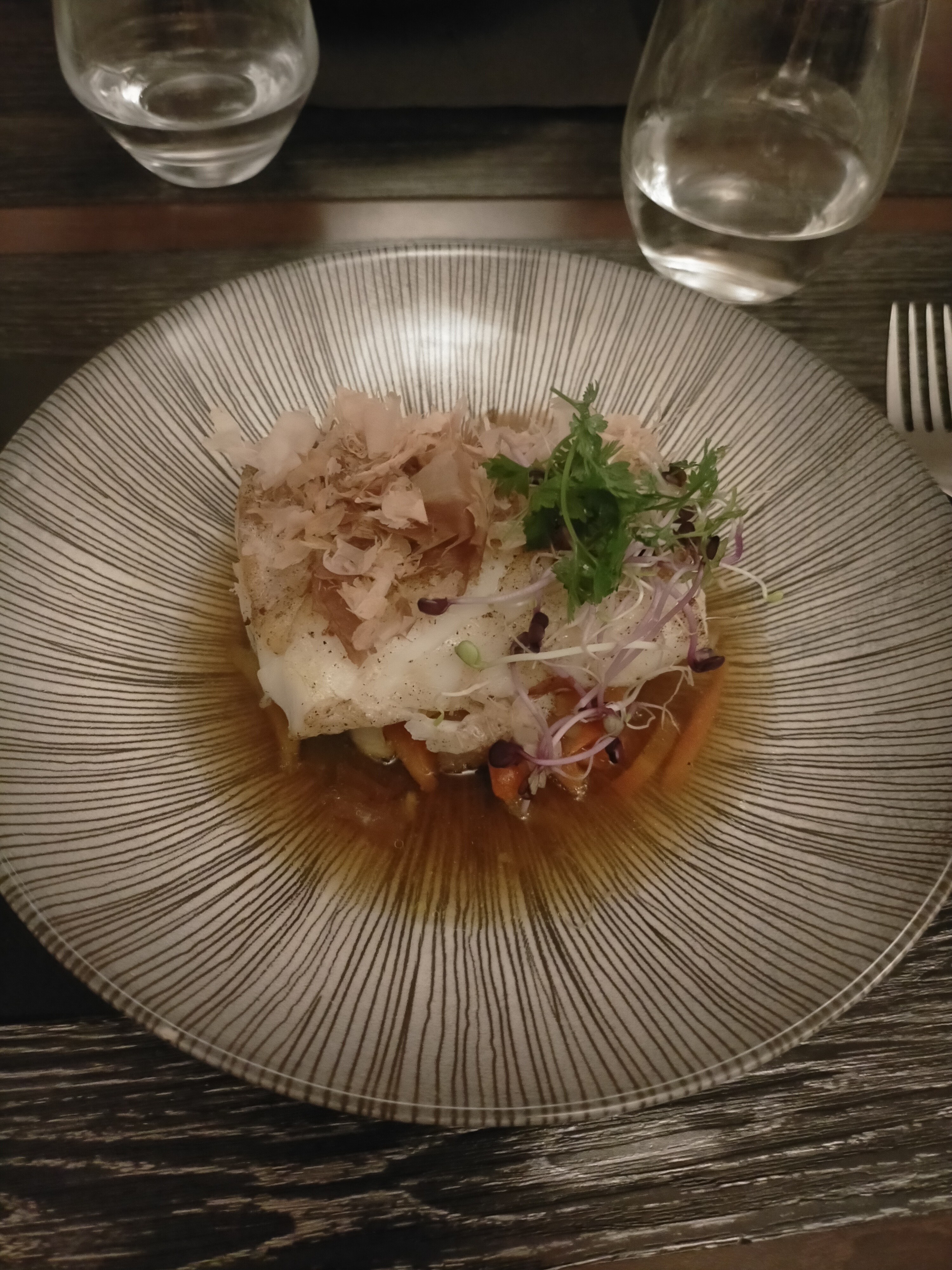 Tres bonne soirée !! Tatami de thon en entree délicieux comme le filet de bar. Par contre le lieu jaune sur peau avec le katsuobushi est très salé Dessert crumble fraise rhubarbe bon. On avait pris un verre de vin Vieille Vigne : puissant !!!