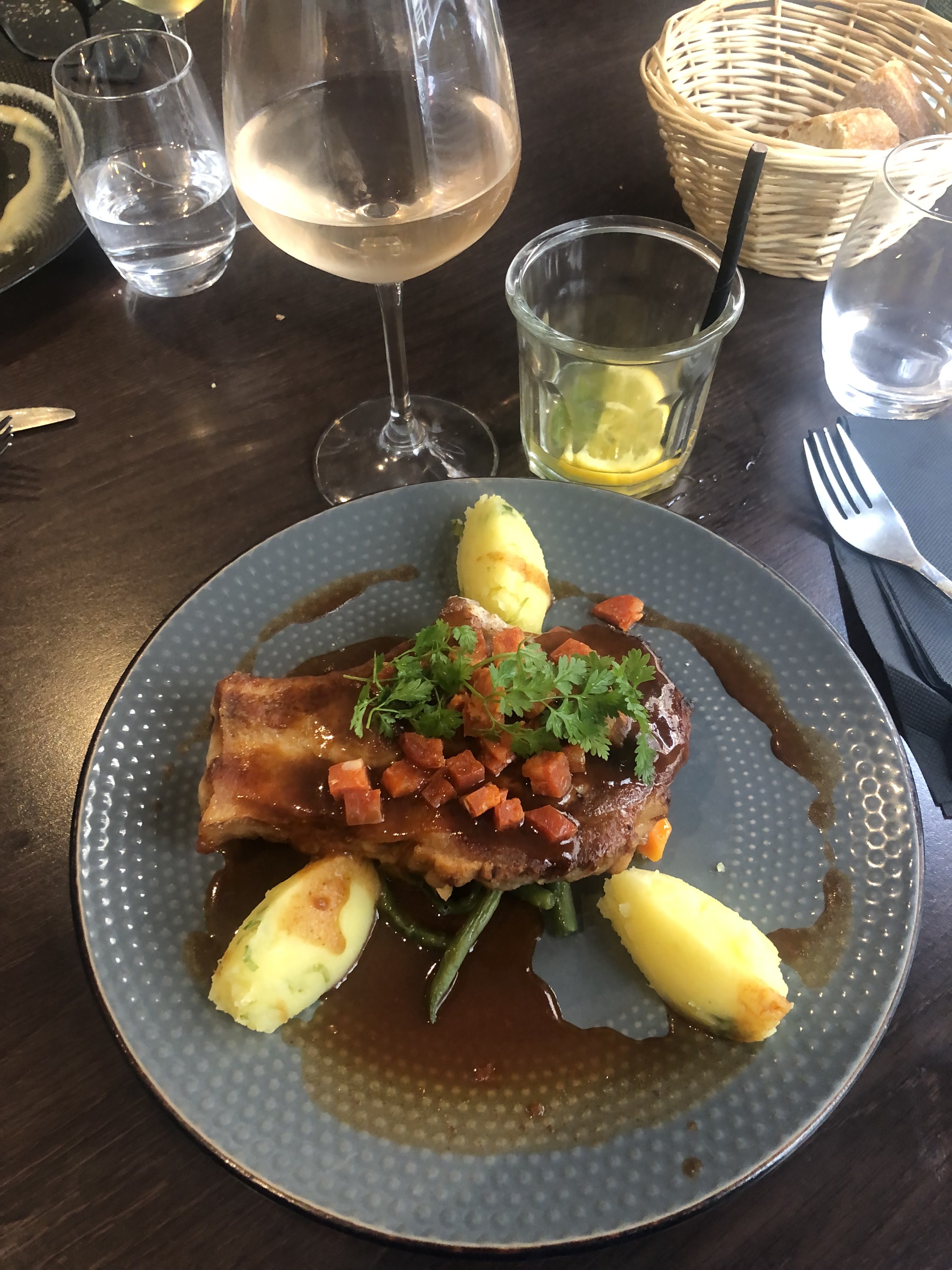 Bon! Les plats que nous avons choisis étaient vraiment bons, notamment le porc excellent, très tendre et très savoureux ! Le serveur a été gentil et serviable en expliquant les plats et le vin qui les accompagnait. Recommandé!