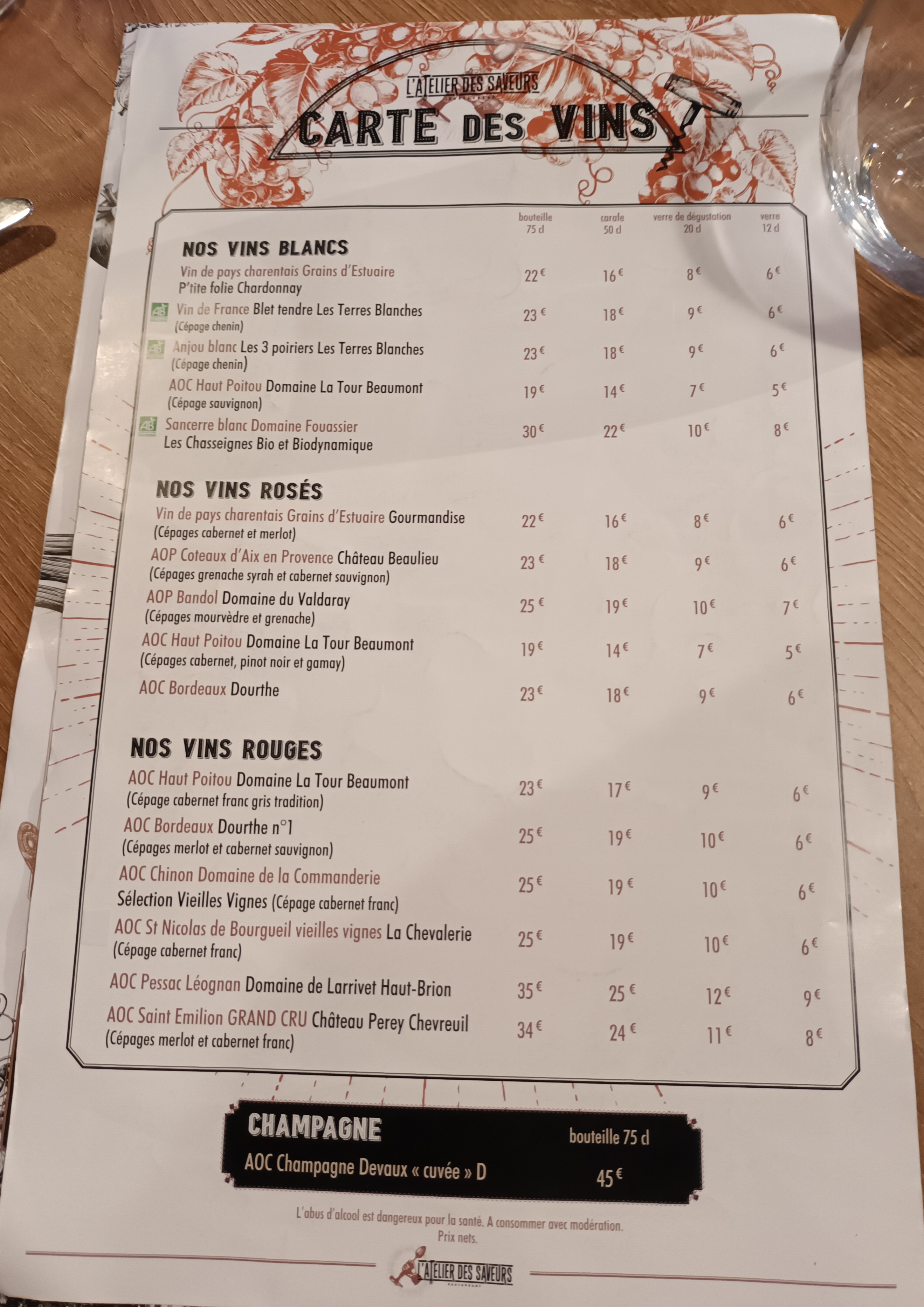 Nourriture ignoble, prix parisien, service très bien, bref un parc d’attraction j’imagine. Le saint Nicolas de bourgeuil est très bon pour le prix!