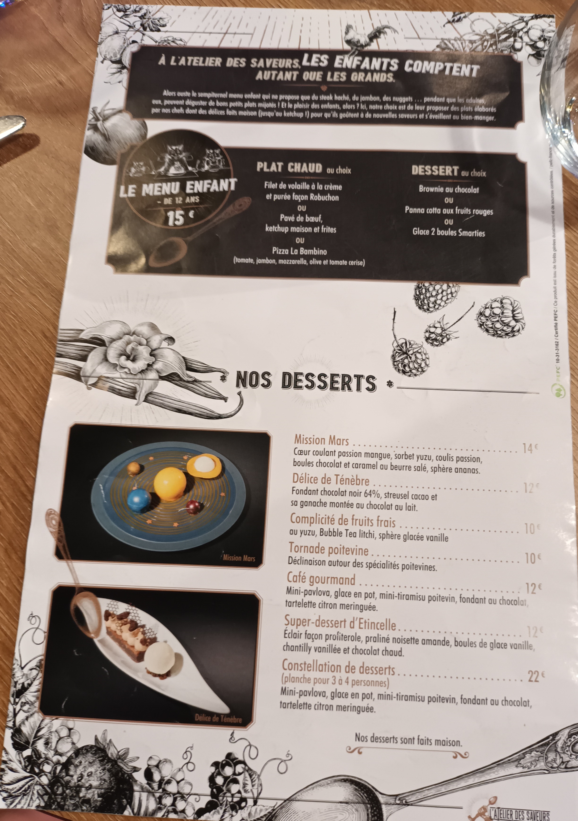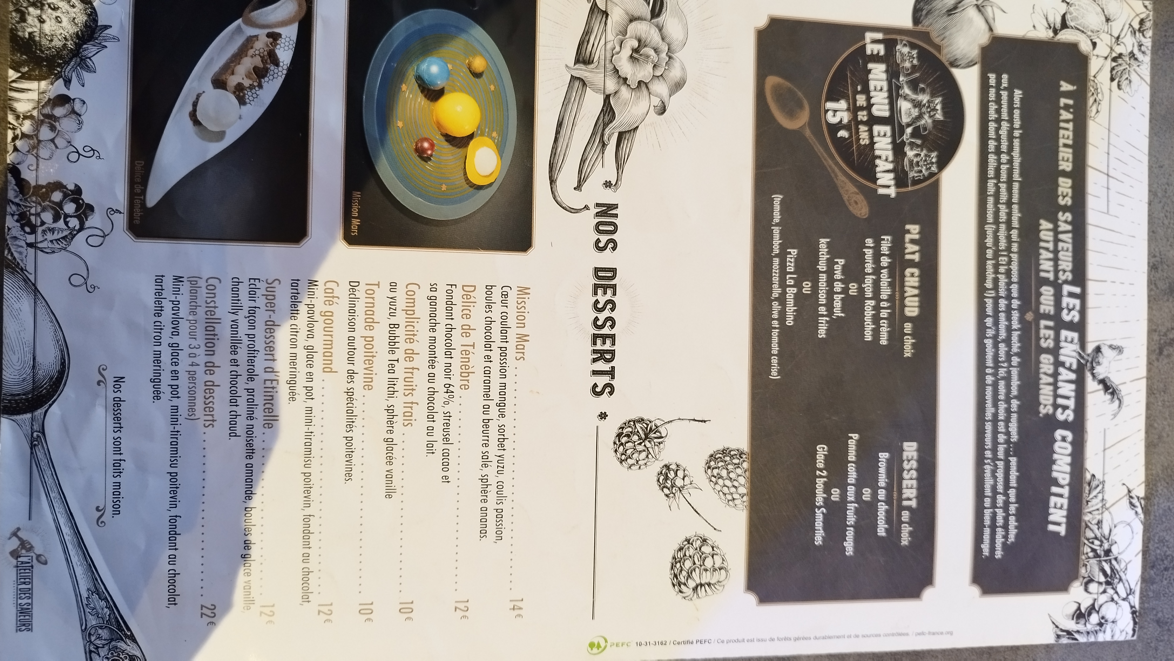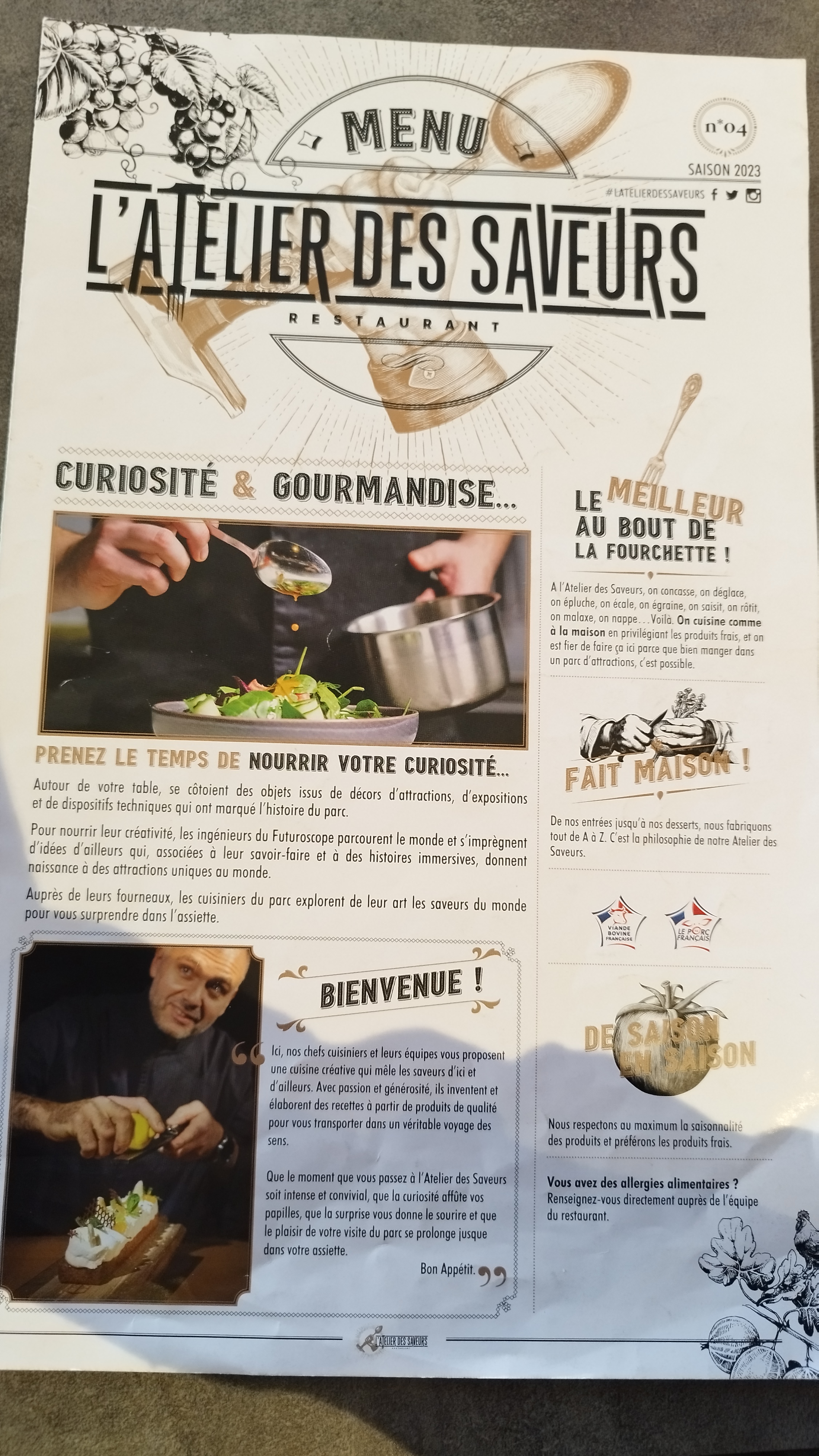 Nous sommes venus passer 3 jours dans le parc et de nuit à la station cosmos, nous avons réservé à l'avance une table à l'Atelier des saveurs pour un dîner ainsi qu'au Space loop. Le décor est plutôt sympa stylet entre musique brocante et lounge. Malgré un restaurant chargé et où vous pouvez arriver à n'importe quel moment de l'ouverture avec votre réservation vous êtes rapidement pris en charge par un serveur pour vous placer les tables sont plutôt cosy sans se marcher les uns sur les autres le lieu est plutôt silencieux on entend un orchestre virtuel reprendre des tubes populaires du moment c'est plutôt agréable pour sortir du brouhaha du parc et prendre une pause. Côté cuisine rien à redire nous nous sommes régalés certes le prix est plus cher que celui d'un fast-food mais ça n'est pas comparable les produits frais et sains sont bien travaillés des vins excellents où sont proposés. La présentation est travaillée et soignée et le service est rapide ce qui vous permet de profiter ensuite du spectacle de 22h sans difficulté. Nous avons tellement apprécié le restaurant hier soir que nous sommes venus y manger ce midi pour éviter la junk food pratique mais pas forcément des plus agréables pour faire ensuite des attractions. Notre avis d'hier soir se confirme aujourd'hui avec une commande un peu plus simple au restaurant où nous avons reçu le même service et une qualité des produits exceptionnel. Si nous avions su la déception que nous avons rencontré au Space loop nous aurions réservé à nouveau à l'Atelier des saveurs !