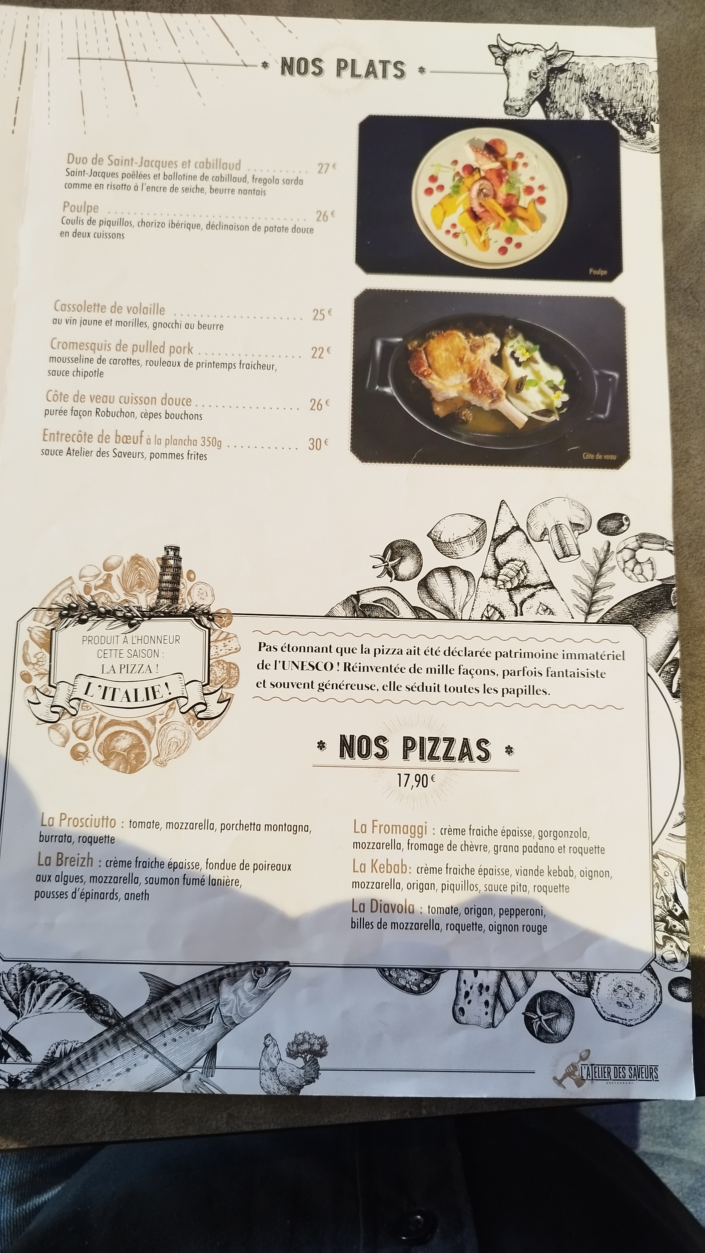 Nul. Entrecôte à 30€ arrivée froide et trop cuite par rapport à la cuisson demandé. (Plat renvoyé en cuisine) Frite congelé. L'entrecôte n'avait pas de saveur, un comble pour un restaurant qui s'appelle l'atelier des saveurs. Pas de sel et poivre, ou de pain sur la table. Il a fallut que je me lève pour les avoir. La serveuse était aimable mais à la rue ou incompétente. Le décor est stylé et soigné, mais bon on vient dans un restaurant pour manger.