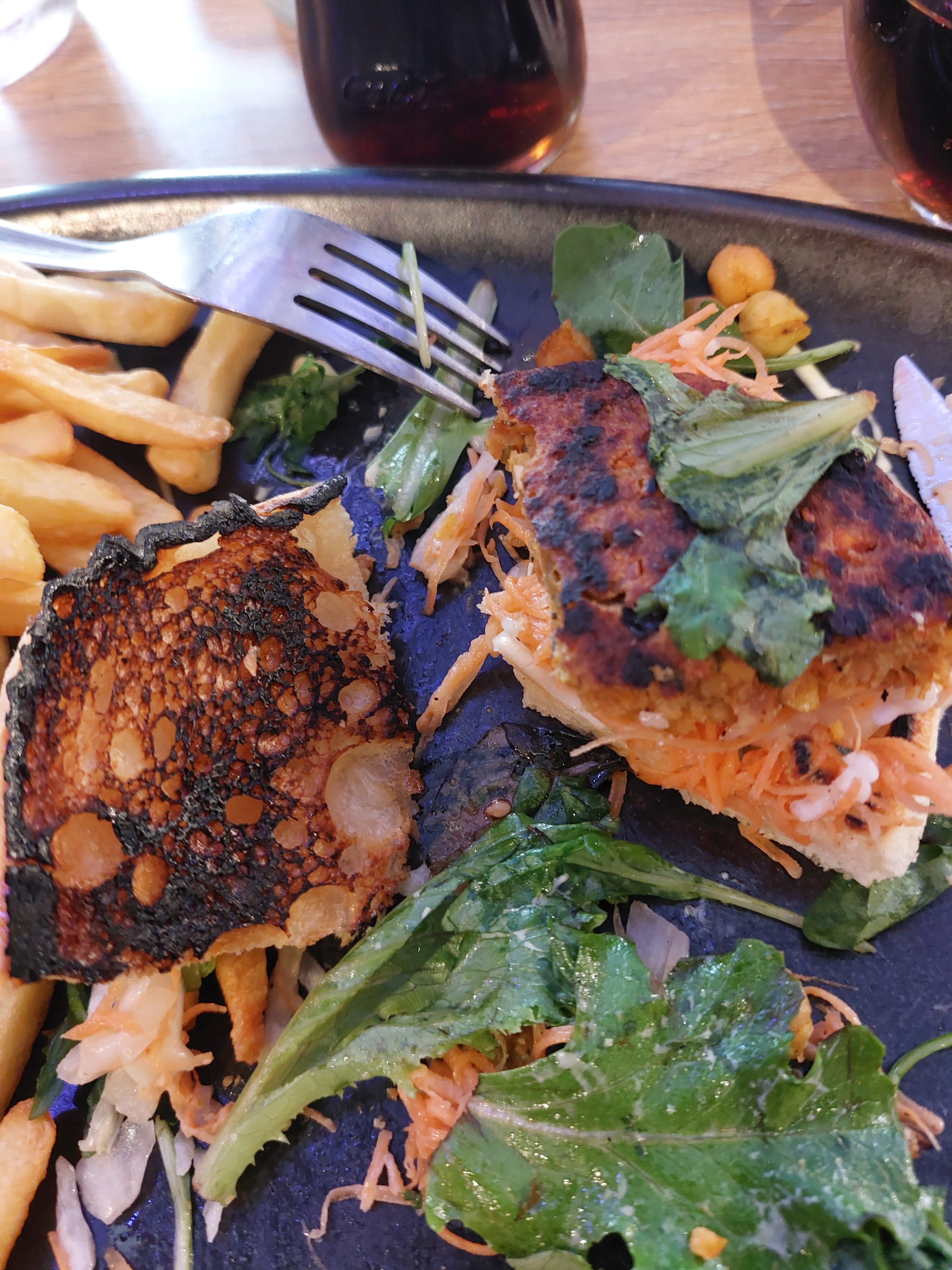 Je note mon plat, j'ai pris un burger vegan le pain était carbonisé. À l'arrivée de mon plat on sentait l'odeur de brûlé. Je ne sais même comment on peut servir un pain dans cet état ! J'ai dû grater la partie brûlée (voir photos)