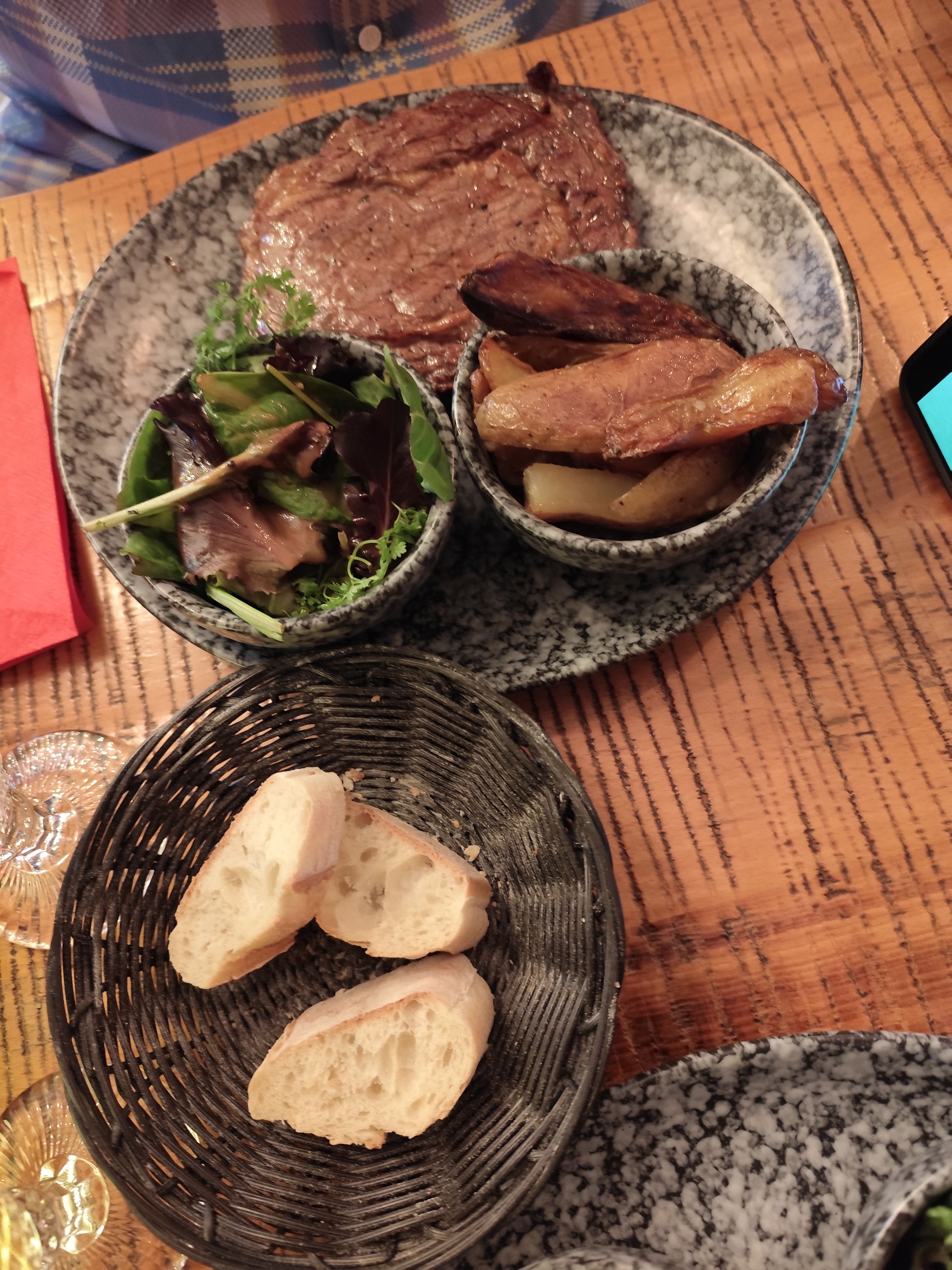 Un steak fantastique sur lequel nous sommes tombés par hasard. Nous étions 2 personnes à avoir commandé 2 entrecôtes accompagnées d'un petit accompagnement. Nous avions une charmante serveuse qui était sympathique avec nous même si nous étions des touristes. Nous avons également commandé un demi-fond de vin rouge et une crème brûlée. Dans l'ensemble, une expérience 5 étoiles.