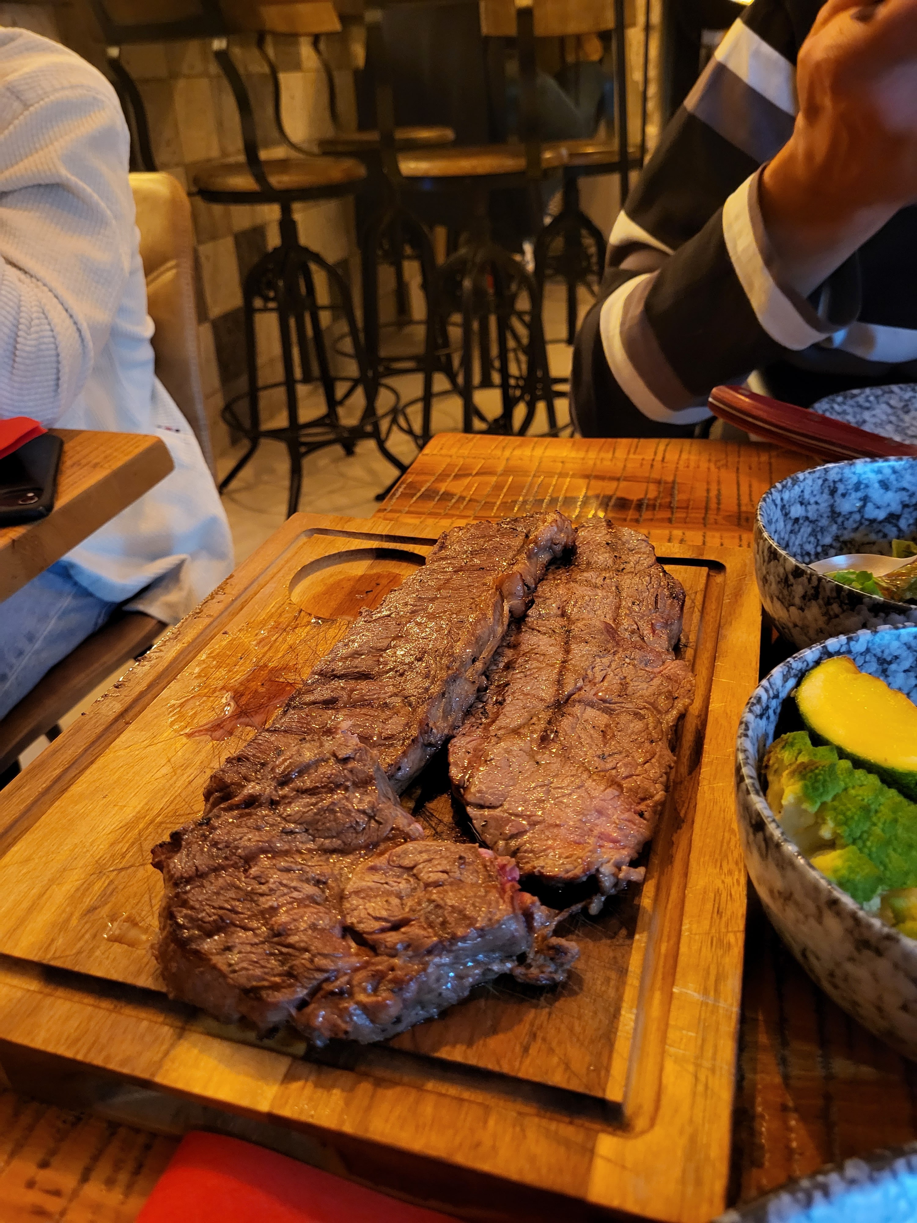 Nous avons eu le faux-filet, le flanc et les côtes. Tout était délicieux et le service était fantastique, dommage que nous n'ayons pas essayé le burger, je suis sûr que c'est génial, ne manquez pas cet endroit, le gros œuf vert est le bon outil