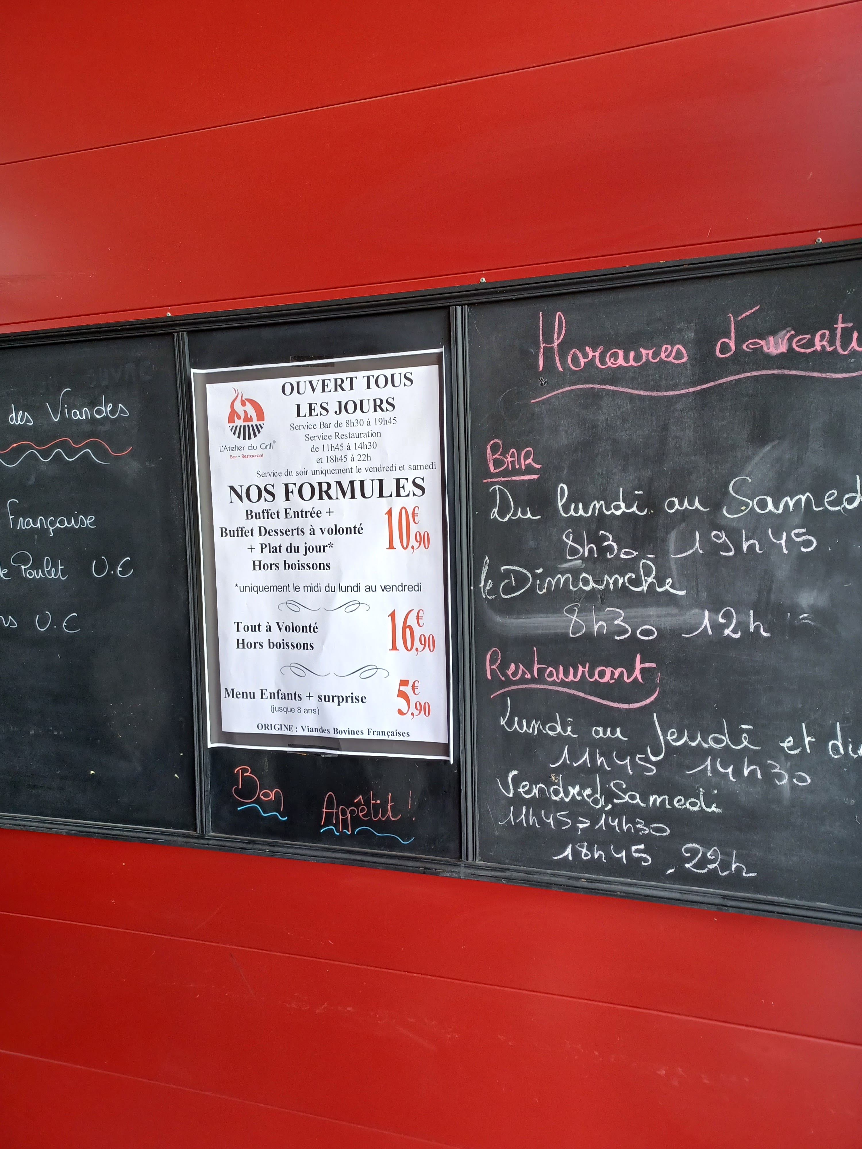 3 fois que l’on vient en 1 mois et pas du tout déçu, j’adore. Le buffet des entrées et desserts sont très simple mais l’attraction principal c’est la viande et grillade à volonté. Un faux filet et une entrecôte pour 16€ cuit à la perfection et délicieuse, vous trouverez ça nul part… Quand je vois les avis de certains j’aimerais leur rappelé que l’atelier du Grill est un restaurant simple, sans fioriture, revenez sur terre et arrêtez de vous prendre pour des critiques gastronomique dans une cantine ou la formule est a 16€. On reviendra c’est certains.