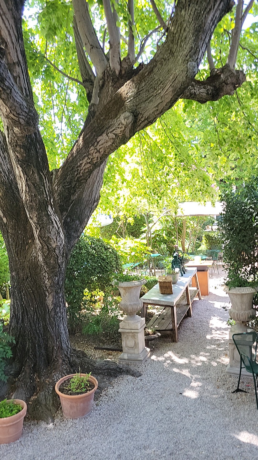 Un joli jardin ombragé, une terrasse avec quelques tables en fer. Malgré la fréquentation importante en ce jour de marché, le service est efficace et professionnel. La cuisine est généreuse : aioli provencal, thon mi cuit, et la mousse au chocolat est tout simplement fabuleuse. Le tout servi depuis une toute petite cuisine : impressionnant.