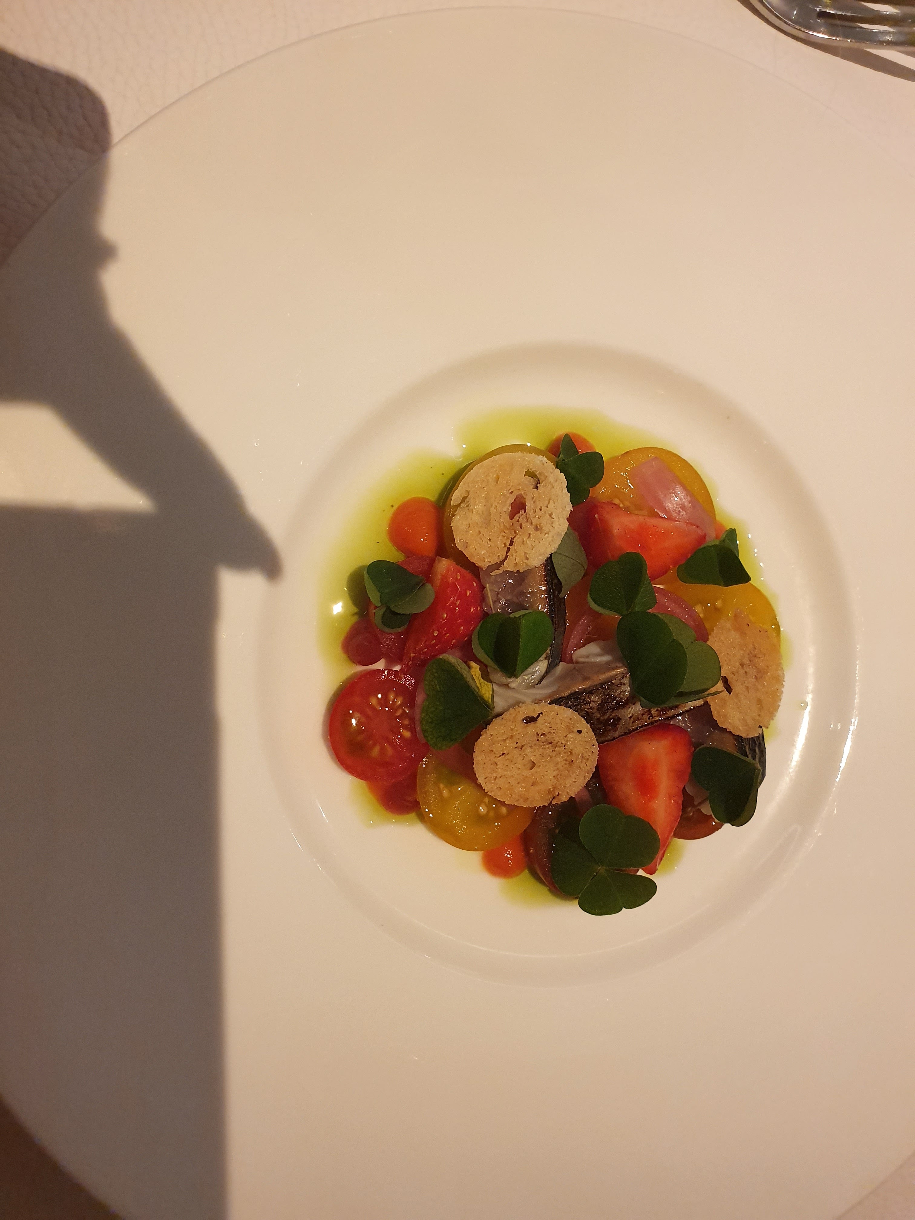 belles couleurs et bel assemblage de goûts mais portions vraiment congrues et surtout l'eau du robinet gazéifiée façon Sodastream et facturée 4 euros (!); attention aussi aux fautes d'orthographe sur la carte, c'est un peu dommage pour un restaurant étoilé.