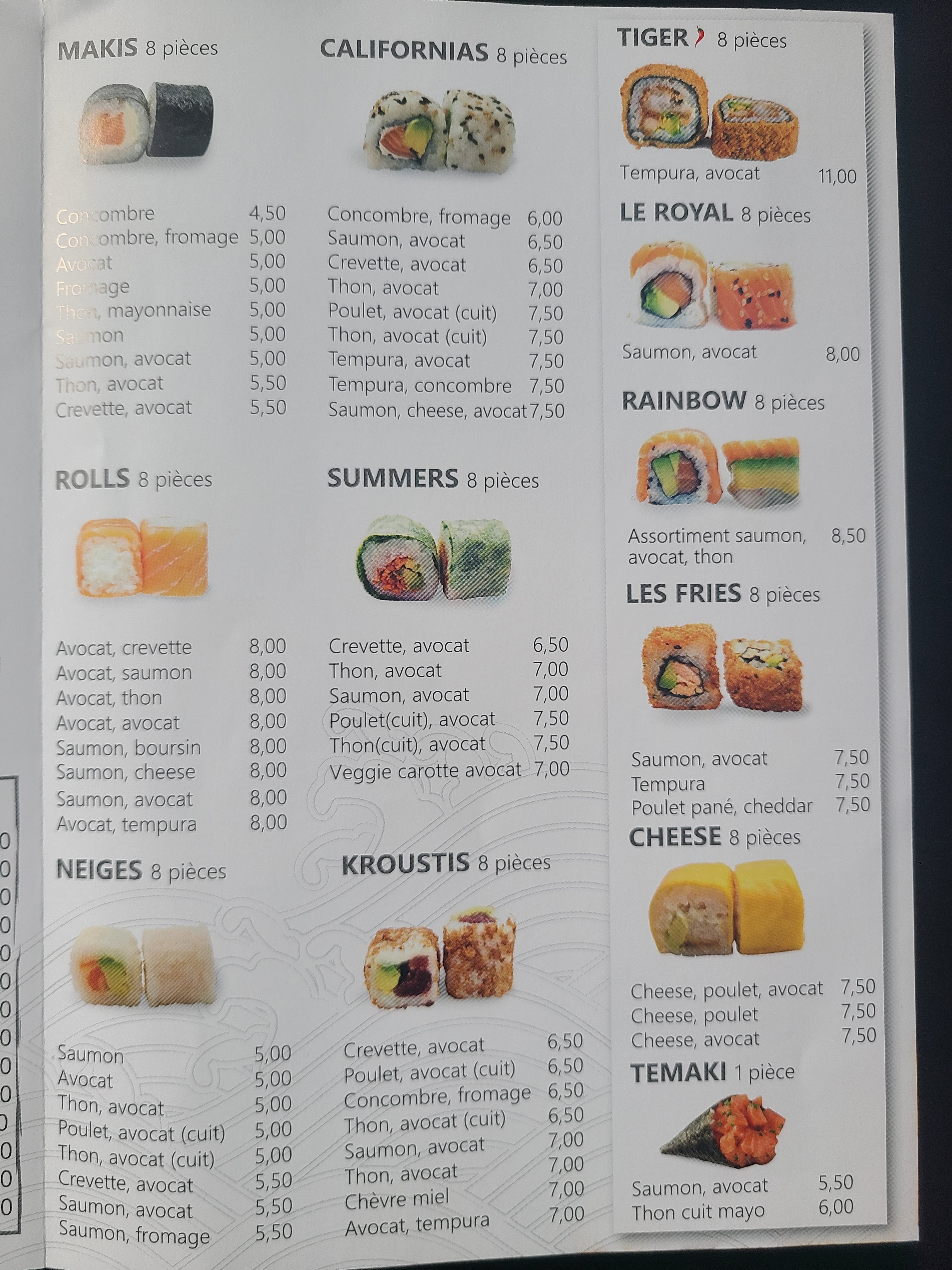 De bons produits frais, sushis, makis, californias, nems poulet, brochette boeuf/fromage, brochettes poulet, etc... la salle est plutôt grande pour ceux qui souhaitent manger sur place, un accueil très sympathique. J'y retournerais avec plaisir.