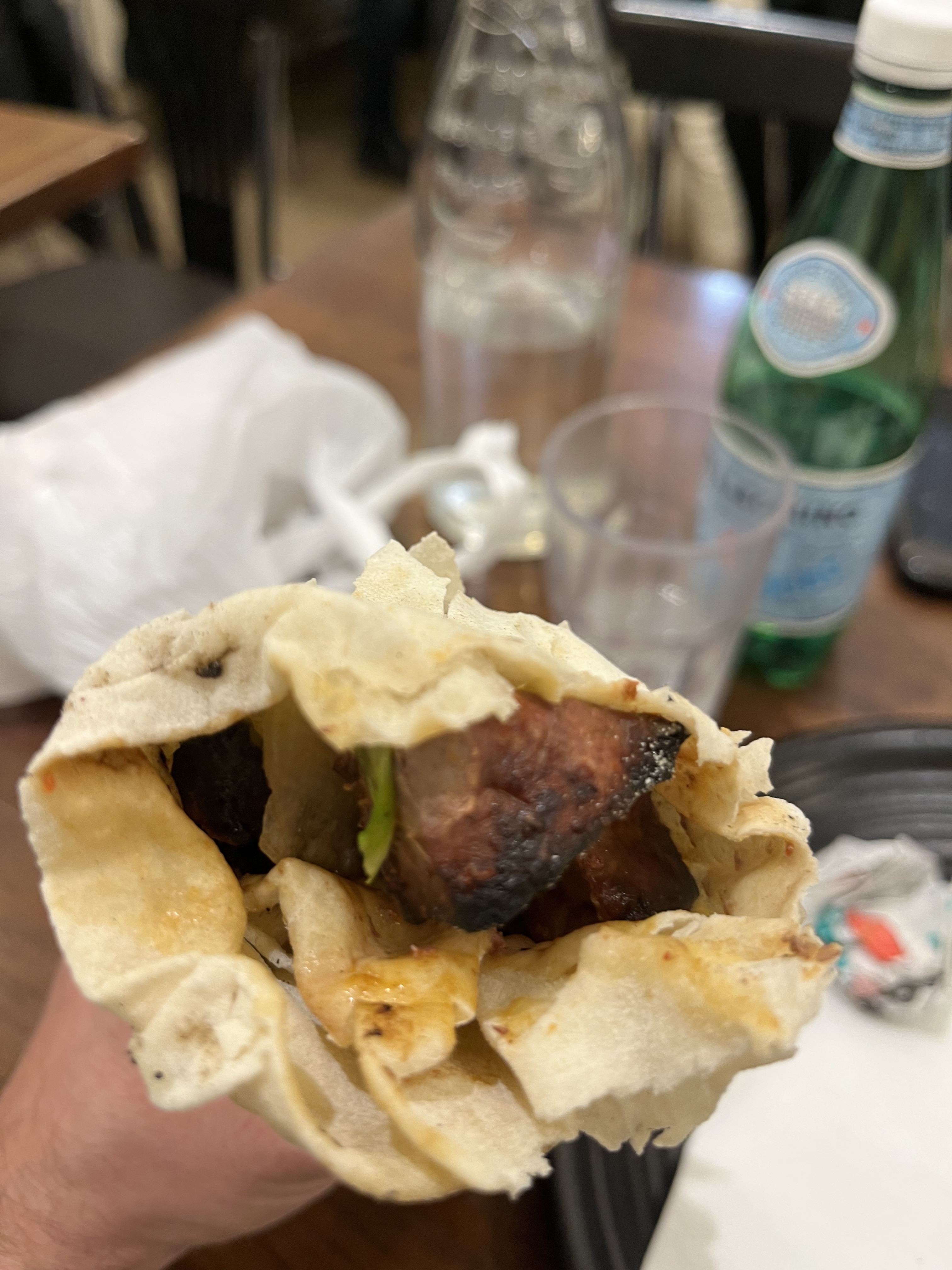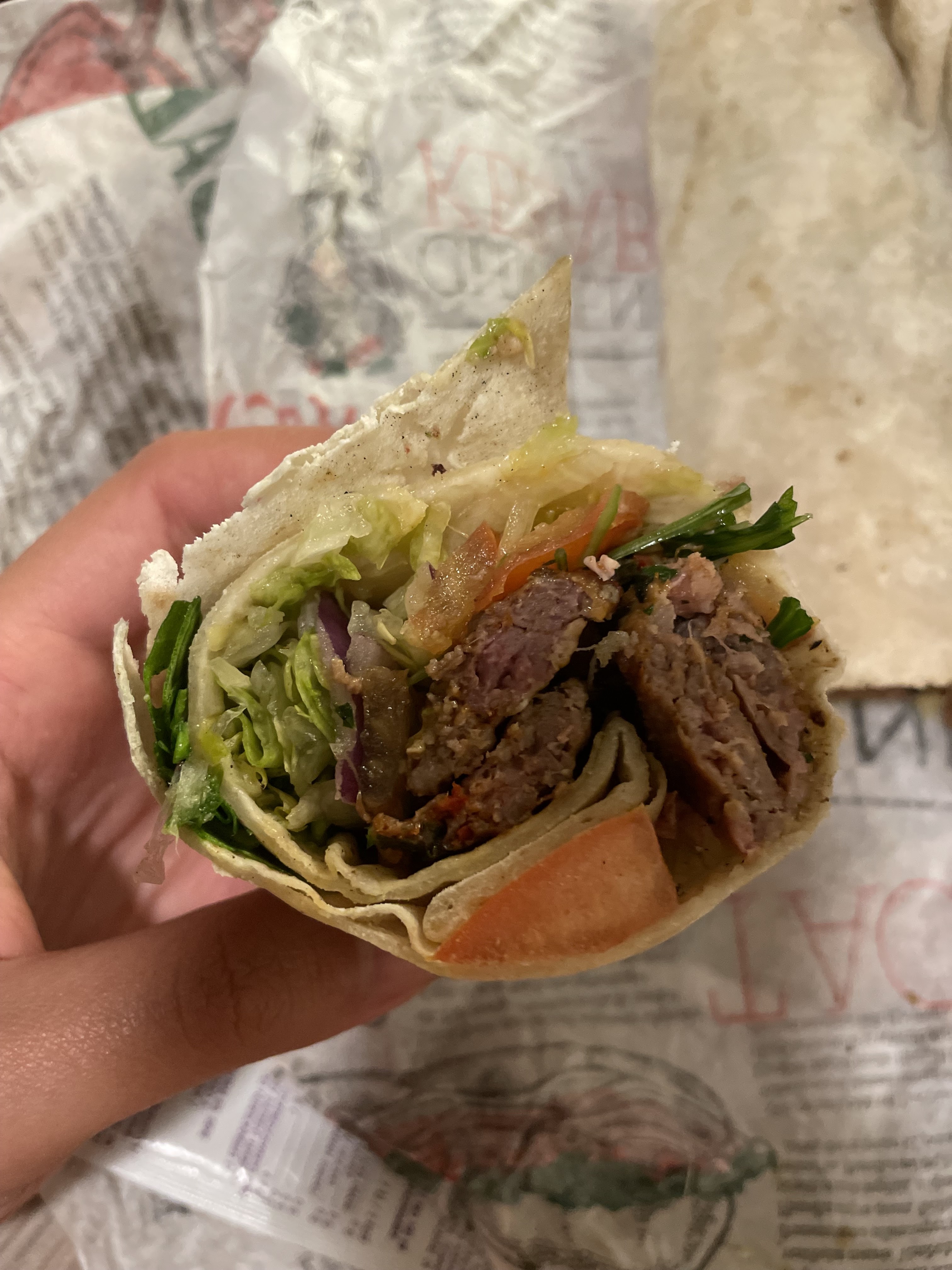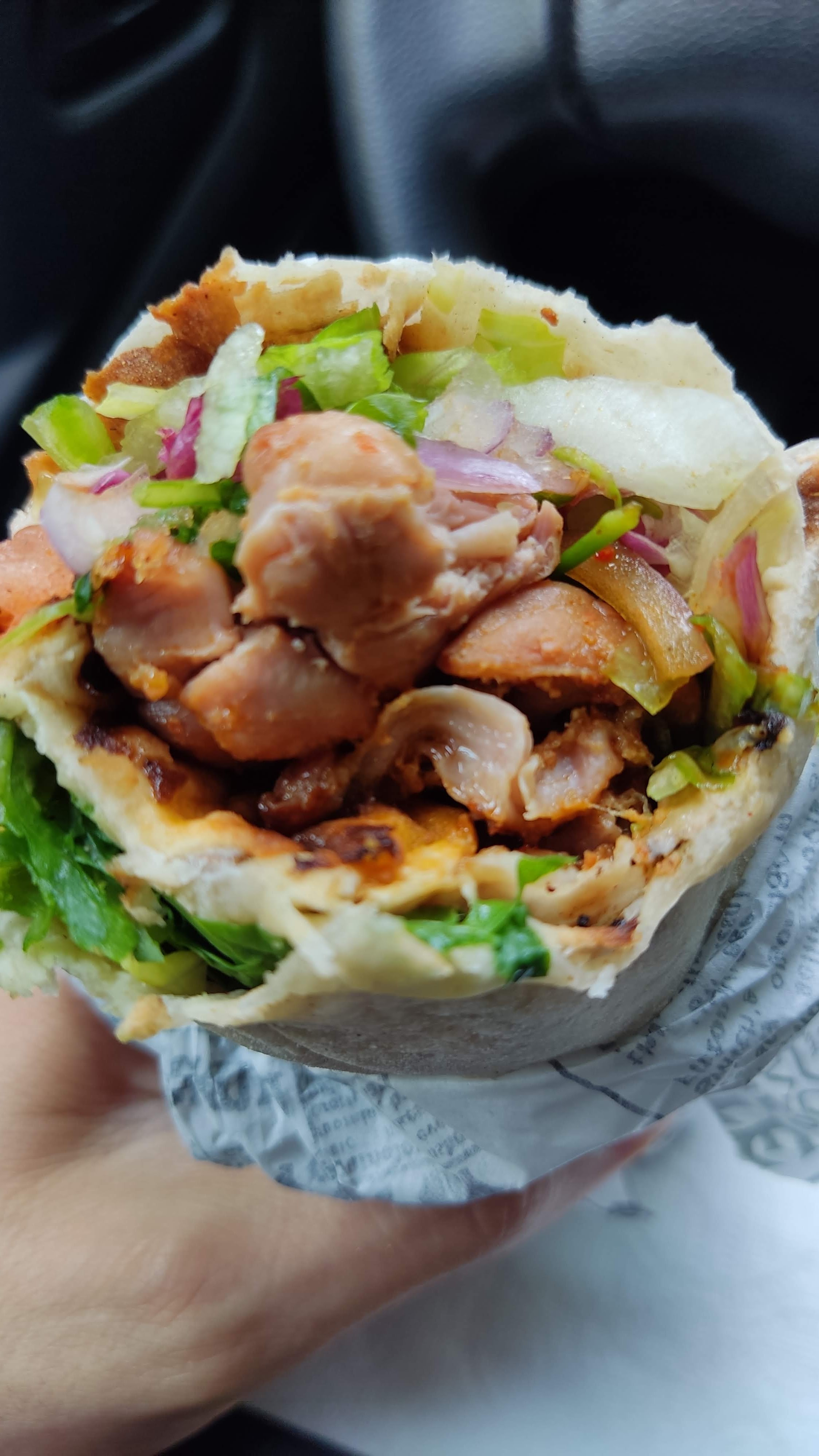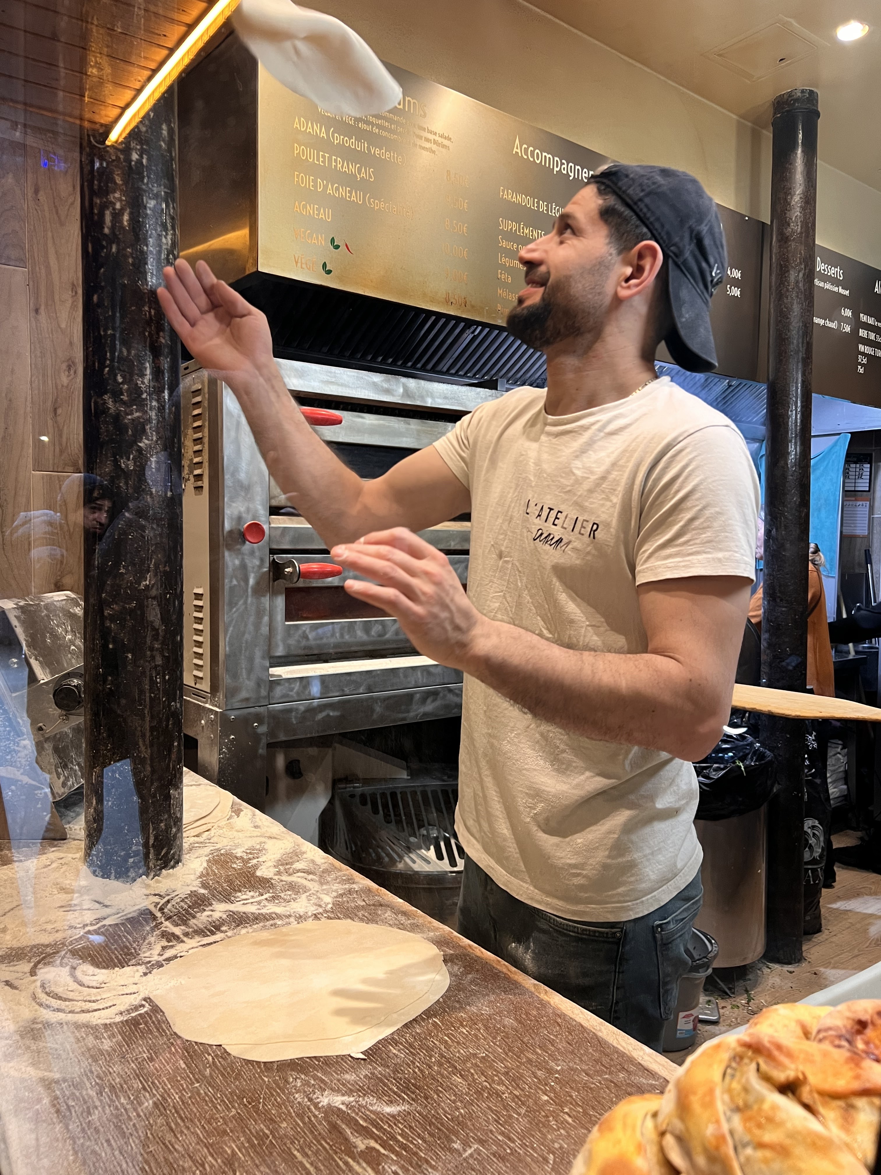 Un durum parfaitement exécuté sans trop d’attente. Le pain est fait sur place sous vos yeux, il cuit pendant que les brochettes grillés au feu de bois. C’est un délice. Le prix un peu cher et on sort avec un peu faim. Il y a également une salle pour manger sur place.