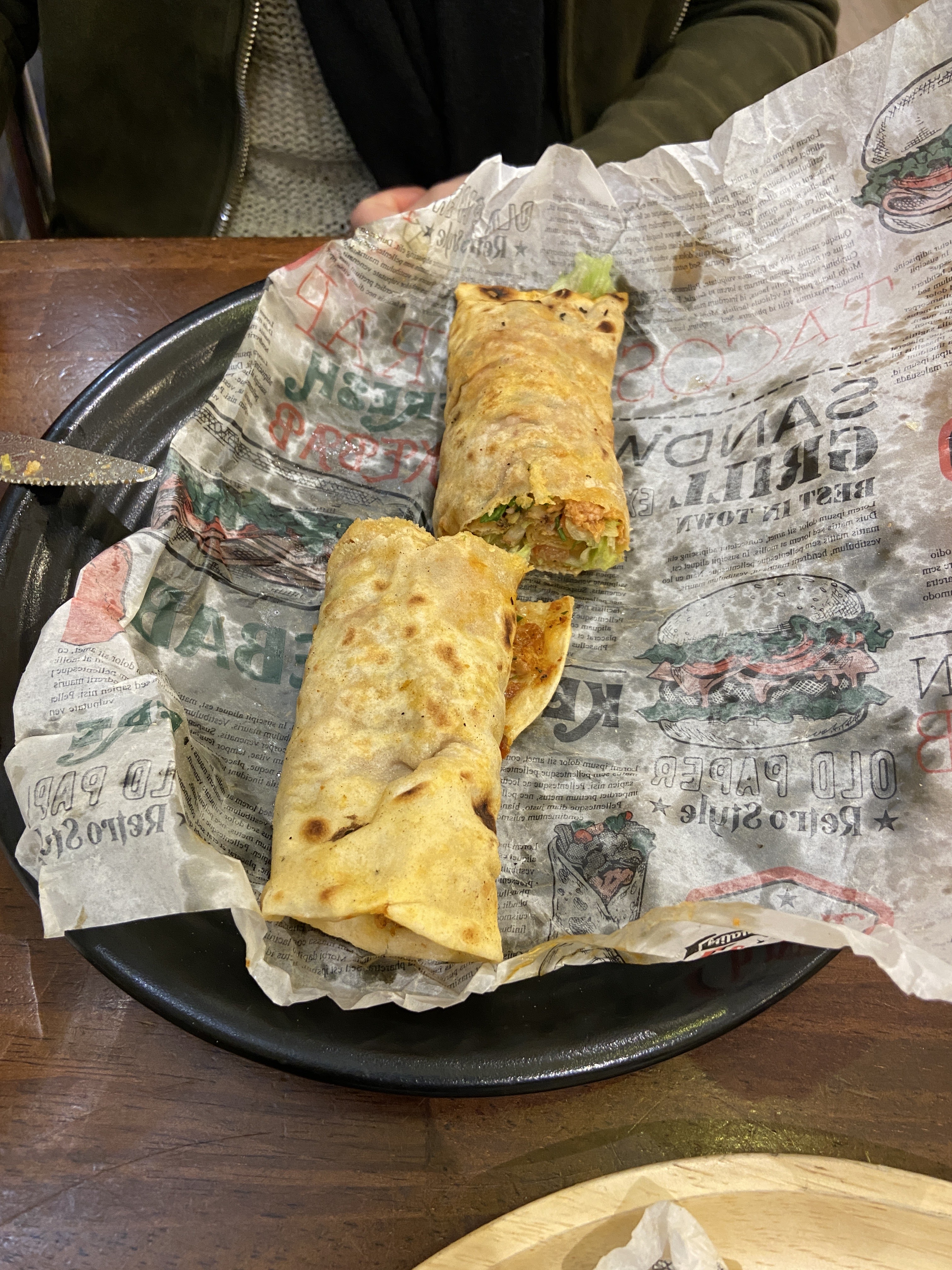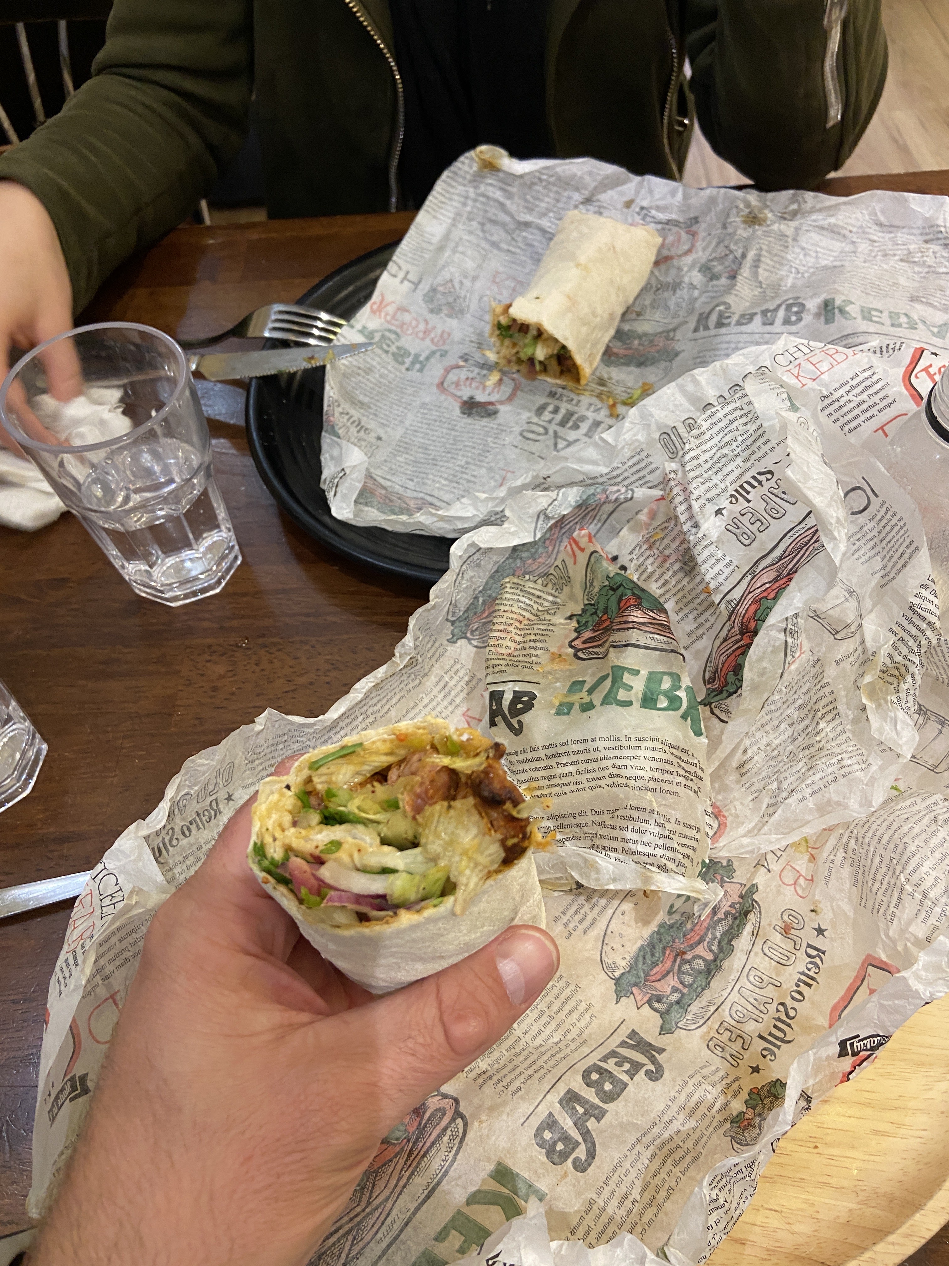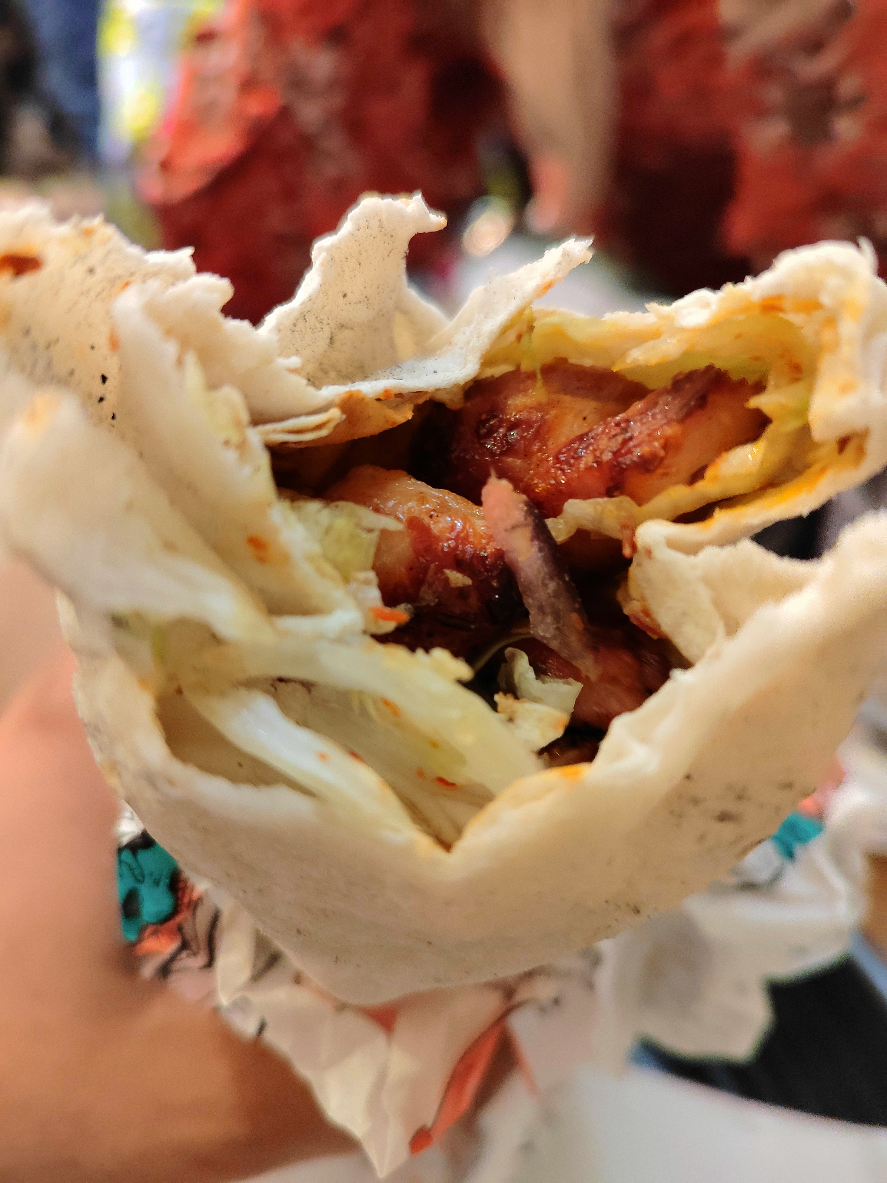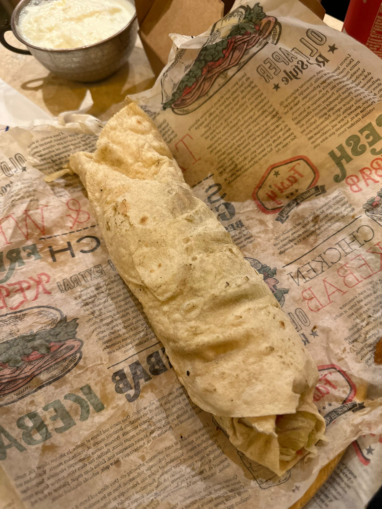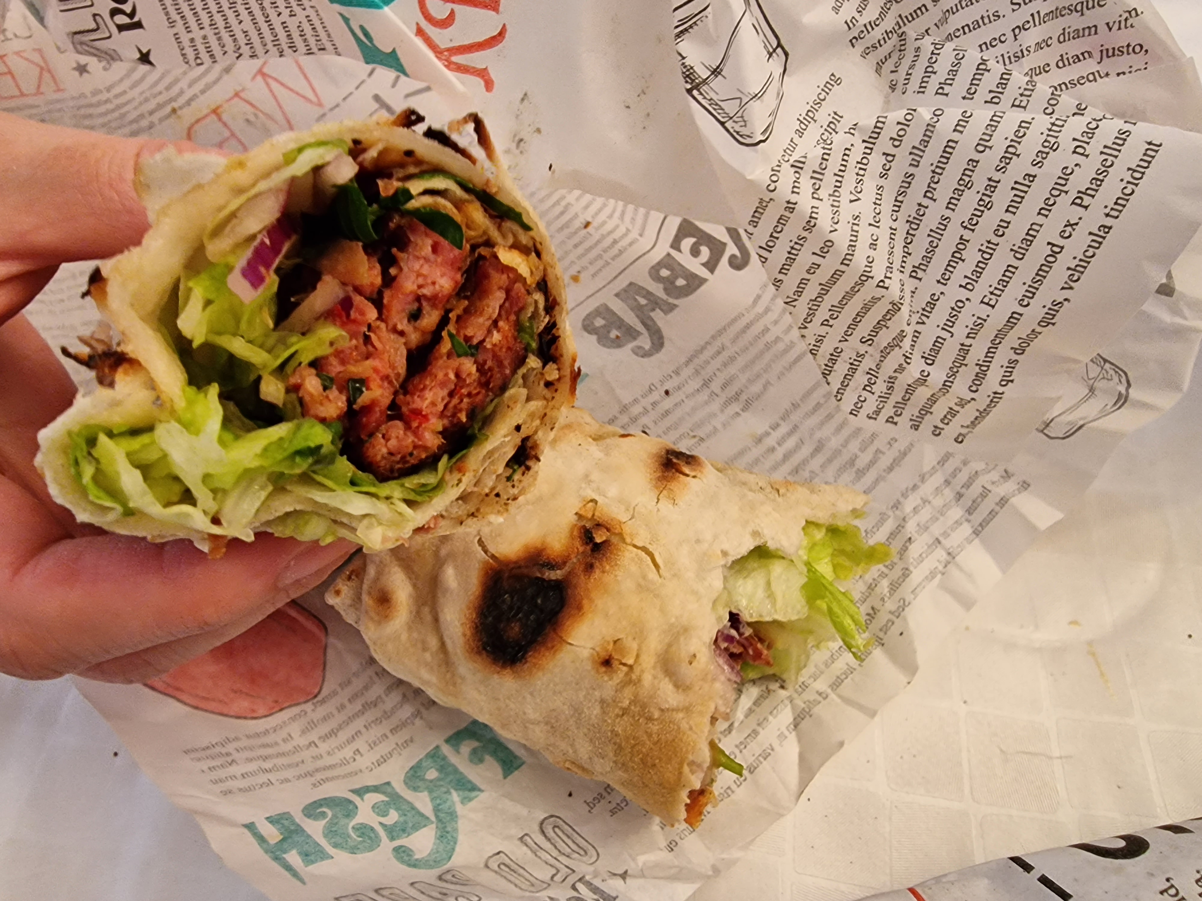 Un durum parfaitement exécuté sans trop d’attente. Le pain est fait sur place sous vos yeux, il cuit pendant que les brochettes grillés au feu de bois. C’est un délice. Le prix un peu cher et on sort avec un peu faim. Il y a également une salle pour manger sur place.