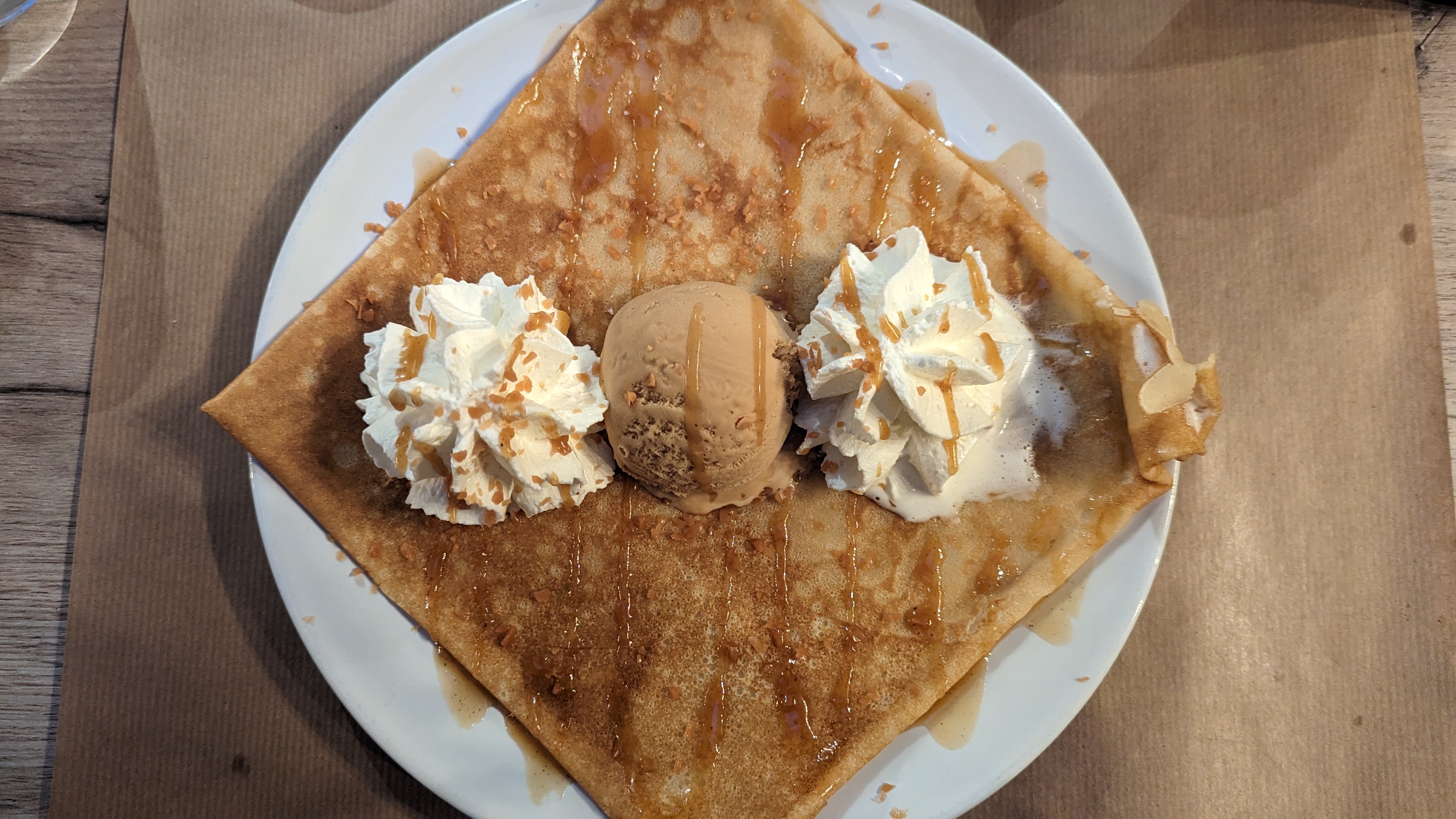 les crepes etaient tres bonnes et la patronne tres acceuillante et commercante. J'ai pris une crepe a la saucisse Kemene et une crepe aux marrons et l'autre personne une crepe complete et une crepe tatin. Je recommande cette creperie.