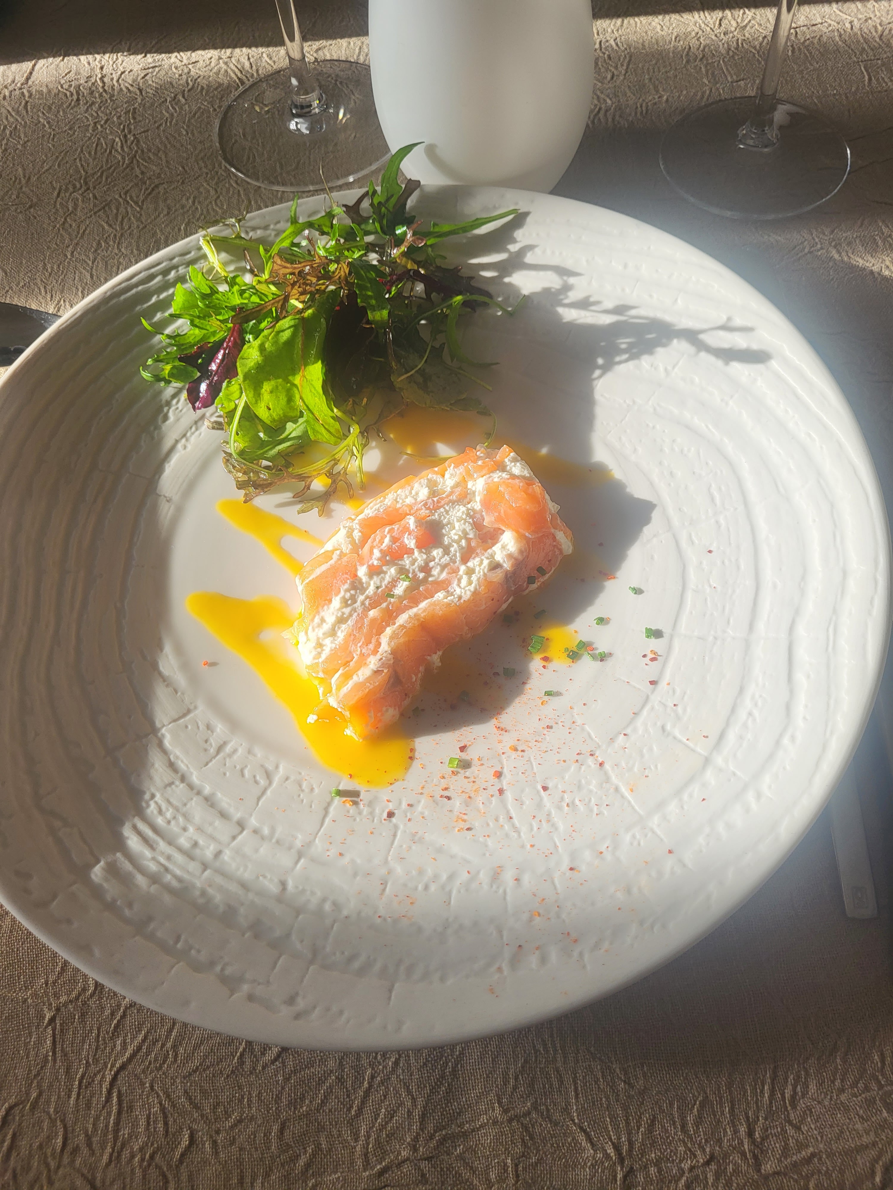 Diner en terrasse en duo. Très bel endroit, agréable. Un excellent accueil attentionné tout en restant discret. Un repas de bonne qualité qui pourrait être peut etre encore plus pétillant.