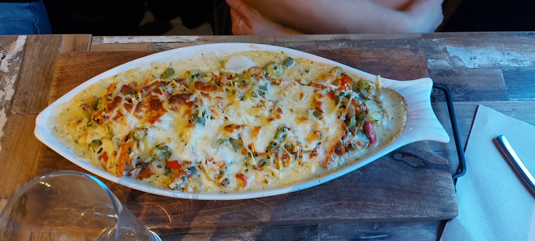 Le cadre est sympa et les serveuses sont très bien. Par contre en ce qui concerne ce que nous avons mangé.... j'ai pris un camembert choisi avec comme ingrédients poulet et champignons, j'ai demandé à mettre des oignons dedans mais on m'a répondu qu il n'y, en avait pas... Bref ce n'était pas trop grave. Mais lorsque j'ai découvert mon plat à la première bouchée grosse déception. Mon camambert a été mélangé avec une tonne de crème du coup plus aucun goût de fromage et ensuite lorsque je découvre ce qu'il appelle du poulet je me retrouve avec ce qu'on trouve sous vide en émincé tout préparé !!! En ce qui concerne mon conjoint sa flammekuche était sympa mais c'était pas la. Folie.. J'avais entendu beaucoup de bien de ce restaurant mais je le déconseille fortement..