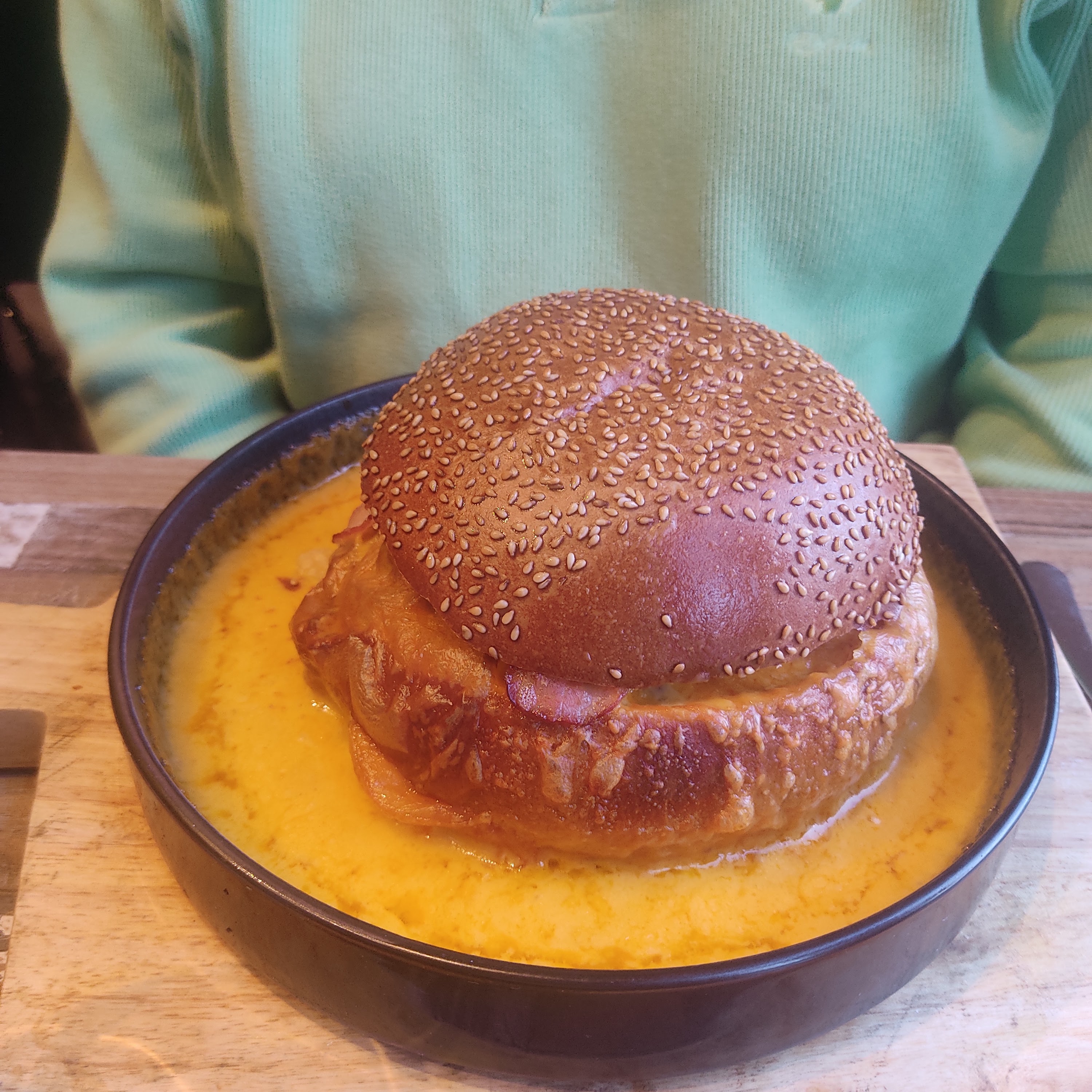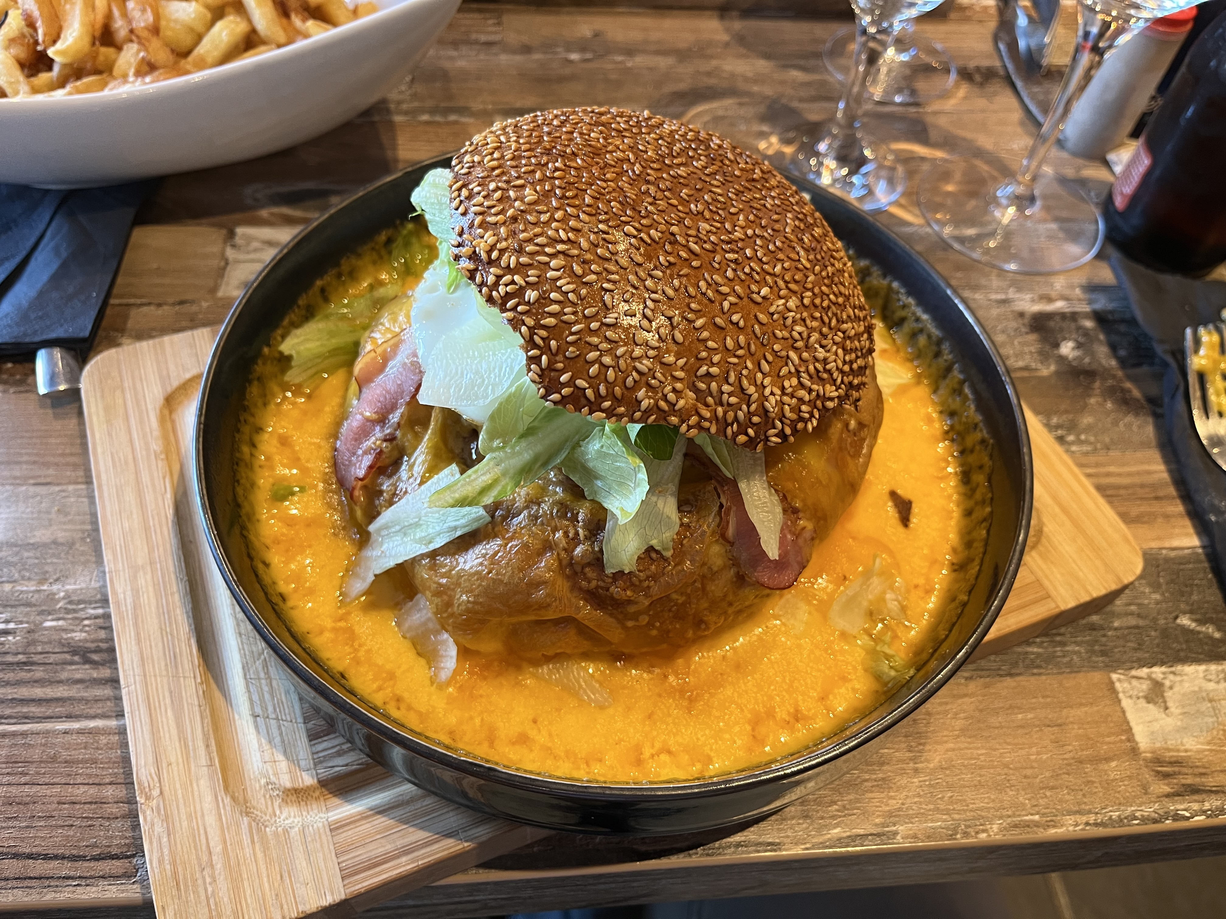 Franchement, pas terrible...un burger pour 16.90 euros se composant de 3 malheureux steaks hachés très fins et de pain très sec, j'avais demandé en plus du steak, des tomates et du fromage, rien de plus, j'ai cherché les tomates, n'ayant pas pris beaucoup d'ingrédients ils auraient pu mettre plus de tomates... C'est gras et lourd ! Le dessert un moelleux au chocolat avec cœur praliné...Je m'attendais à du chocolat à l'intérieur...Bref, addition plat, dessert et une 1/2 Vitel, 27 euros !! Et ce n'est pas bon ! Et à ce prix vous avez un menu dans un bon restaurant gastro sur Calais ! Je n'y retournerai pas ! Trop cher et bof !