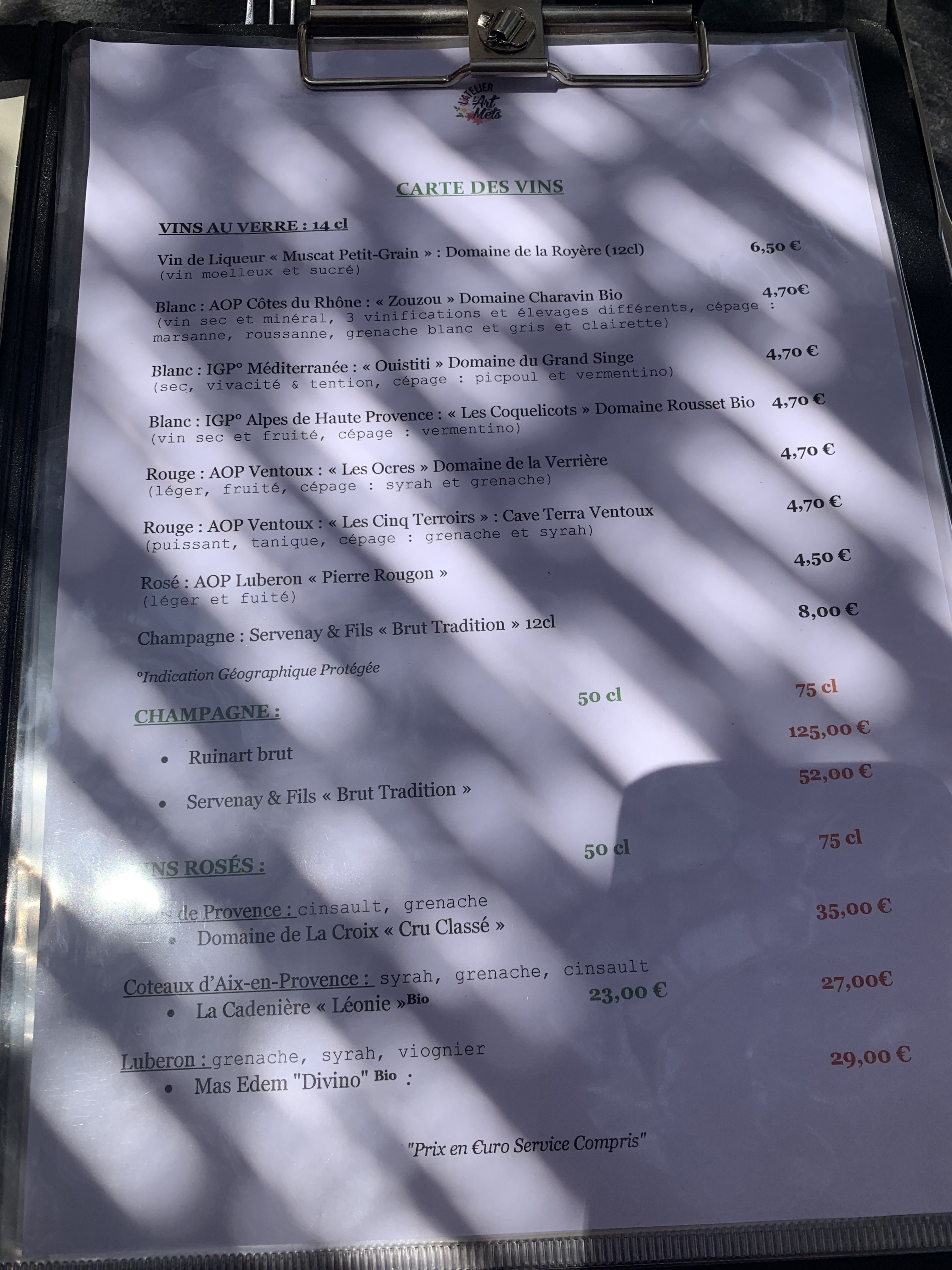 On choisit juste le nombre de plats puis surprise ! Peu de chance d'être déçu car en plus d'être frais, local et de saison les plats sont originaux et admirablement préparés du début à la fin Une adresse à découvrir dans ce coin du Luberon !