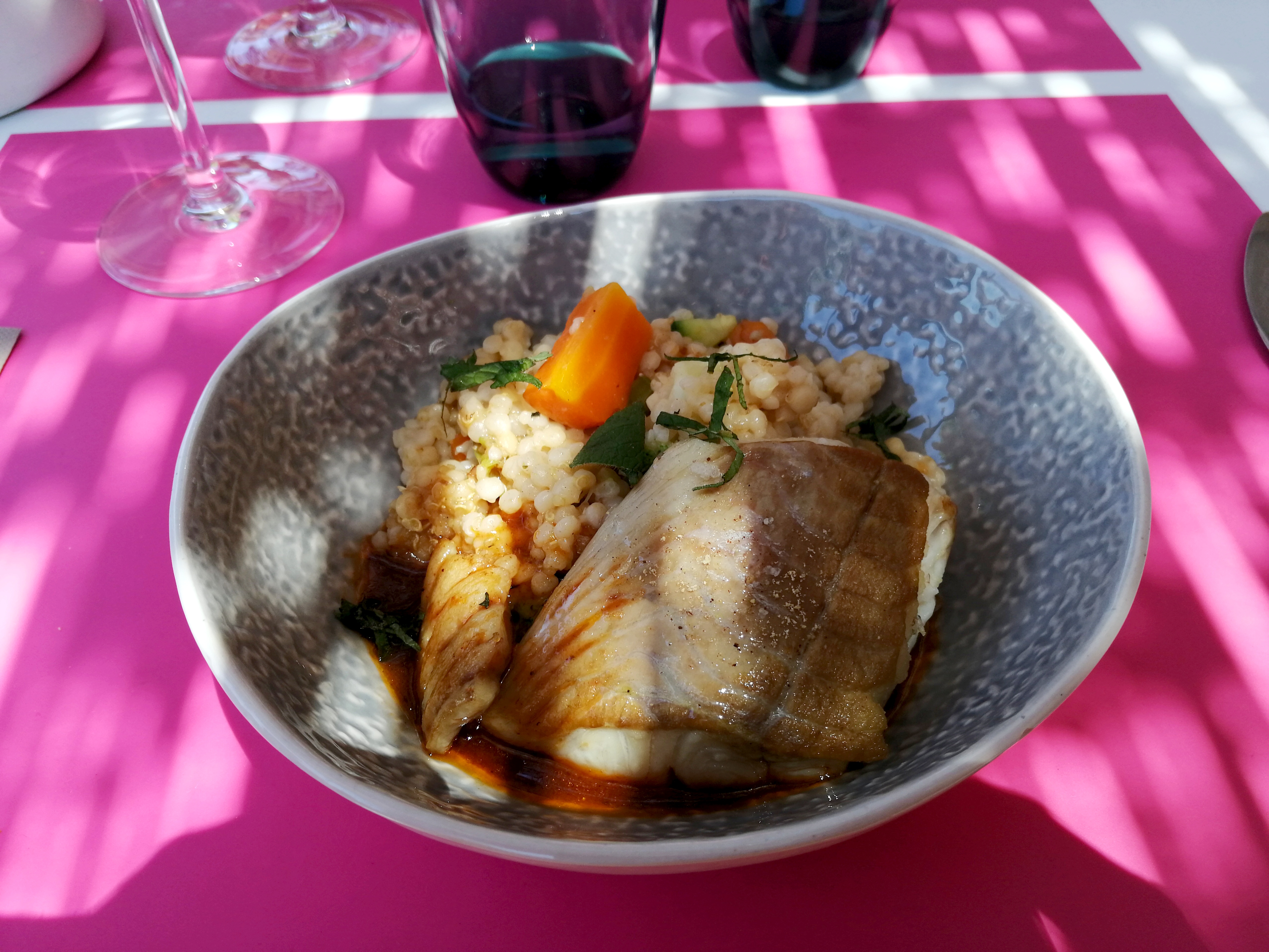 Conseillé par un restaurant de Cavaillon et après avoir fait du click and collect, nous avons pu aller déjeuner en terrasse pour la fête des mères. Le menu le florilège était à la hauteur de nos espérances avec en prime un beau soleil provençal.