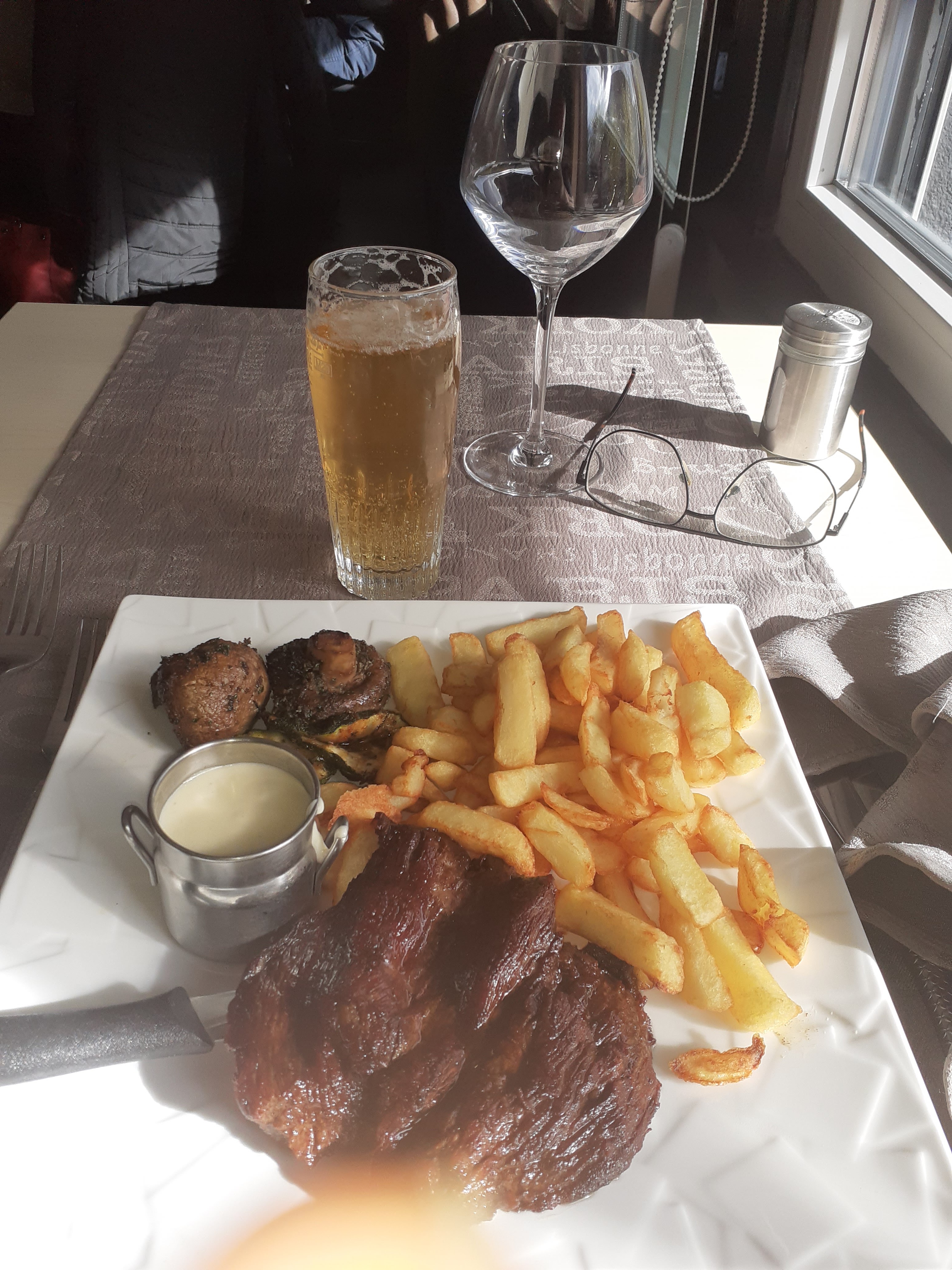 Attente un peu longue avant de pouvoir choisir nos boissons (je reste persuadé que tous les restaurants devraient demander dans les 5 min de l’installation du client) Choix trop pauvre en bières (3 pressions et pas de canette) et prix excessif (5,50€ la 25cl de triple Karmeliet) Site internet pas à jour car pas de menu proposé Pour le reste du repas, c’est copieux et excellent !