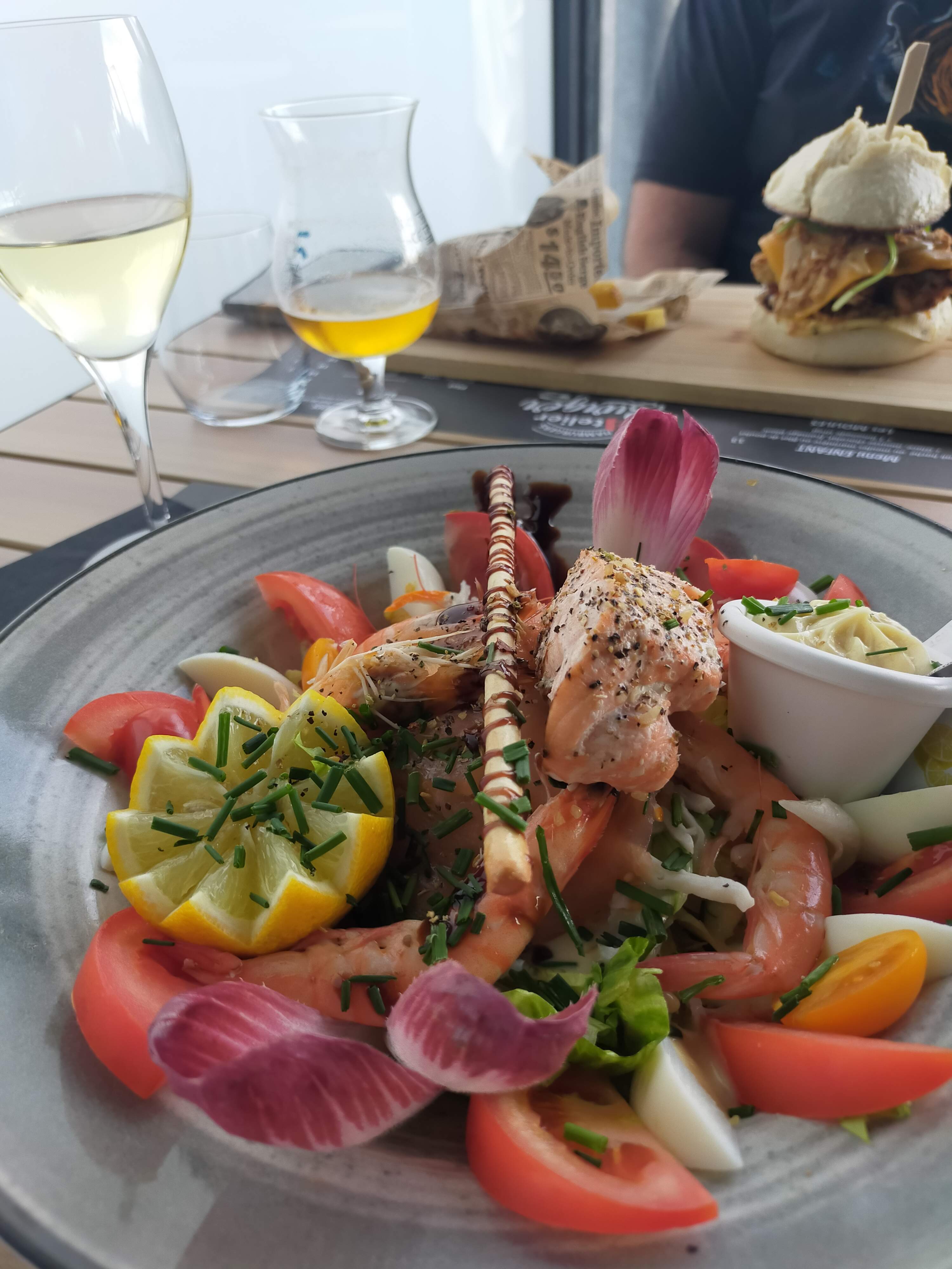 Dommage !dimanche soir il n'y avait plus de moules.ça peut arriver donc j'ai pris une salade: servie trop froide rapport qualité prix à vous de vous faire votre avis 17,50€ pour de la salade iceberg des tomates blanche sans goût des œufs durs ( plein-air ?!?)du saumon fumé et du saumon cuit de la sauce ( blanche). La personne au service est très souriante et sympathique. En réponse à votre réponse où sont les gambas ? Heureusement que la personne en salle est très aimable.